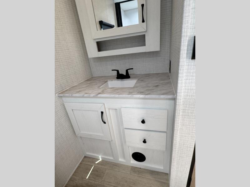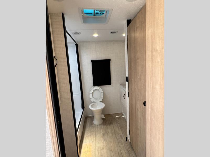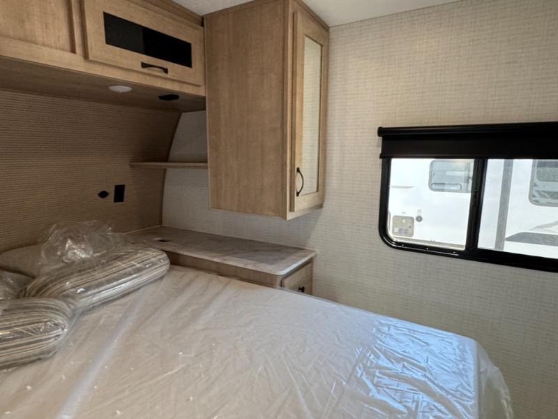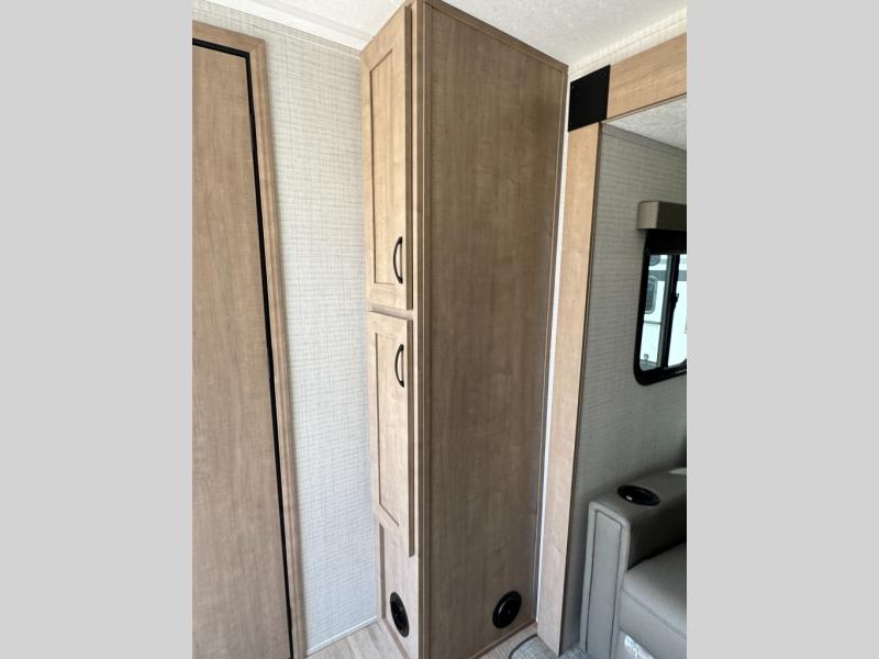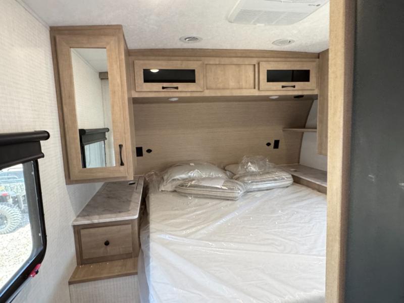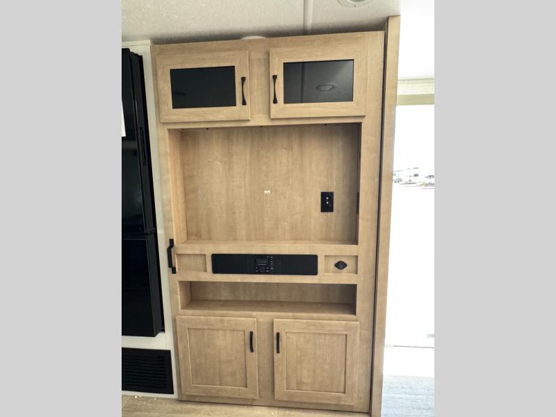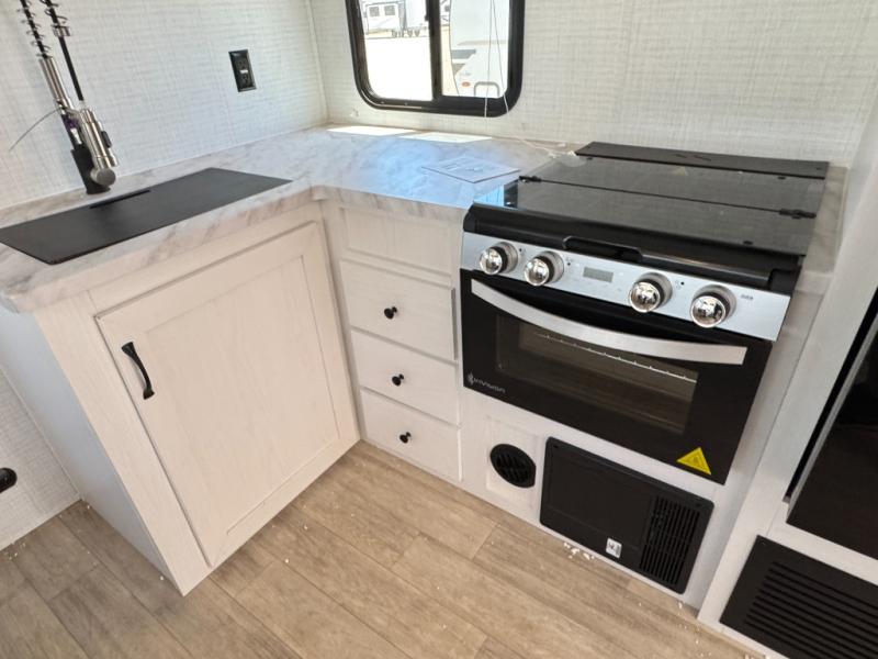 The large slide out in this trailer offers seating and sleeping space on a sofa sleeper and a booth dinette plus adds more floor space to the main living and kitchen area. The rear full bathroom has a 30" x 48" shower with a seat and a linen closet for towels and such, and the front bedroom includes a queen bed and clothing storage plus windows for views of your campsite. The cook will have the choice of making meals inside with full amenities including an 11 cu. ft. refrigerator and an L-shaped counter or outdoors on the outside kitchen. The 21' power awning provides an outdoor living area protected from the elements, and the exterior offers a drop frame pass-thru for ample storage space!