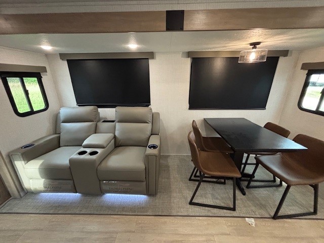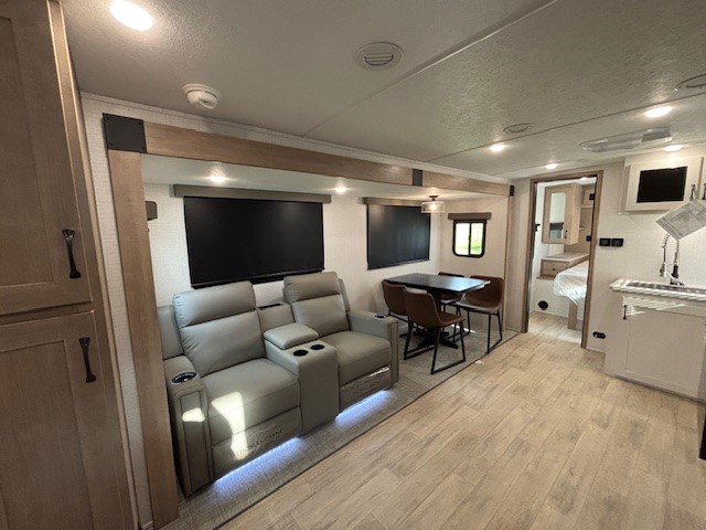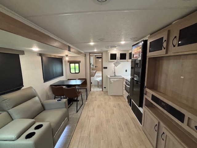 The large slide out in this trailer offers seating and sleeping space on a sofa sleeper and a booth dinette plus adds more floor space to the main living and kitchen area. The rear full bathroom has a 30" x 48" shower with a seat and a linen closet for towels and such, and the front bedroom includes a queen bed and clothing storage plus windows for views of your campsite. The cook will have the choice of making meals inside with full amenities including an 11 cu. ft. refrigerator and an L-shaped counter or outdoors on the outside kitchen. The 21' power awning provides an outdoor living area protected from the elements, and the exterior offers a drop frame pass-thru for ample storage space!