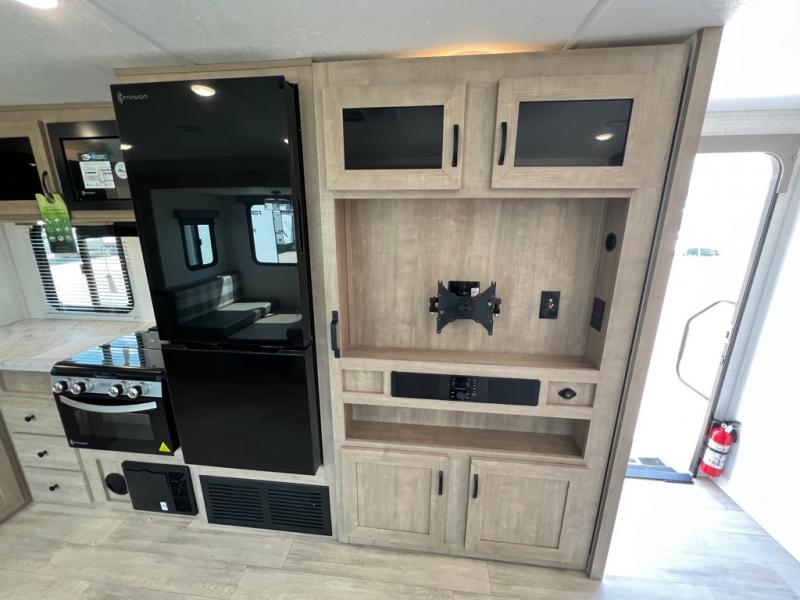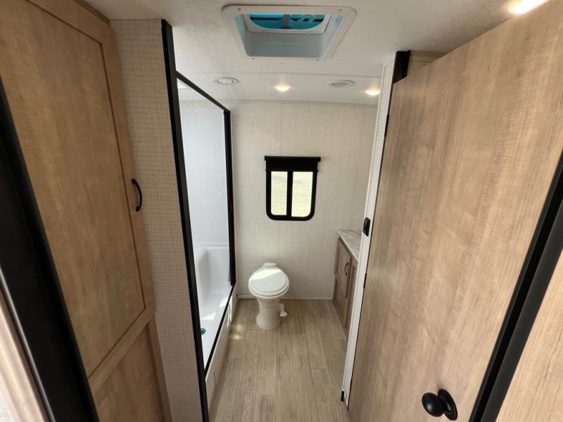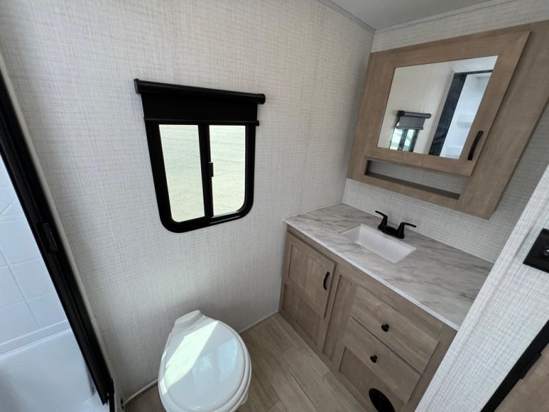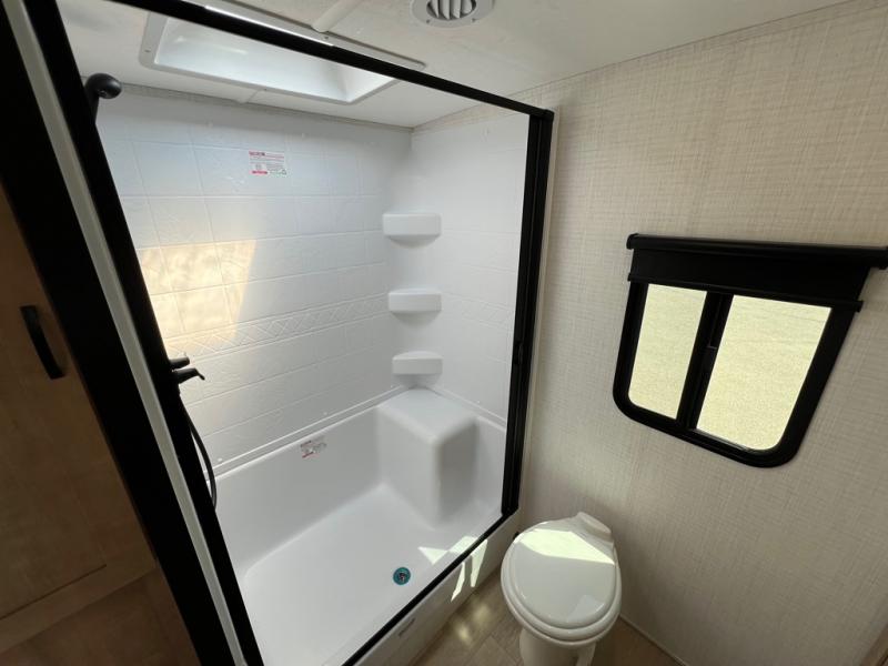 The large slide out in this trailer offers seating and sleeping space on a sofa sleeper and a booth dinette plus adds more floor space to the main living and kitchen area. The rear full bathroom has a 30" x 48" shower with a seat and a linen closet for towels and such, and the front bedroom includes a queen bed and clothing storage plus windows for views of your campsite. The cook will have the choice of making meals inside with full amenities including an 11 cu. ft. refrigerator and an L-shaped counter or outdoors on the outside kitchen. The 21' power awning provides an outdoor living area protected from the elements, and the exterior offers a drop frame pass-thru for ample storage space!