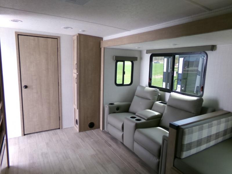 33' front-bed travel trailer with mid-kitchen, rear bath, slide-out living, & 200W solar—perfect for Michigan couples or small families.
