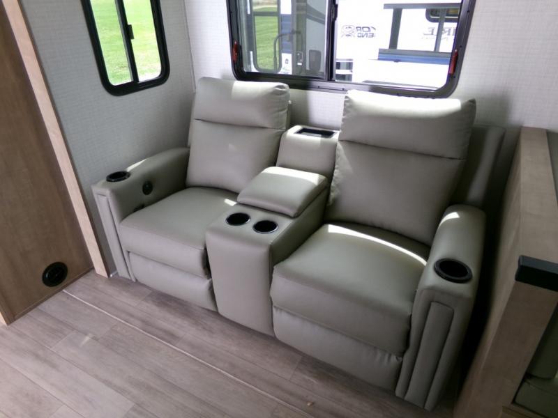 - Extras: Power tongue jack, theater seating or sofa sleeper, rear bath with skylight, 200W solar panel