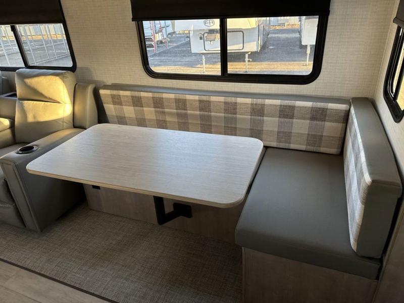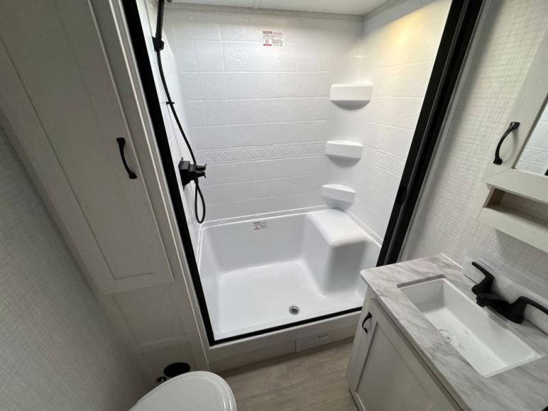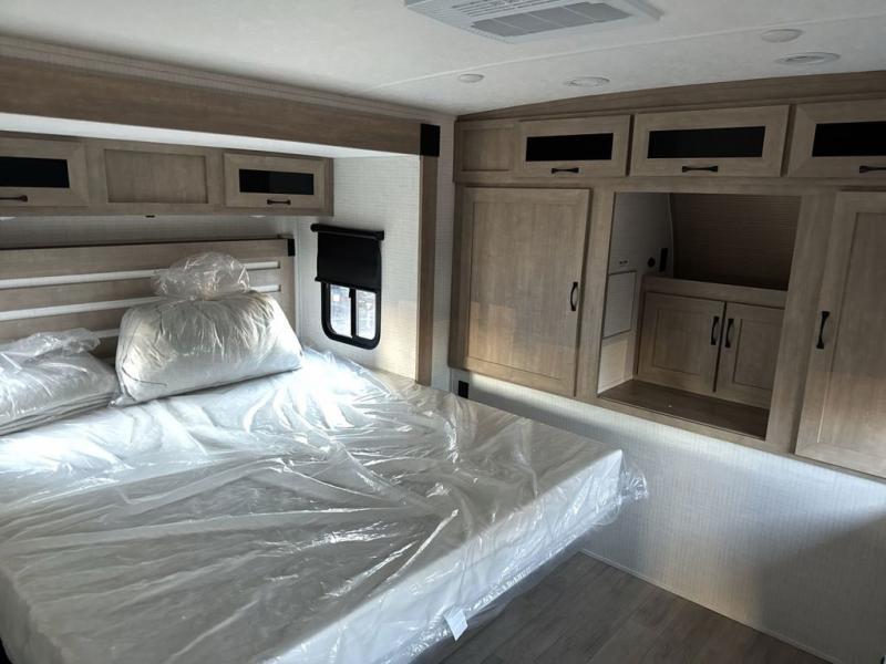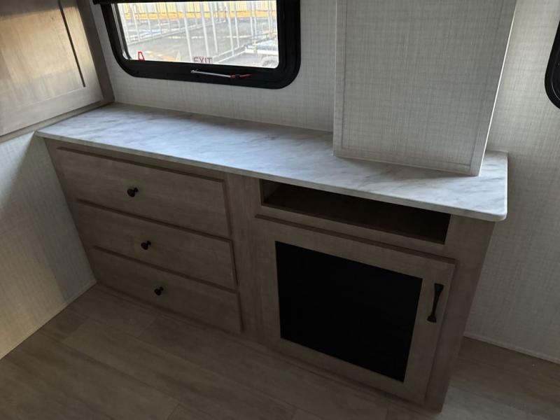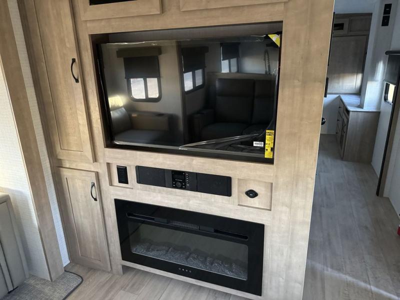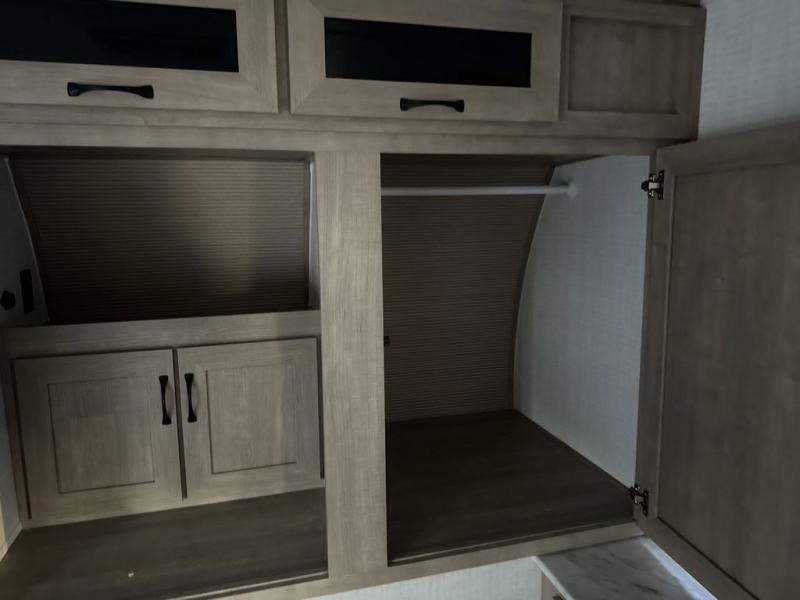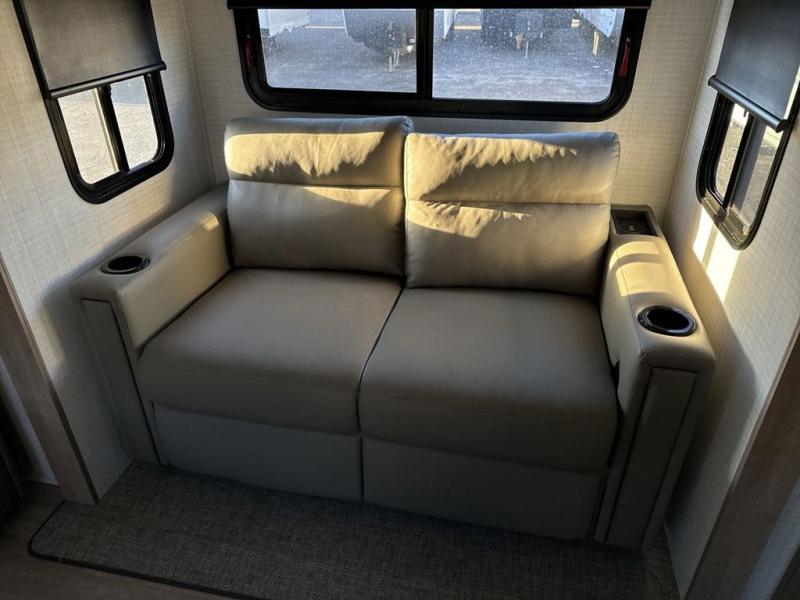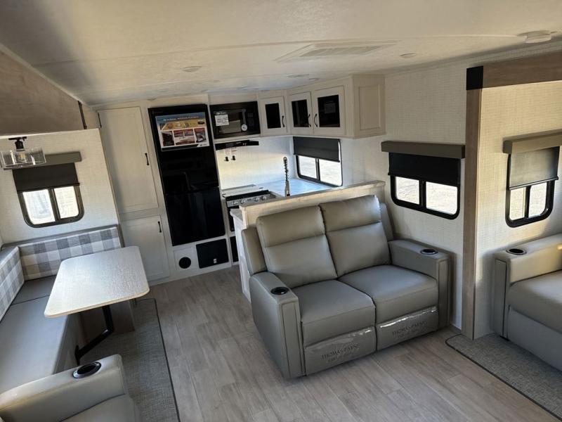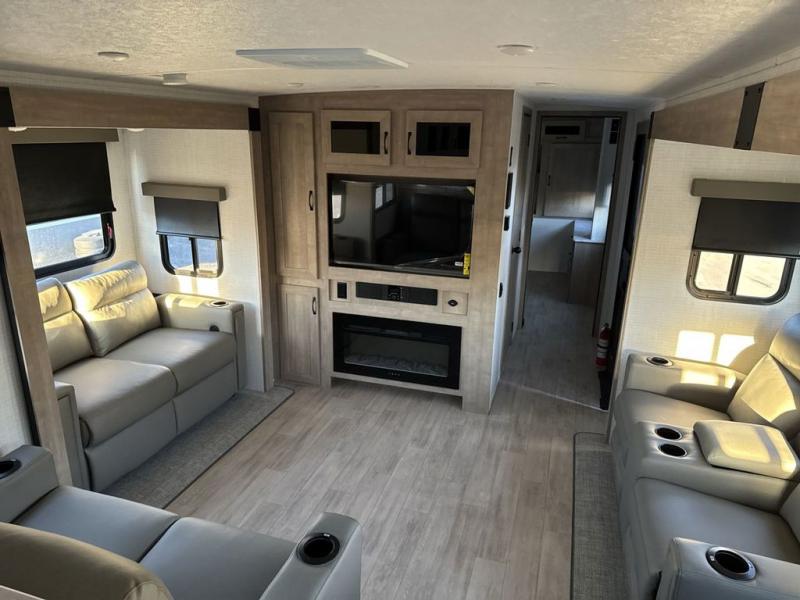 One look at this spacious travel trailer and you'll be sold! The rear kitchen features a U-shaped counter, an 11 cu. ft. refrigerator, plus a pantry for dry goods and snacks. There is a 1/2 dinette with bench seating, plus a tri-fold sofa and two theater seats. Everyone can take turns cleaning up in the full bath that includes a shower with a seat, then head outdoors to relax under the patio awnings with LED lights. When it's time for bed, you will enjoy the king bed slide out in the front bedroom. You'll also find a dresser and a closet here, plus a wardrobe with washer and dryer prep if you choose to add those appliances!