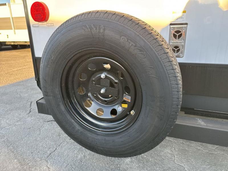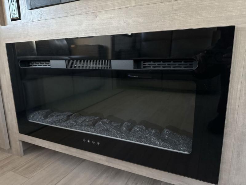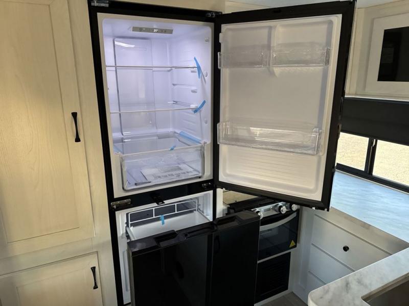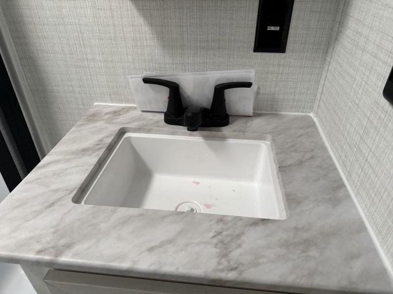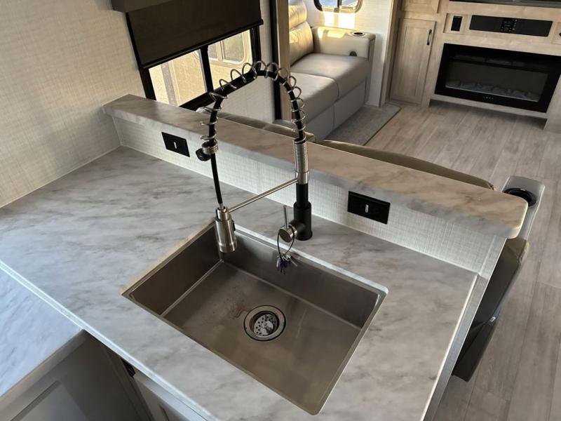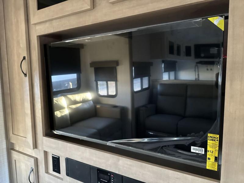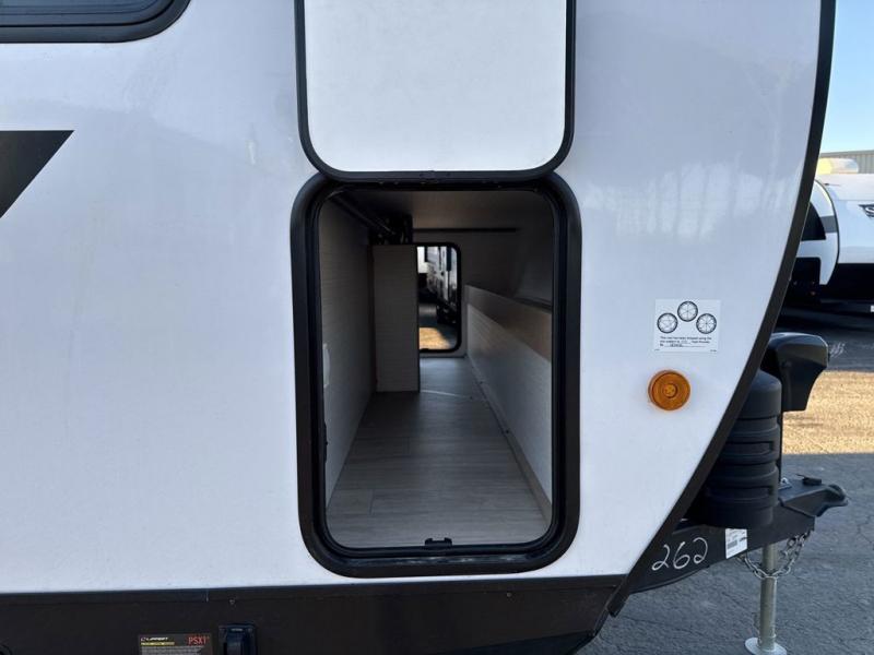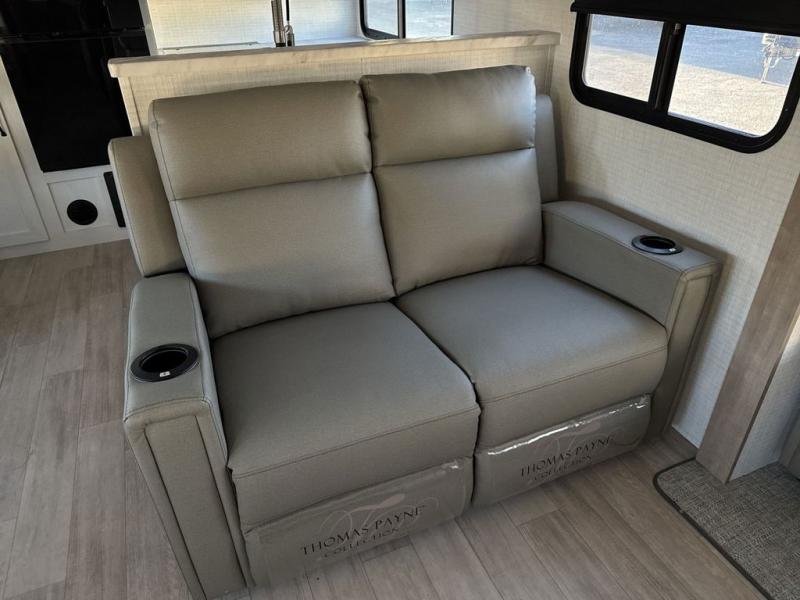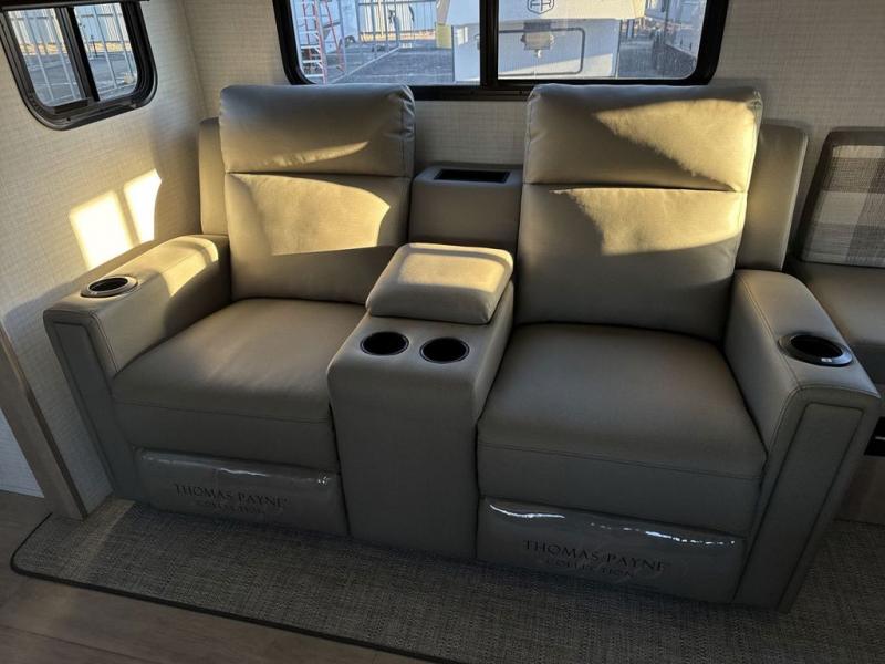 One look at this spacious travel trailer and you'll be sold! The rear kitchen features a U-shaped counter, an 11 cu. ft. refrigerator, plus a pantry for dry goods and snacks. There is a 1/2 dinette with bench seating, plus a tri-fold sofa and two theater seats. Everyone can take turns cleaning up in the full bath that includes a shower with a seat, then head outdoors to relax under the patio awnings with LED lights. When it's time for bed, you will enjoy the king bed slide out in the front bedroom. You'll also find a dresser and a closet here, plus a wardrobe with washer and dryer prep if you choose to add those appliances!