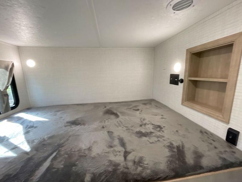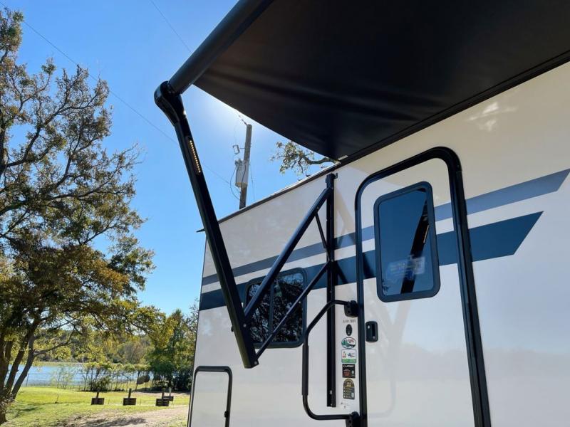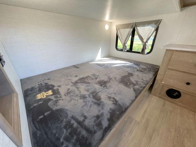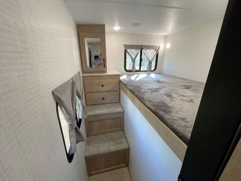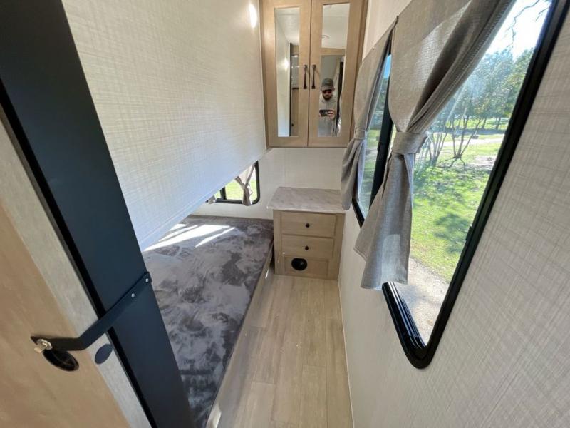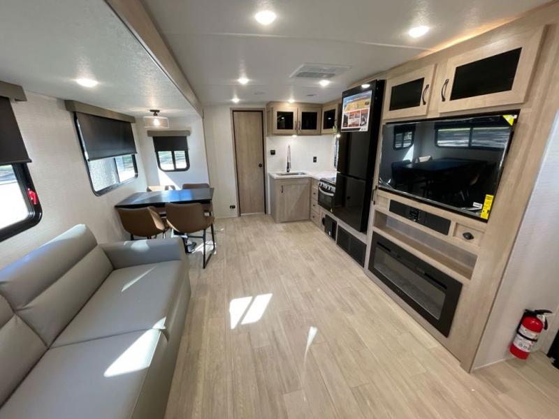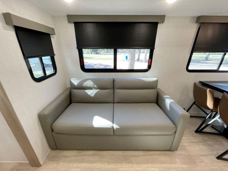 Whether you are looking for a bunkhouse, a private bedroom, or dual entry doors in your next RV, this one might just be the perfect fit with all those features! There are 45" x 72" bunk beds, each with their own wardrobe and their own private entry door, making it perfect for camping with older kids. The galley kitchen offers amenities such as a microwave, cooktop, an 11 cu. ft. refrigerator, and an L-shaped counter for preparing and serving meals. You will also find more storage, an entertainment center and a slide out sofa sleeper and booth dinette that offer more sleeping space when needed.