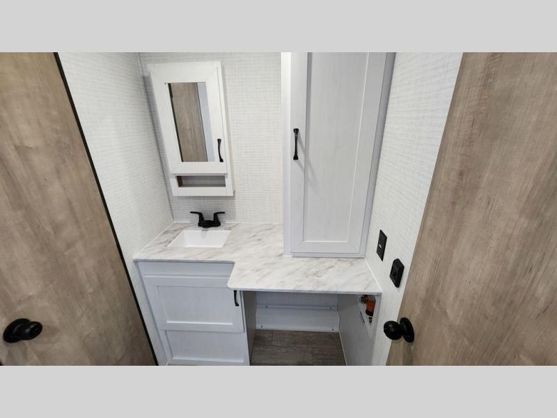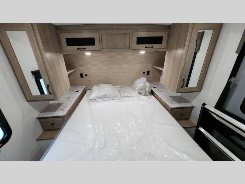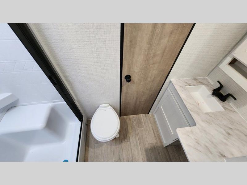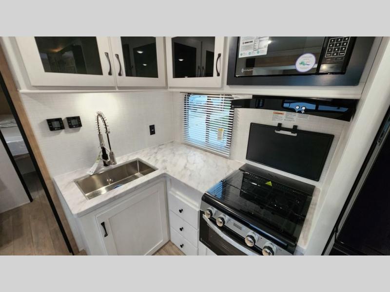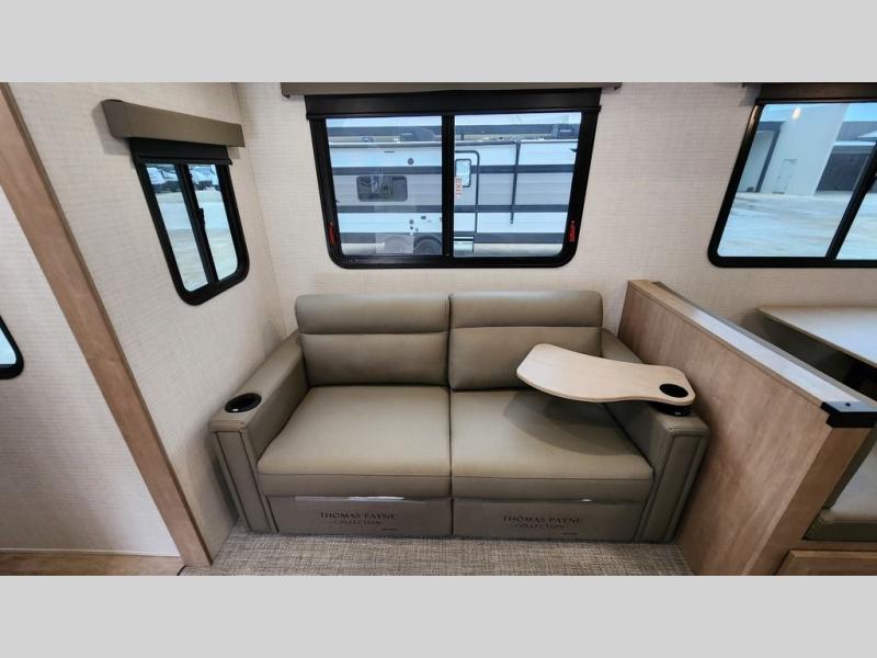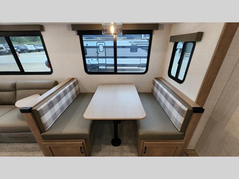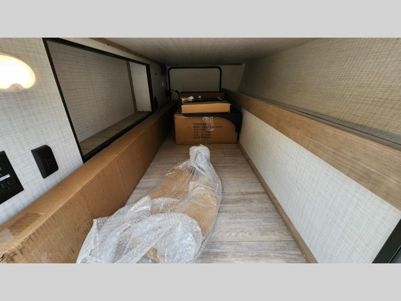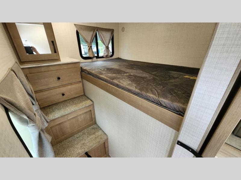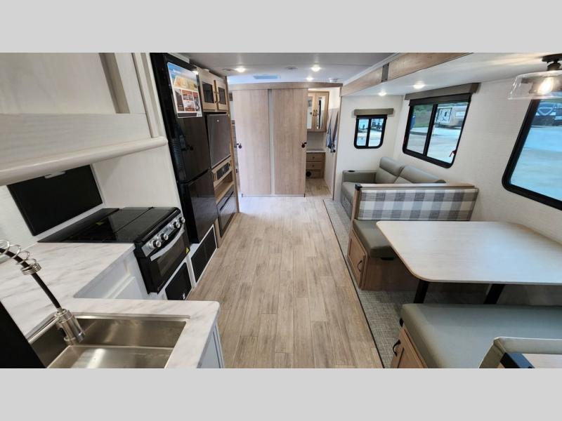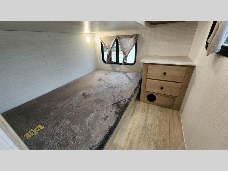 Whether you are looking for a bunkhouse, a private bedroom, or dual entry doors in your next RV, this one might just be the perfect fit with all those features! There are 45" x 72" bunk beds, each with their own wardrobe and their own private entry door, making it perfect for camping with older kids. The galley kitchen offers amenities such as a microwave, cooktop, an 11 cu. ft. refrigerator, and an L-shaped counter for preparing and serving meals. You will also find more storage, an entertainment center and a slide out sofa sleeper and booth dinette that offer more sleeping space when needed.