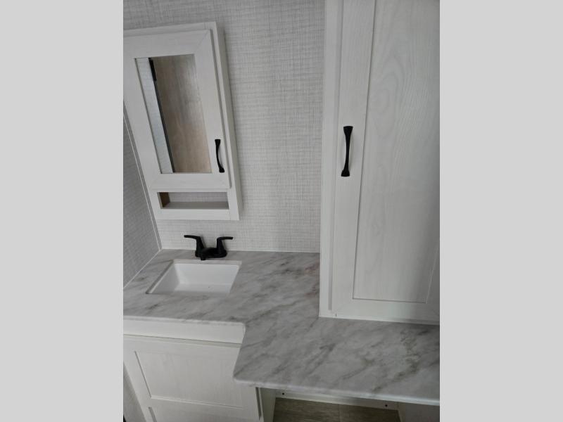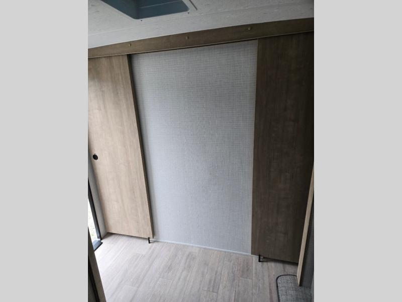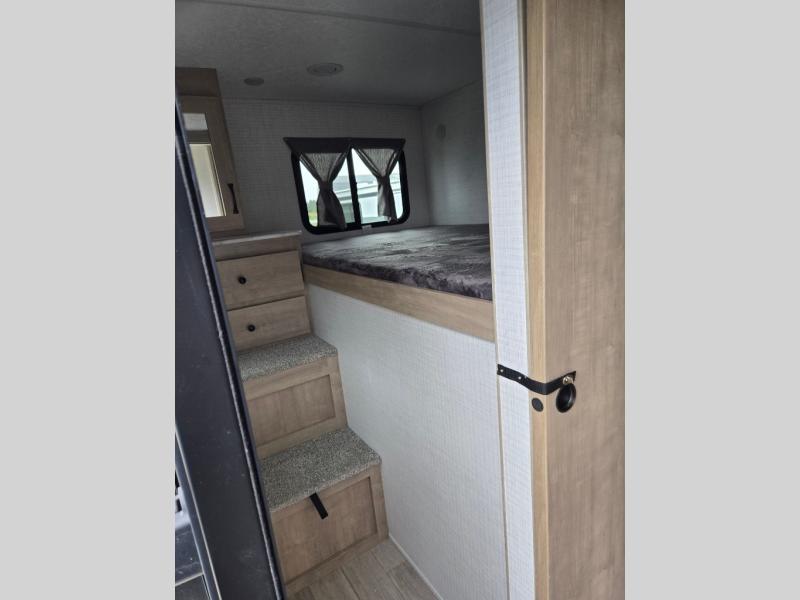 Whether you are looking for a bunkhouse, a private bedroom, or dual entry doors in your next RV, this one might just be the perfect fit with all those features! There are 45" x 72" bunk beds, each with their own wardrobe and their own private entry door, making it perfect for camping with older kids. The galley kitchen offers amenities such as a microwave, cooktop, an 11 cu. ft. refrigerator, and an L-shaped counter for preparing and serving meals. You will also find more storage, an entertainment center and a slide out sofa sleeper and booth dinette that offer more sleeping space when needed.
