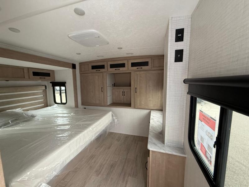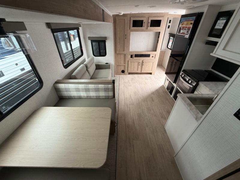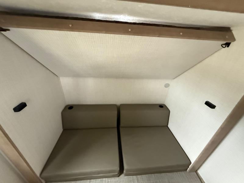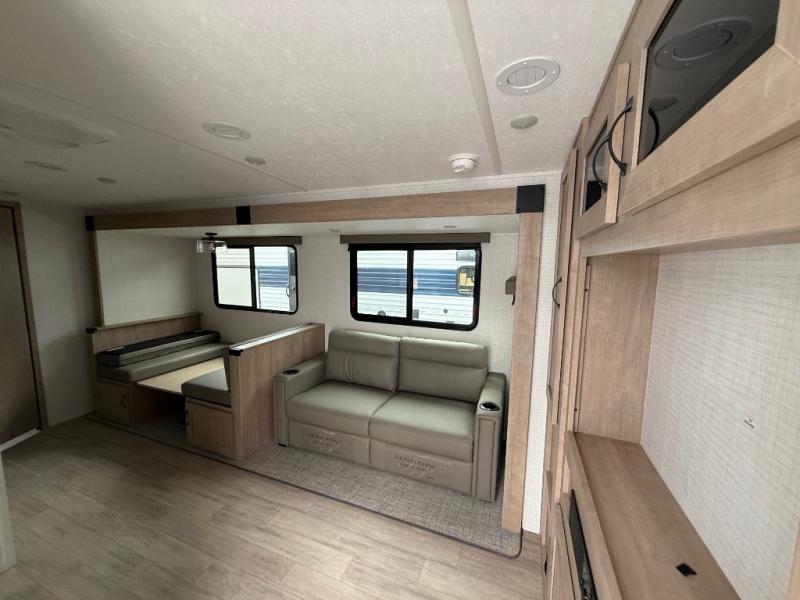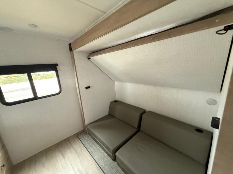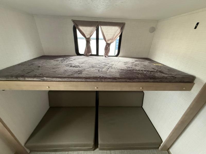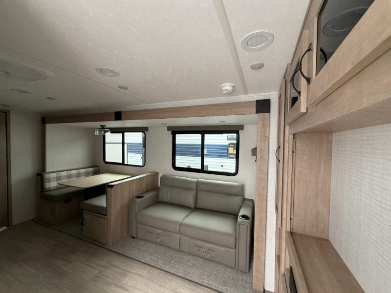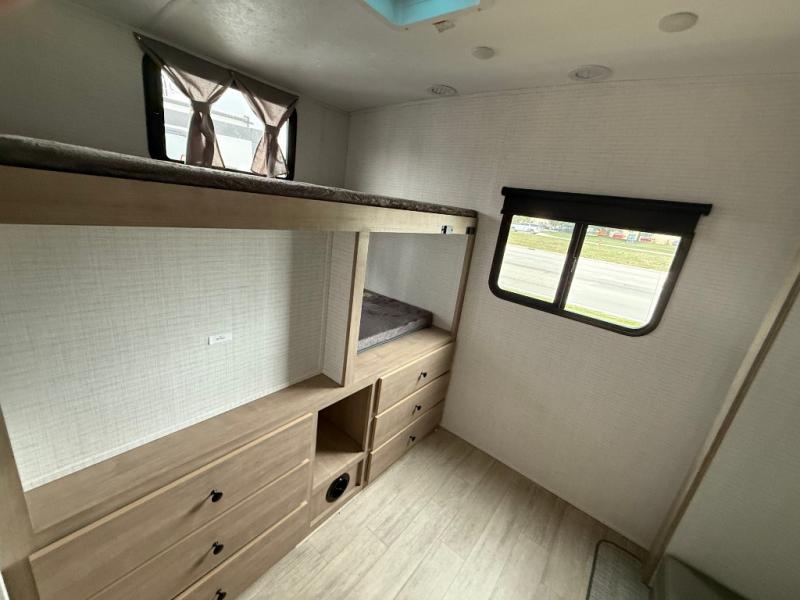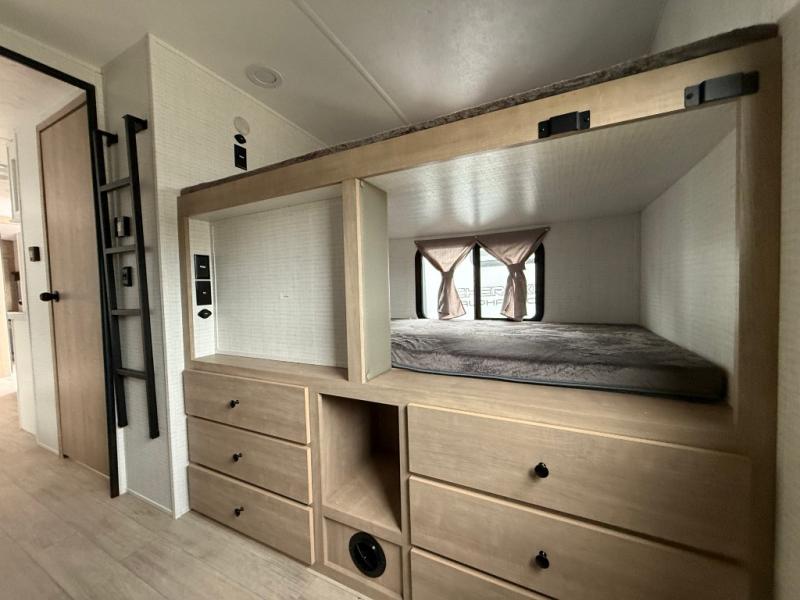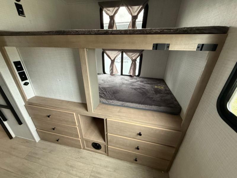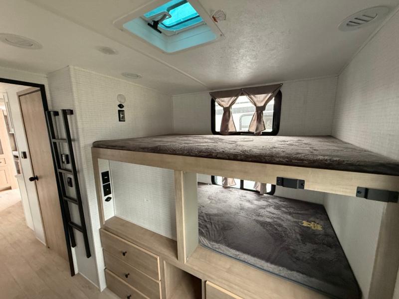 This travel trailer offers so many features that you will love, from a private bunkhouse for overnight guests to having three slide outs giving you a spacious interior throughout! The bunkhouse includes triple bunks, a double-size day bed, and storage space for your guests' things. The full bathroom is centrally located for all to access from the main living and kitchen area where you will find a slide out that includes a booth dinette and a sofa sleeper. The cook will love the kitchen amenities such as the microwave, cooktop, 11 cu. ft. refrigerator, and the L-shaped counter for preparing and serving meals. And don't overlook the front private bedroom with its king bed slide out, dresser, closet, plus a second bedroom closet with washer and dryer prep!