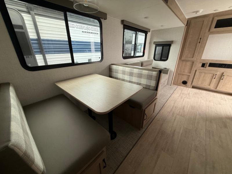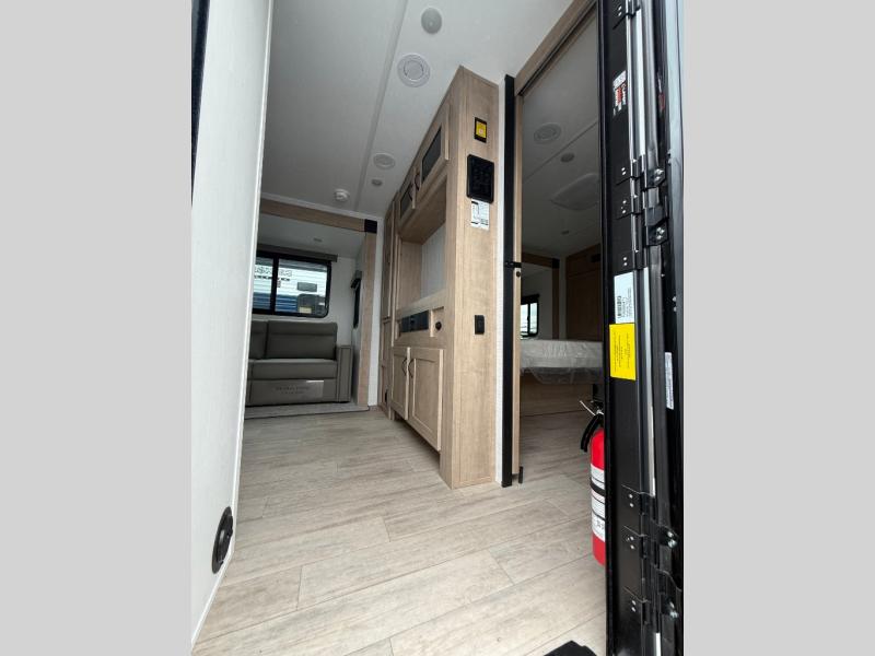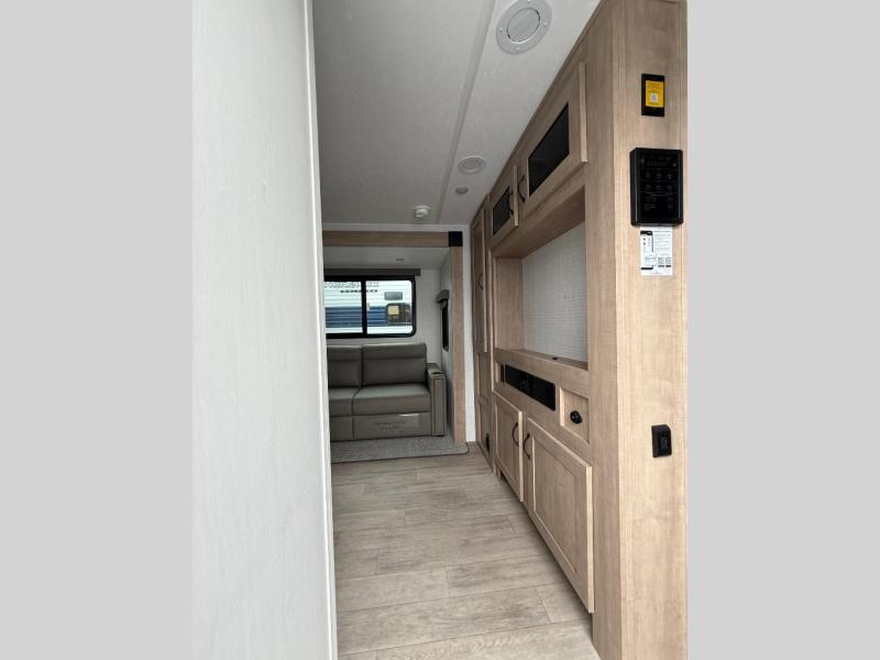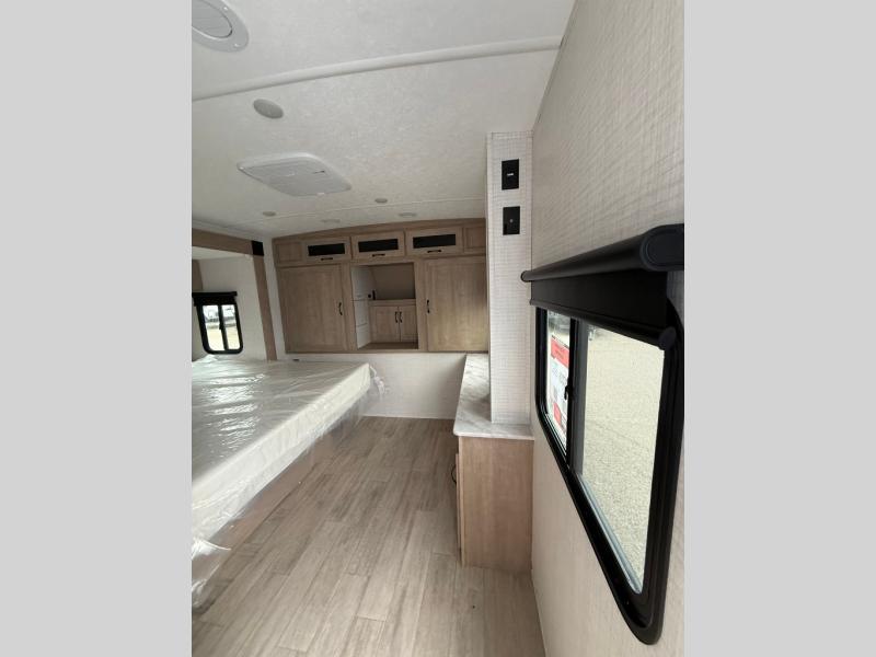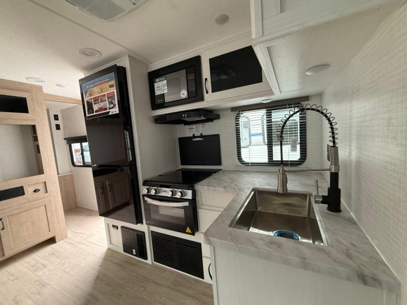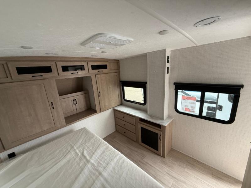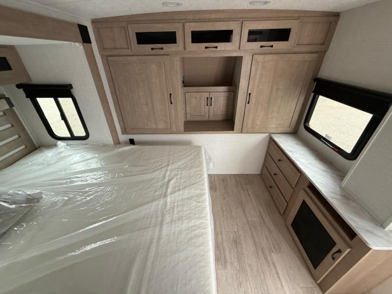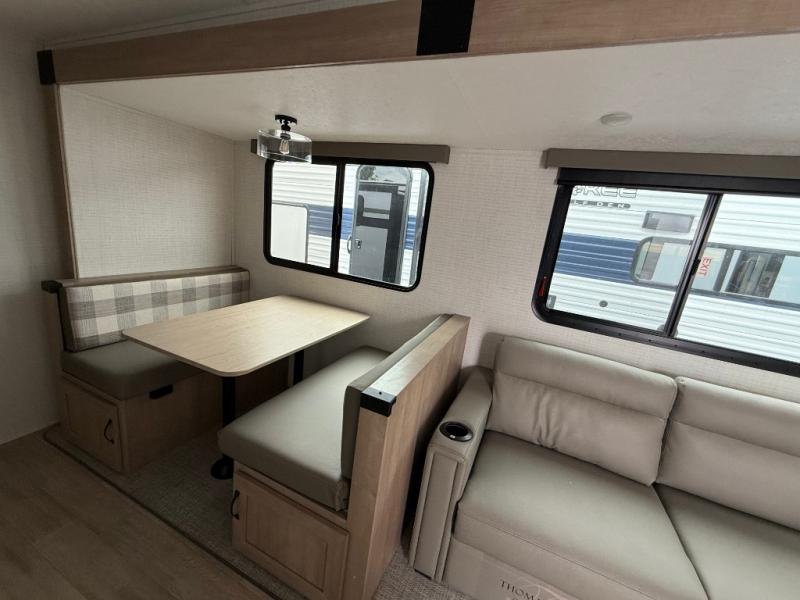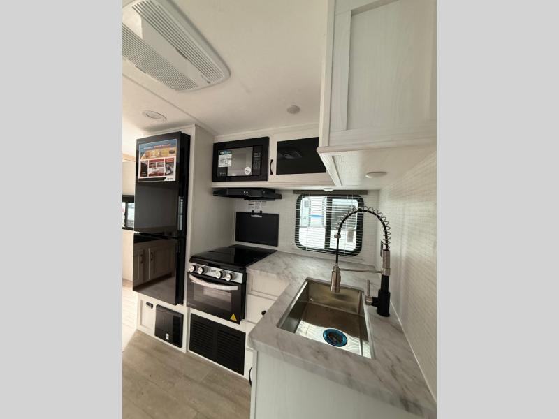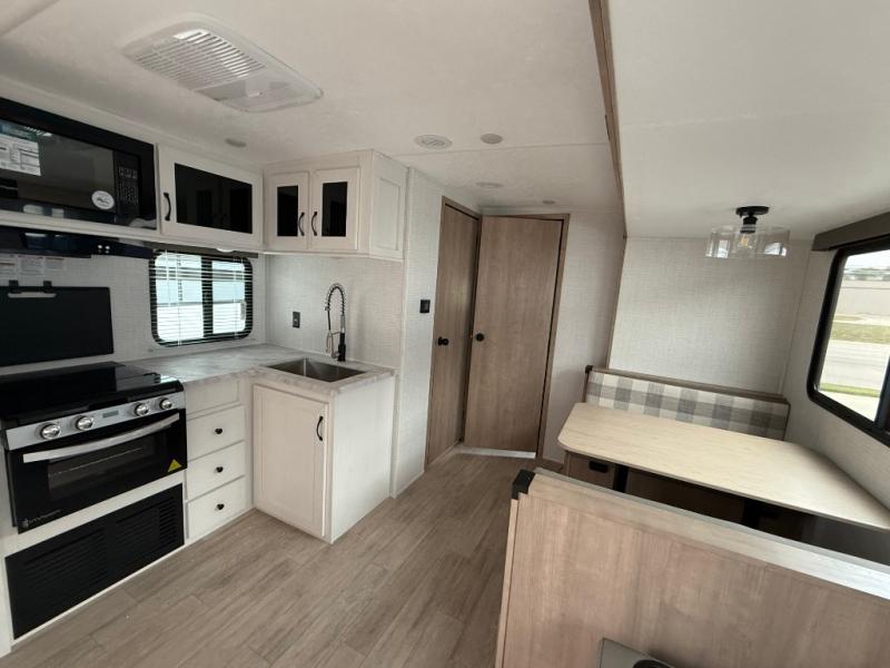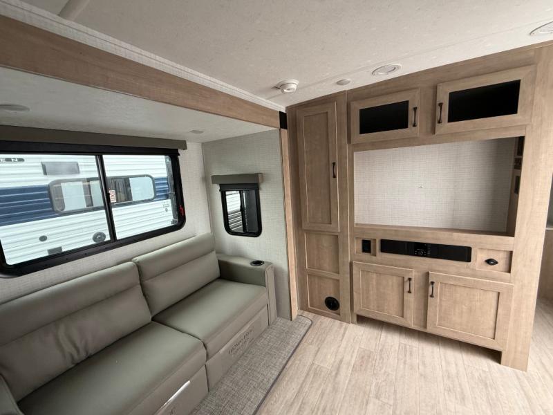This travel trailer offers so many features that you will love, from a private bunkhouse for overnight guests to having three slide outs giving you a spacious interior throughout! The bunkhouse includes triple bunks, a double-size day bed, and storage space for your guests' things. The full bathroom is centrally located for all to access from the main living and kitchen area where you will find a slide out that includes a booth dinette and a sofa sleeper. The cook will love the kitchen amenities such as the microwave, cooktop, 11 cu. ft. refrigerator, and the L-shaped counter for preparing and serving meals. And don't overlook the front private bedroom with its king bed slide out, dresser, closet, plus a second bedroom closet with washer and dryer prep!