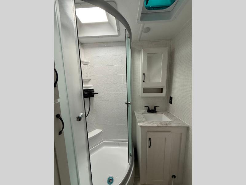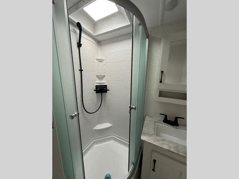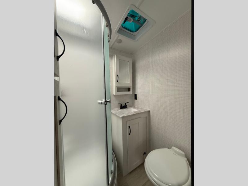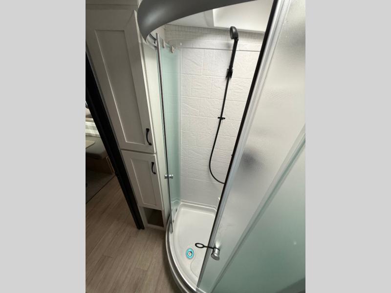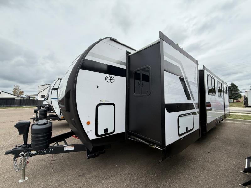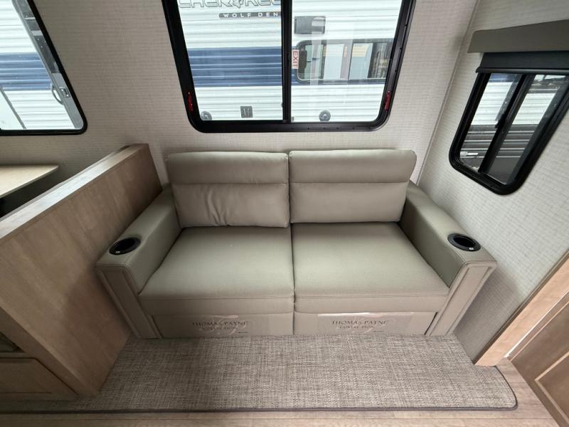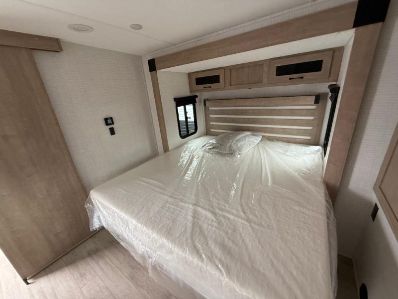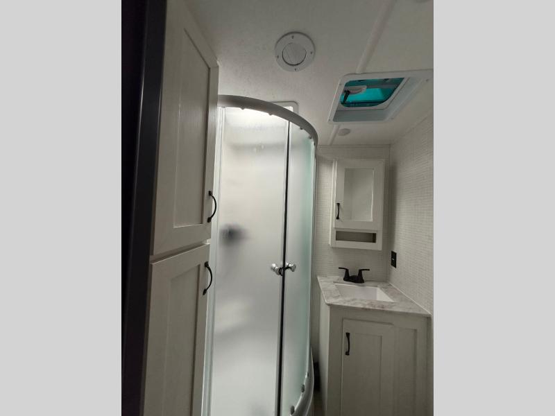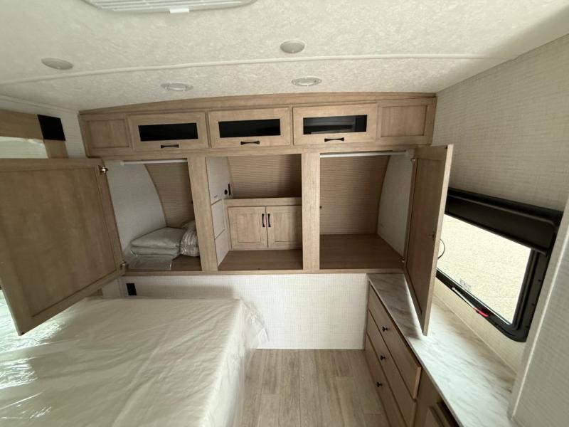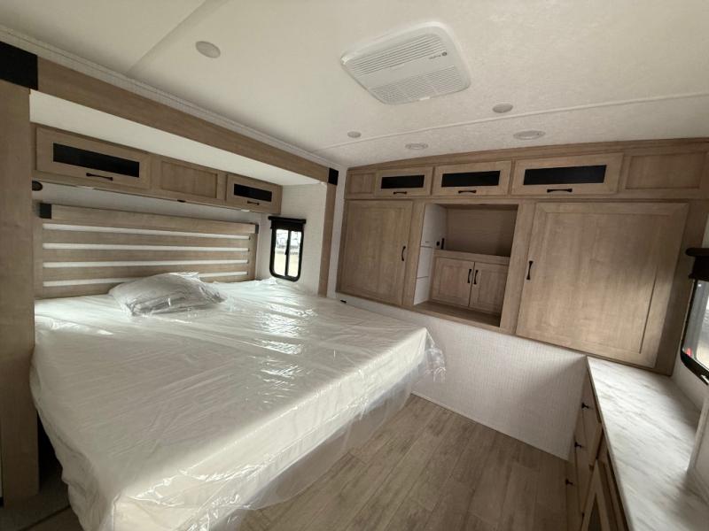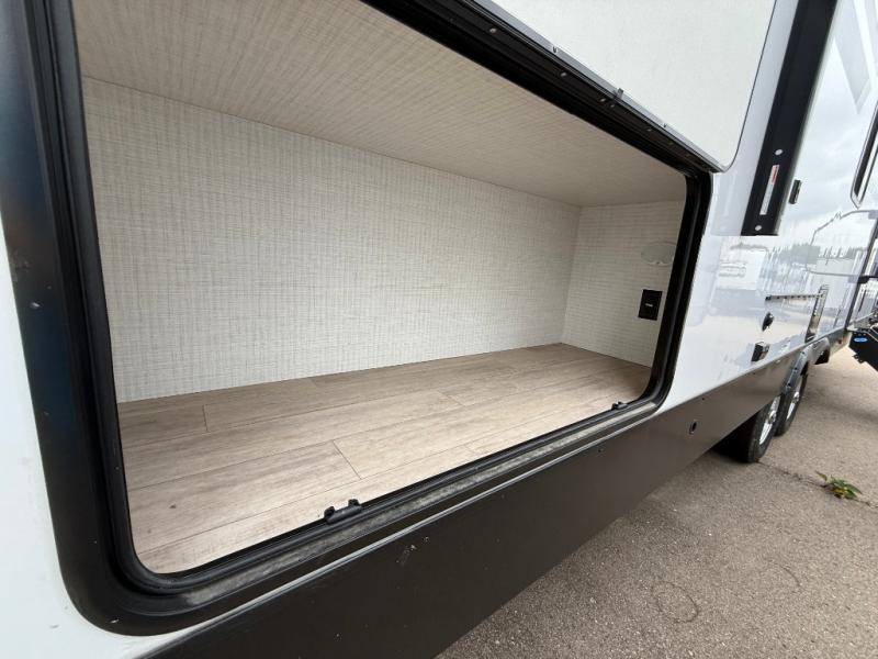 This travel trailer offers so many features that you will love, from a private bunkhouse for overnight guests to having three slide outs giving you a spacious interior throughout! The bunkhouse includes triple bunks, a double-size day bed, and storage space for your guests' things. The full bathroom is centrally located for all to access from the main living and kitchen area where you will find a slide out that includes a booth dinette and a sofa sleeper. The cook will love the kitchen amenities such as the microwave, cooktop, 11 cu. ft. refrigerator, and the L-shaped counter for preparing and serving meals. And don't overlook the front private bedroom with its king bed slide out, dresser, closet, plus a second bedroom closet with washer and dryer prep!