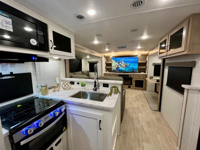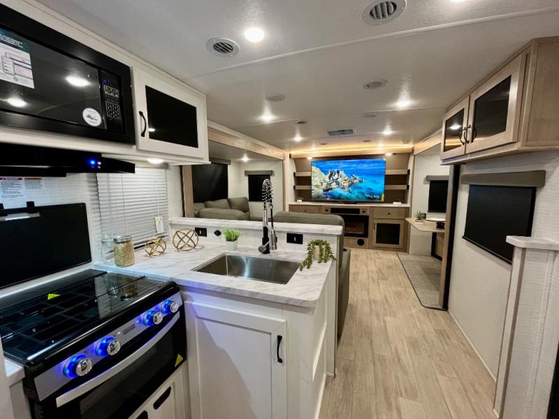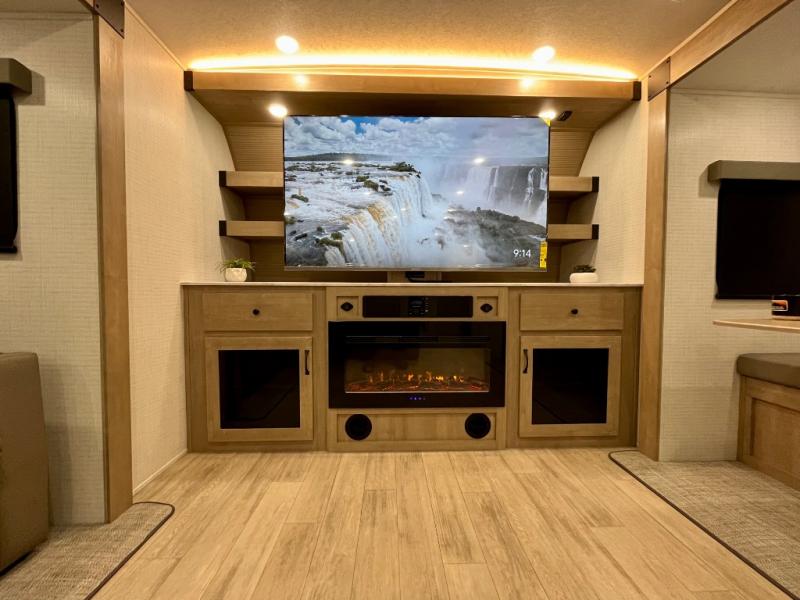 This travel trailer will feel just like home with its front living area, master bedroom, and triple slides for more space! You'll enjoy the sectional sofa and 63" dinette with two chairs on one side with a bench seat on the other. There is a front entertainment center where you can add an optional TV, and the fireplace will make it more cozy. A middle kitchen includes all the appliances to make meals each day, plus an electric refrigerator and pantry for food storage. Head towards the back to find the master bedroom with a king bed slide out, dual wardrobes, and a desk with drawers if you need to get some work done. And the full rear bath is super accommodating with its dual bath sinks plus washer and dryer prep!