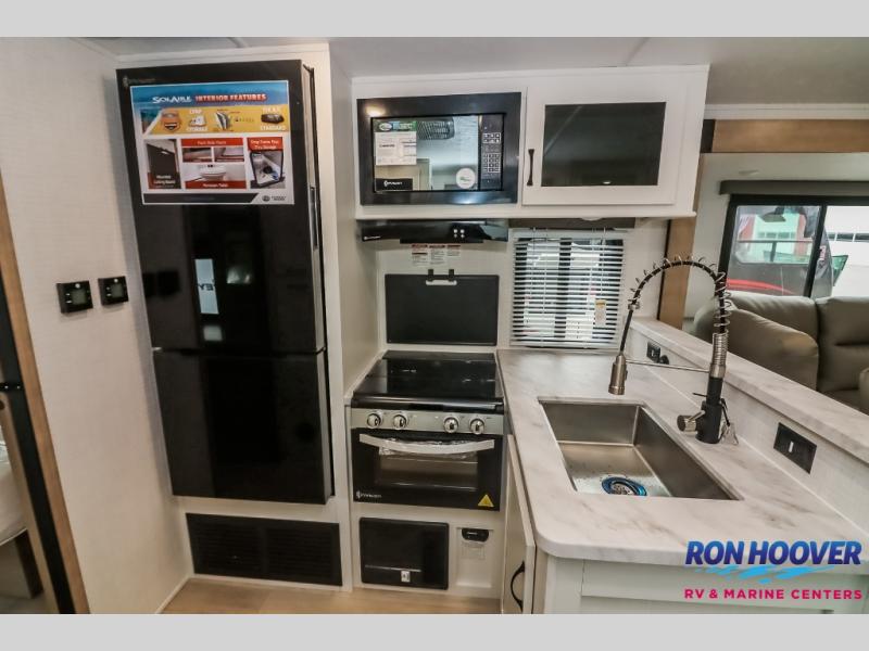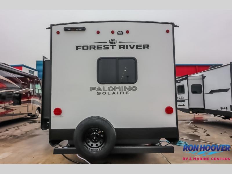 Each SolAire travel trailer by Palomino features a white gel coat exterior and an aluminum superstructure frame for lightweight towing. You will love having a power tongue jack for easy set up, plus slam latch baggage doors with magnets to make unloading easier than ever. There is also a power awning with LED lights and aluminum wheels included on the exterior. Each SolAire is constructed to last with Azdel composite, a fully laminated rear wall and roof, plus a fully enclosed and heated underbelly. The interior includes roller shades and kitchen backsplash, USB ports to keep your electronics charged, a Bluetooth stereo with speakers, and many more stand-out features!
