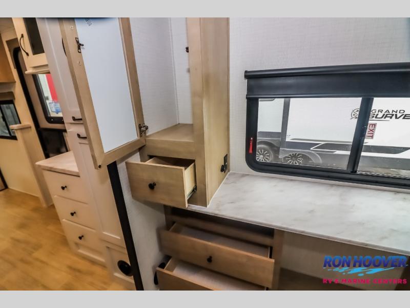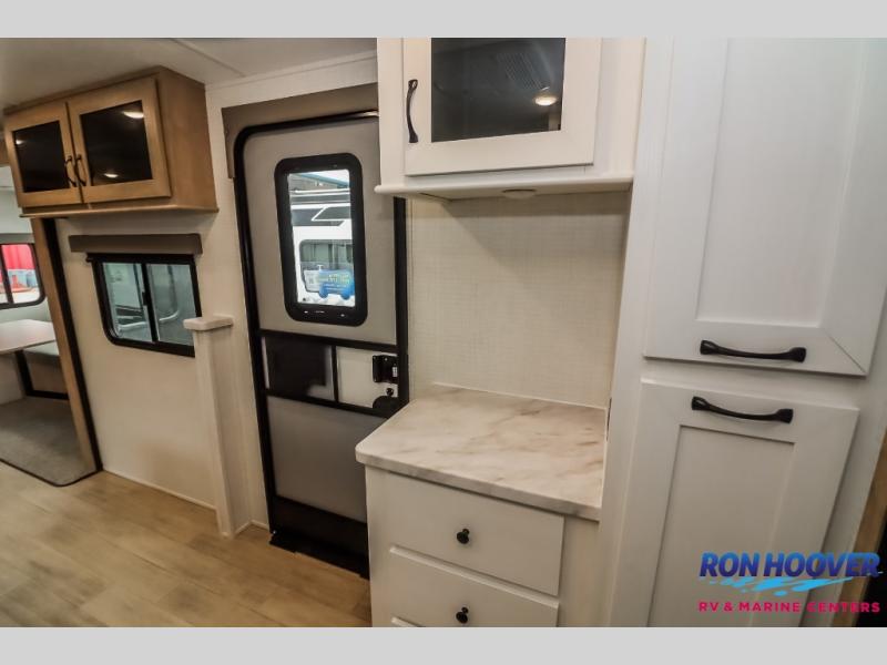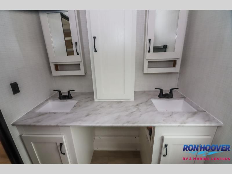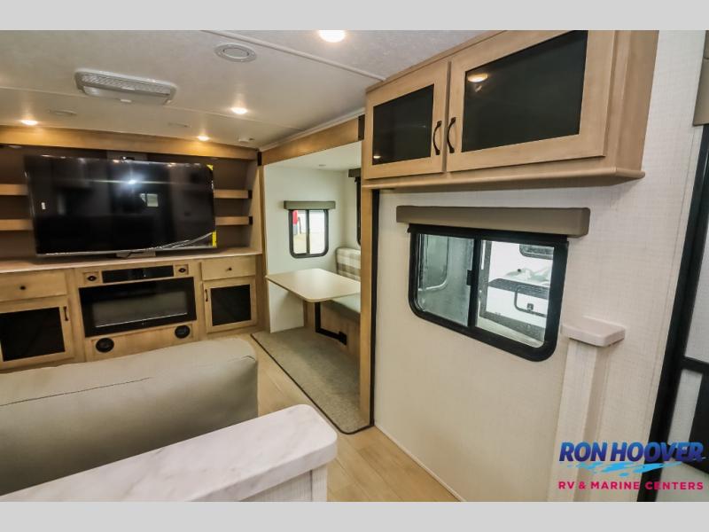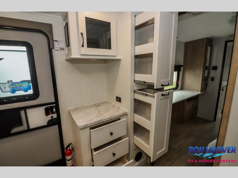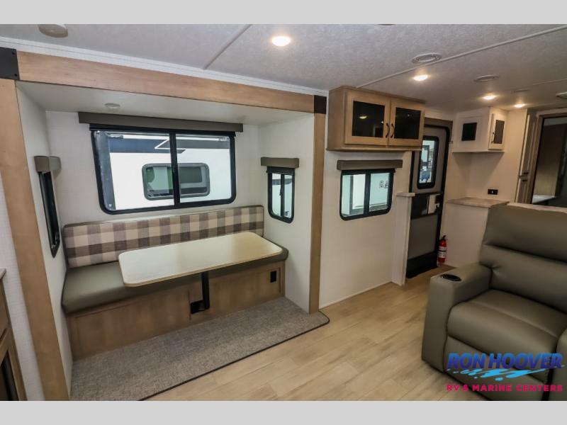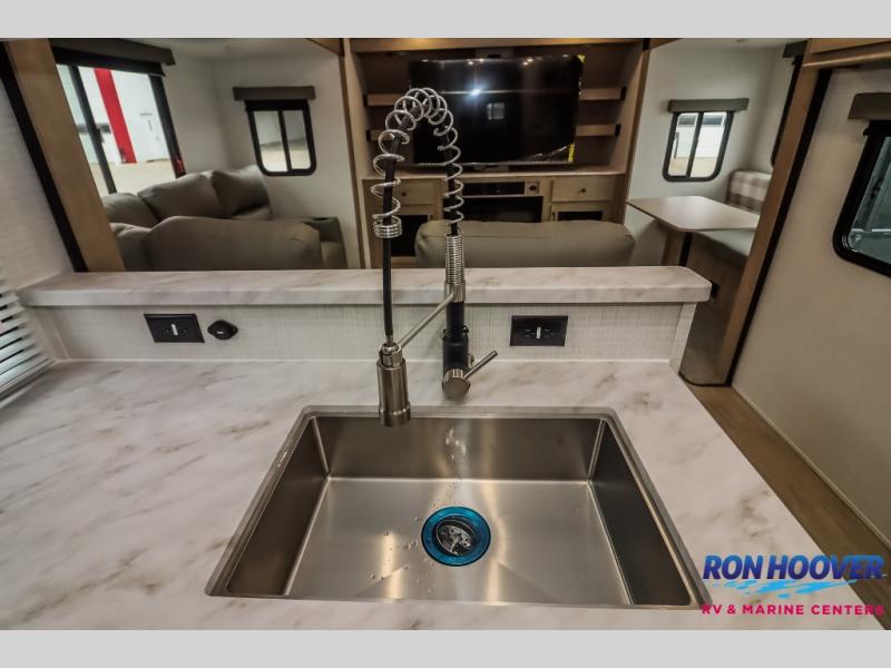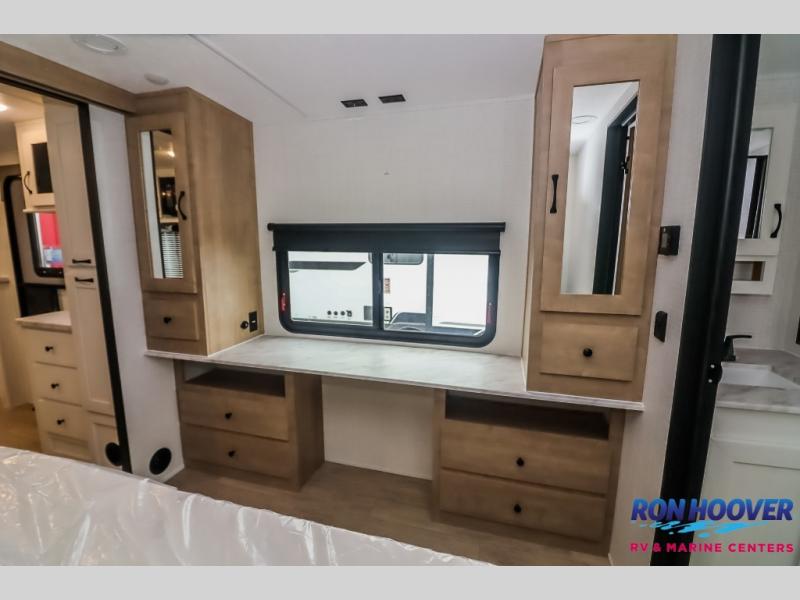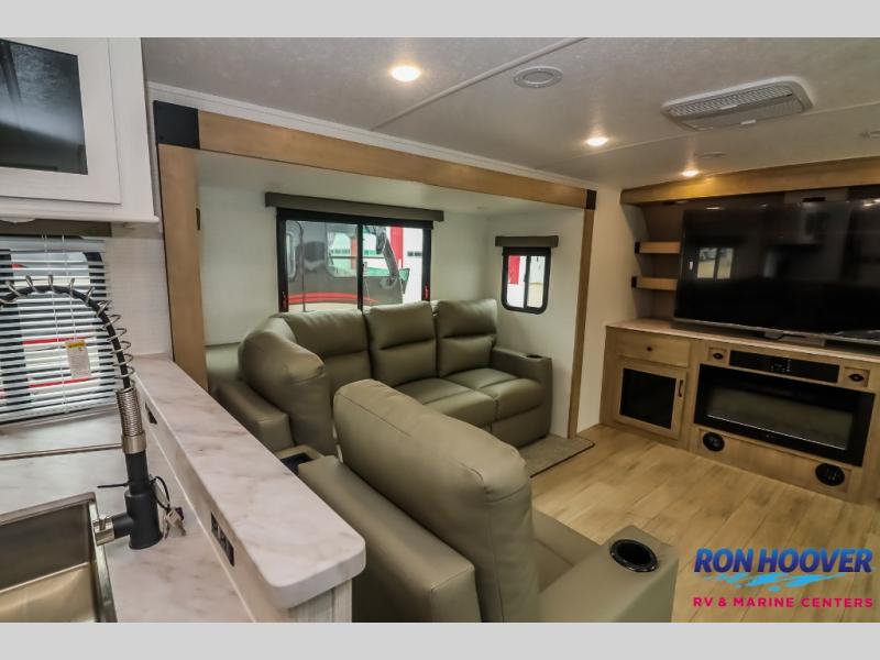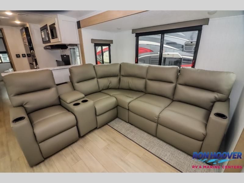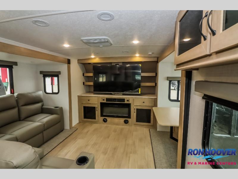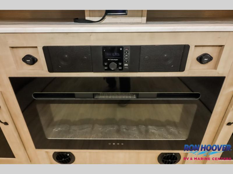This travel trailer will feel just like home with its front living area, master bedroom, and triple slides for more space! You'll enjoy the sectional sofa and 63" dinette with two chairs on one side with a bench seat on the other. There is a front entertainment center where you can add an optional TV, and the fireplace will make it more cozy. A middle kitchen includes all the appliances to make meals each day, plus an electric refrigerator and pantry for food storage. Head towards the back to find the master bedroom with a king bed slide out, dual wardrobes, and a desk with drawers if you need to get some work done. And the full rear bath is super accommodating with its dual bath sinks plus washer and dryer prep!