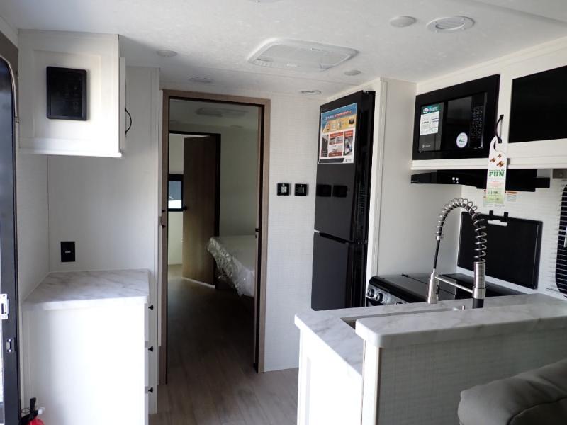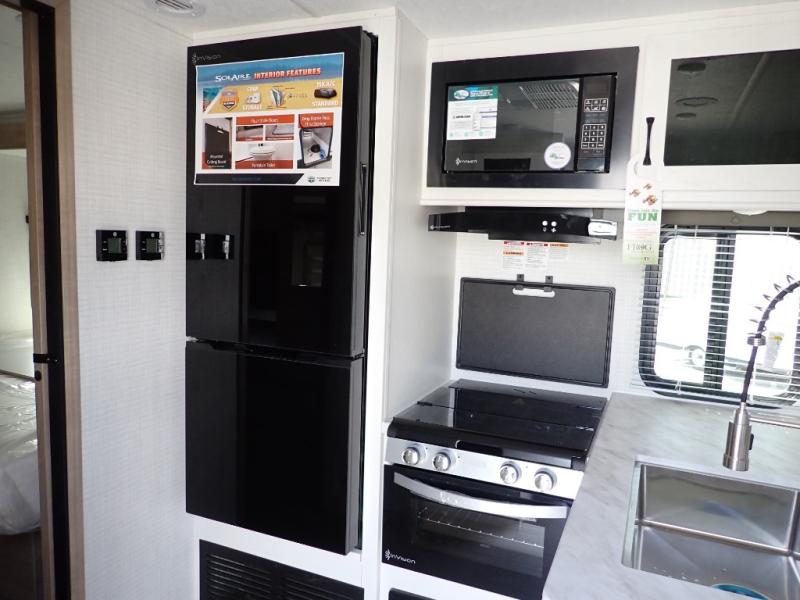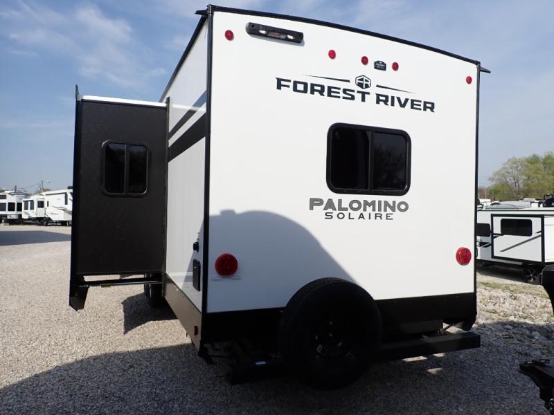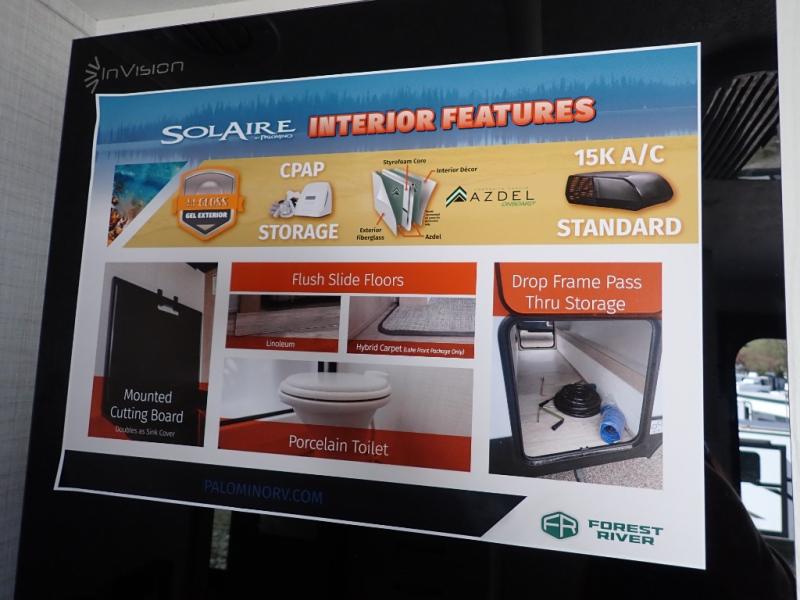 Each SolAire travel trailer by Palomino features a white gel coat exterior and an aluminum superstructure frame for lightweight towing. You will love having a power tongue jack for easy set up, plus slam latch baggage doors with magnets to make unloading easier than ever. There is also a power awning with LED lights and aluminum wheels included on the exterior. Each SolAire is constructed to last with Azdel composite, a fully laminated rear wall and roof, plus a fully enclosed and heated underbelly. The interior includes roller shades and kitchen backsplash, USB ports to keep your electronics charged, a Bluetooth stereo with speakers, and many more stand-out features!