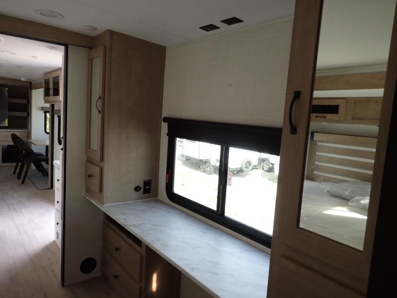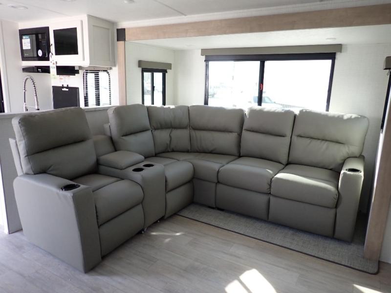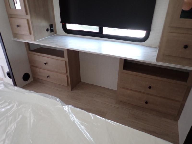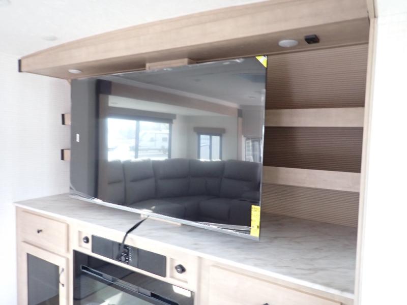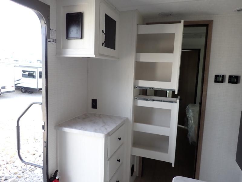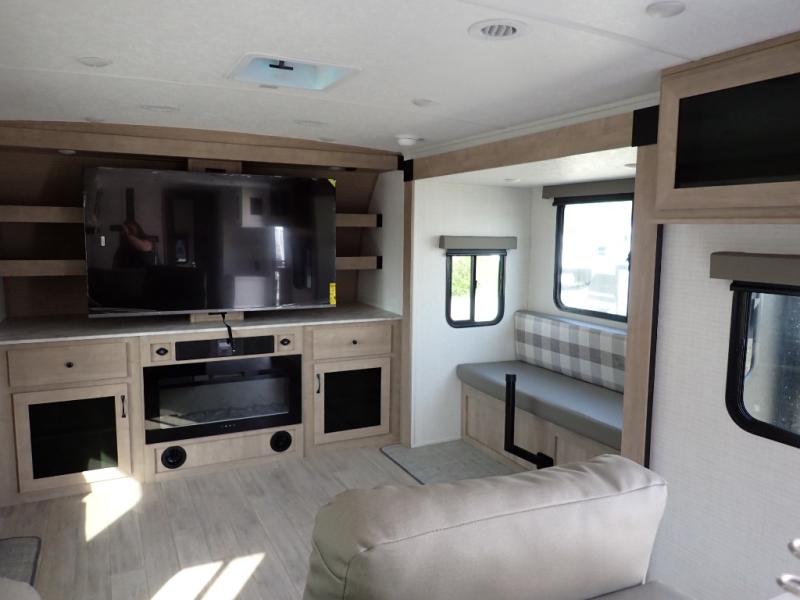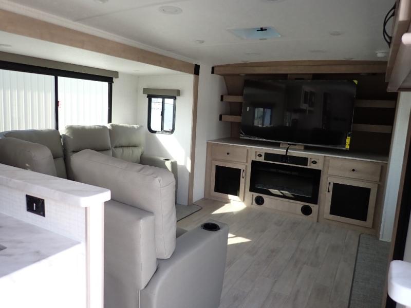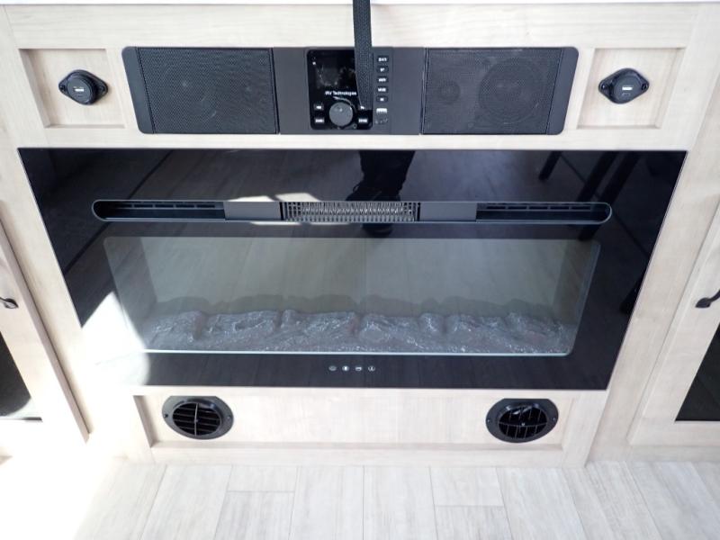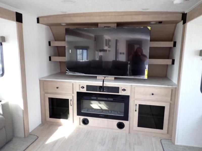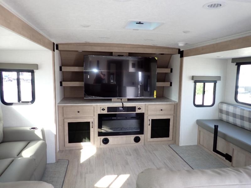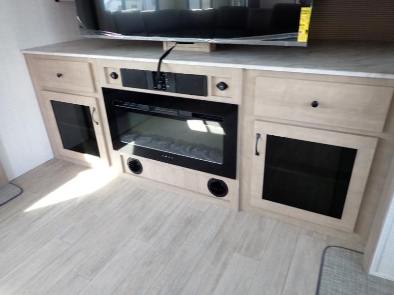 This travel trailer will feel just like home with its front living area, master bedroom, and triple slides for more space! You'll enjoy the sectional sofa and 63" dinette with two chairs on one side with a bench seat on the other. There is a front entertainment center where you can add an optional TV, and the fireplace will make it more cozy. A middle kitchen includes all the appliances to make meals each day, plus an electric refrigerator and pantry for food storage. Head towards the back to find the master bedroom with a king bed slide out, dual wardrobes, and a desk with drawers if you need to get some work done. And the full rear bath is super accommodating with its dual bath sinks plus washer and dryer prep!