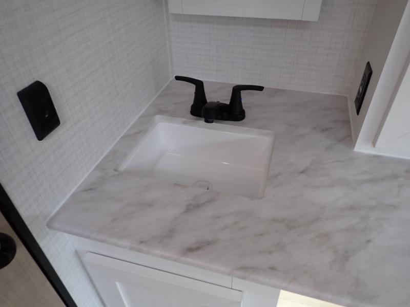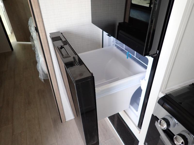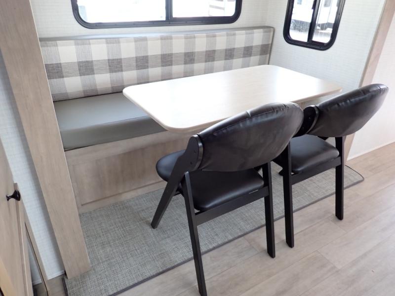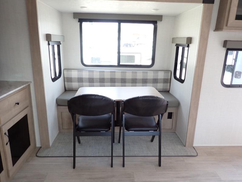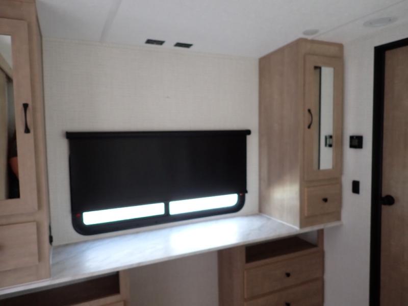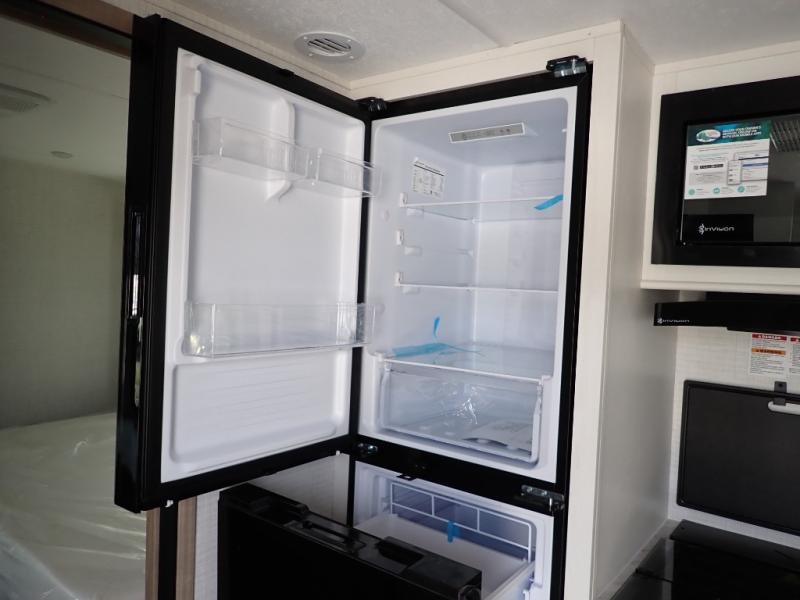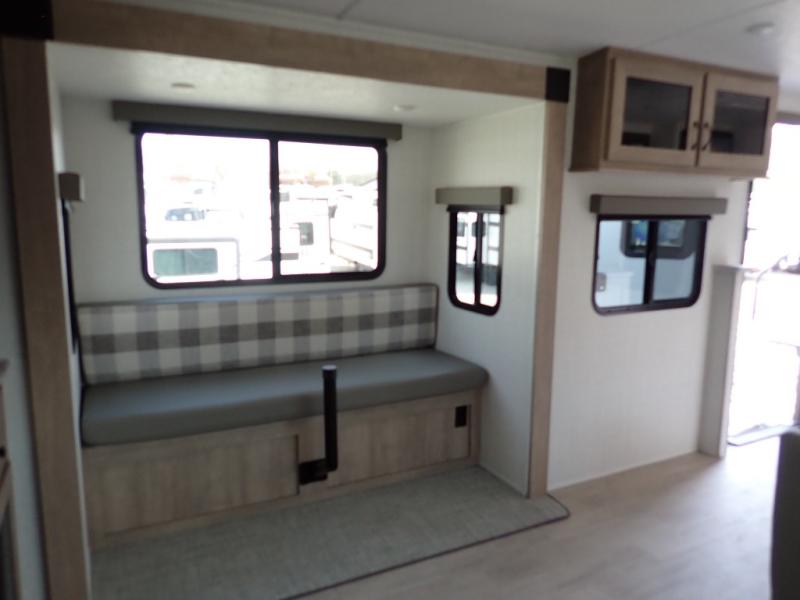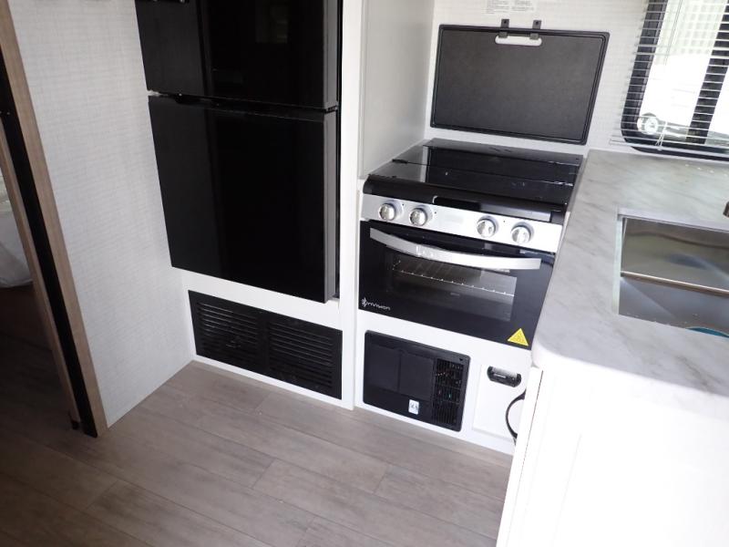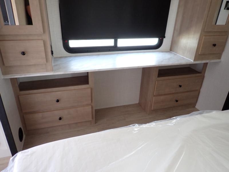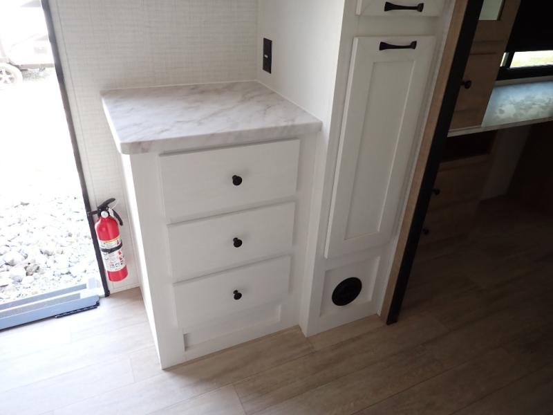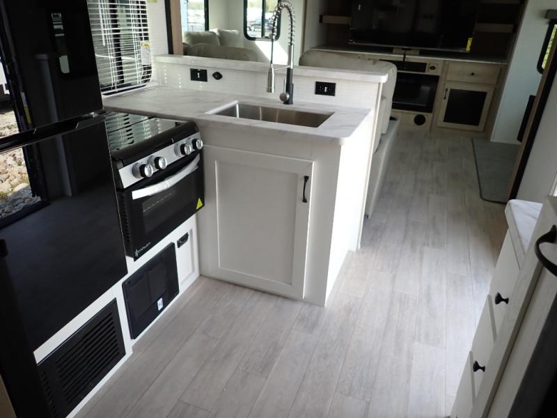 This travel trailer will feel just like home with its front living area, master bedroom, and triple slides for more space! You'll enjoy the sectional sofa and 63" dinette with two chairs on one side with a bench seat on the other. There is a front entertainment center where you can add an optional TV, and the fireplace will make it more cozy. A middle kitchen includes all the appliances to make meals each day, plus an electric refrigerator and pantry for food storage. Head towards the back to find the master bedroom with a king bed slide out, dual wardrobes, and a desk with drawers if you need to get some work done. And the full rear bath is super accommodating with its dual bath sinks plus washer and dryer prep!