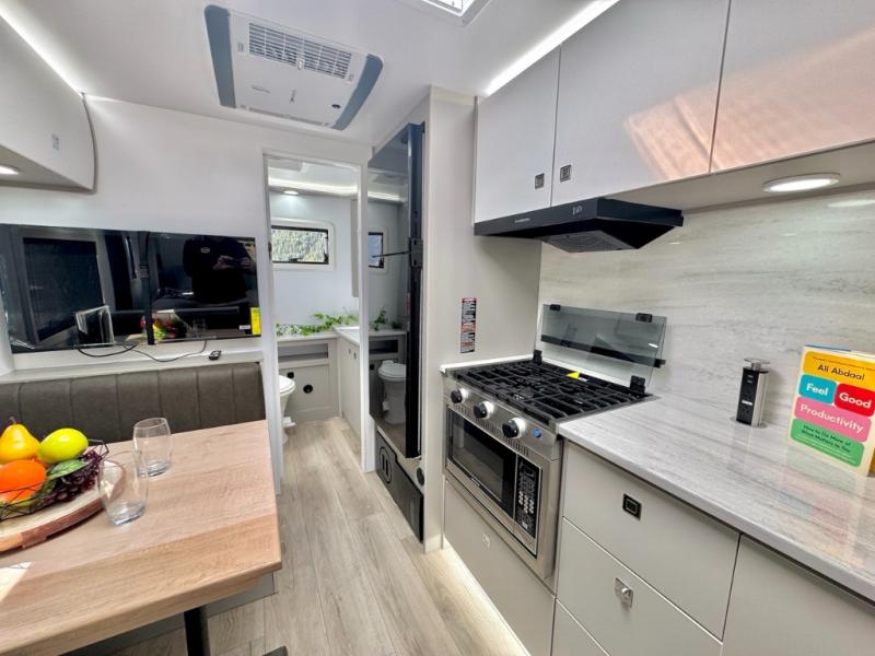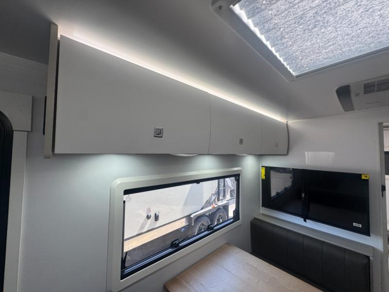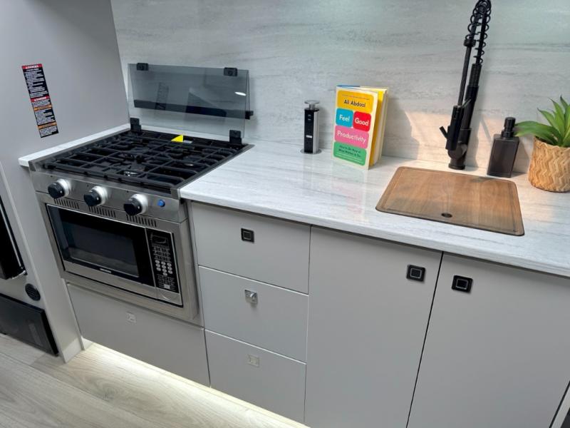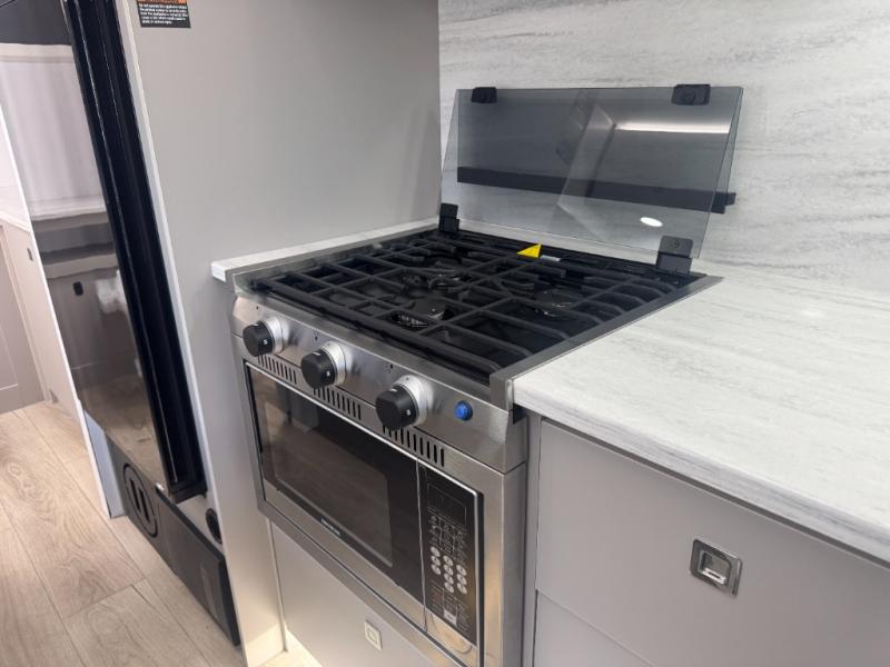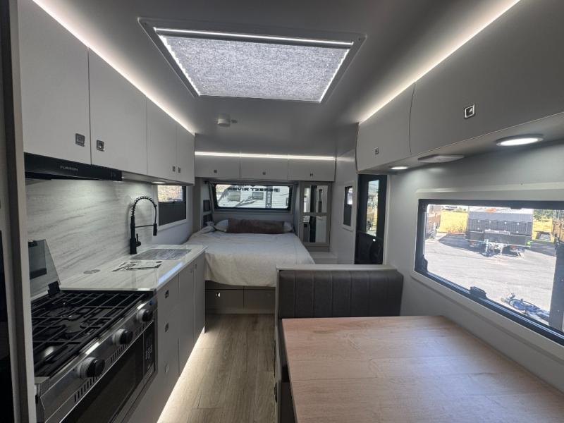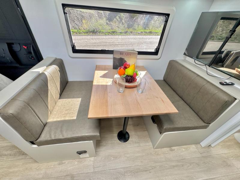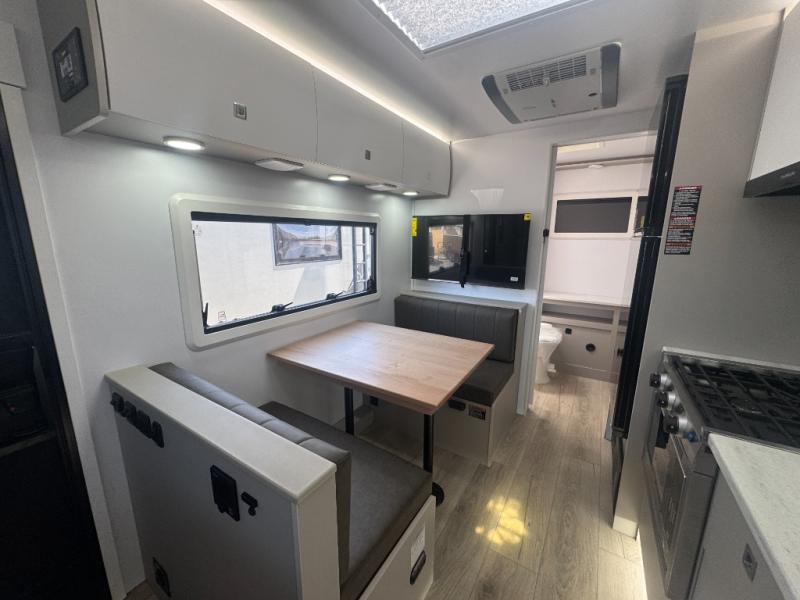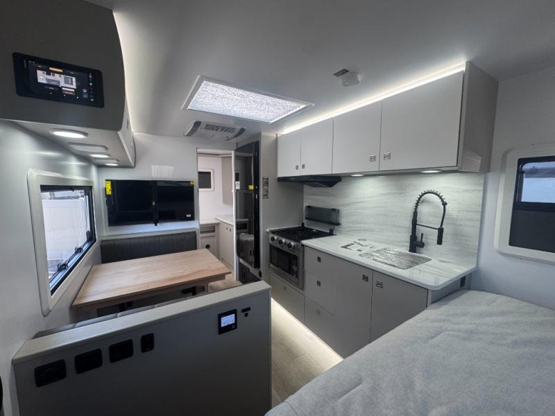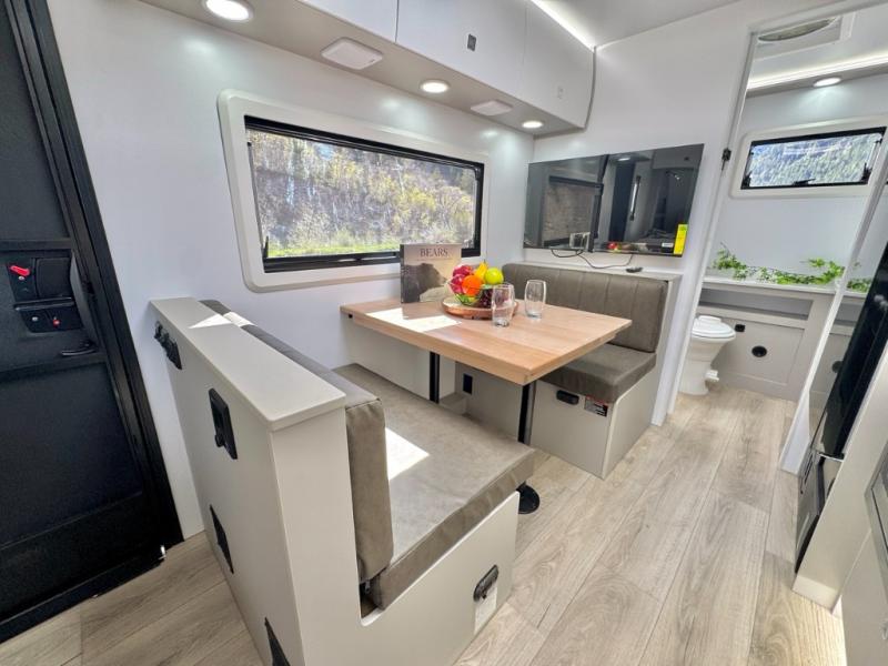 The spacious and modern interior includes solid wood cabinetry, luxury finishes, a convertible dinette bed, and a fully equipped kitchen with a 3-burner cooktop and convection microwave. Climate control is handled by Suburban or upgraded Truma systems, while connectivity and comfort remain top-tier whether you're boondocking in the desert or parked in the mountains.