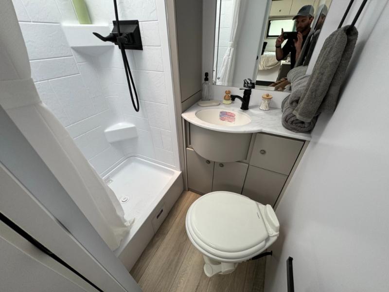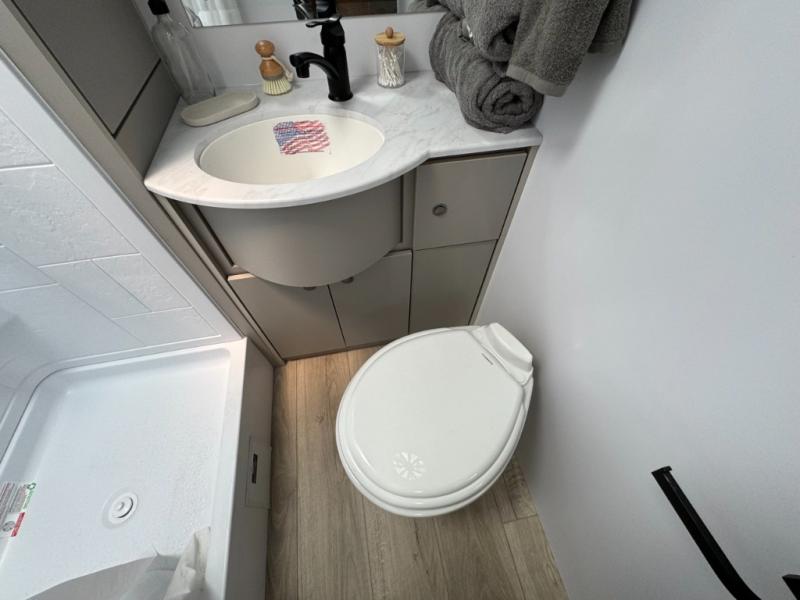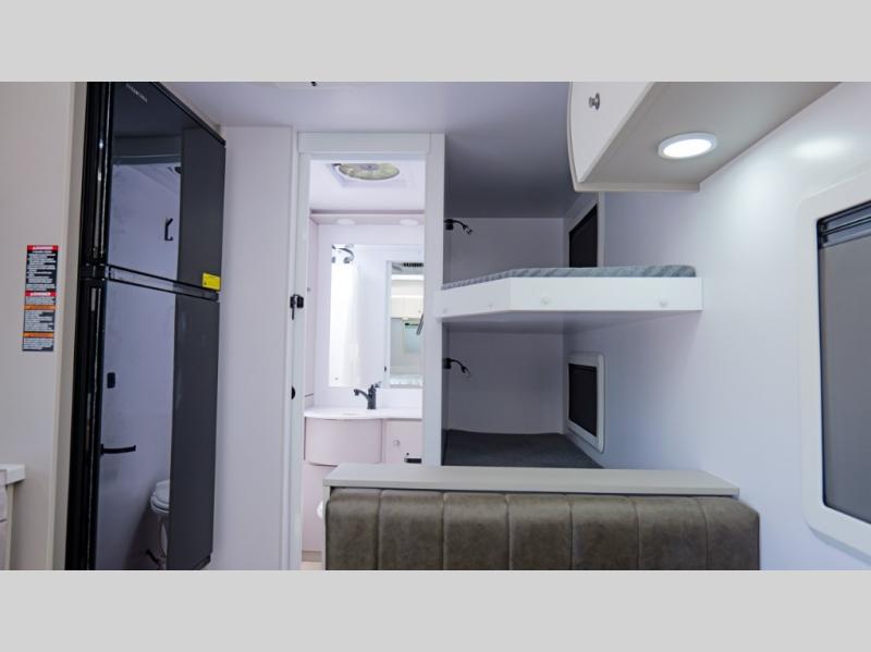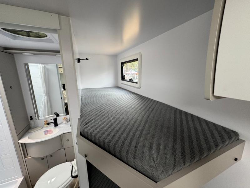 You'll love spending time in this travel trailer, whether at the lake or in the woods! The front queen bed includes an overhead cabinet for your things, and once your guests convert their bed back to a booth dinette, you can enjoy your coffee here each morning. Breakfast can be made on the three burner cooktop with a built-in convection microwave, and there is a 12V dual swing refrigerator for the milk and eggs. This unit also includes 28" x 72" bunk beds for your guests or little ones, and the full bath will let everyone freshen up each day!