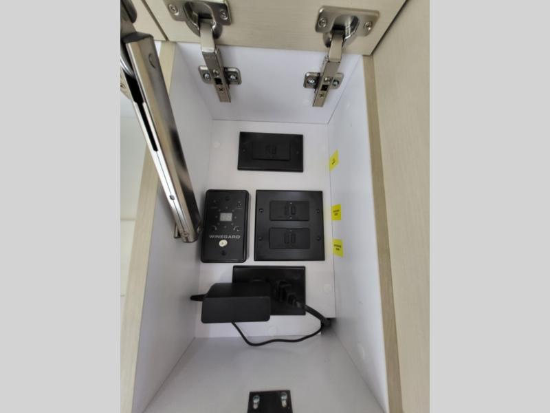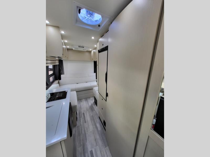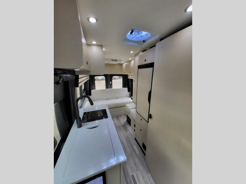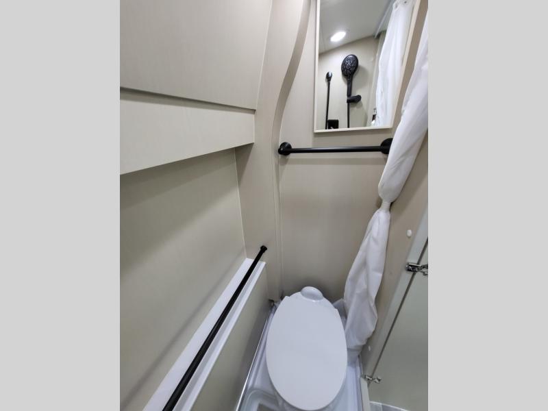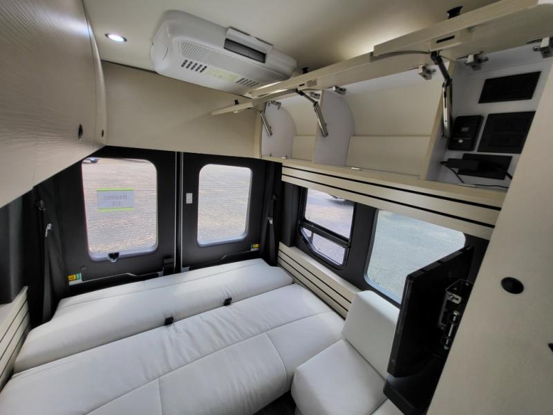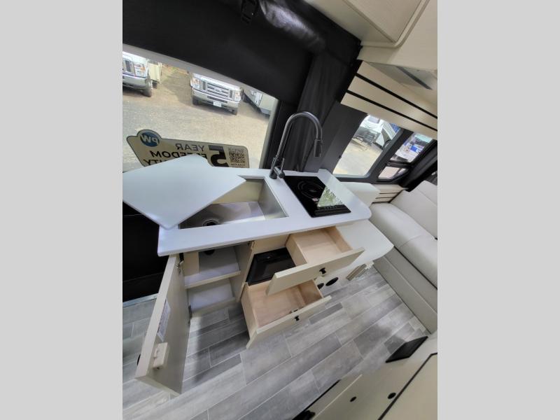 Plan to see the country in this Class B gas motorhome that includes everything you need while away from home. The power sofa with memory foam cushions will provide a great night's rest after traveling all day and the convenient wet bath with a handheld shower will allow you to clean up each morning. Prepare breakfast on the one burner induction stove top and you'll also find a microwave oven for quick meals. Food for the week can go in the 12V 3.2 cu.ft refrigerator/freezer and the overhead compartments can hold all the snacks. This model also includes a Lagun table mount system with 360 degree swivel top so you can enjoy coffee with your loved one.