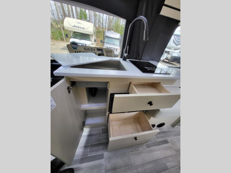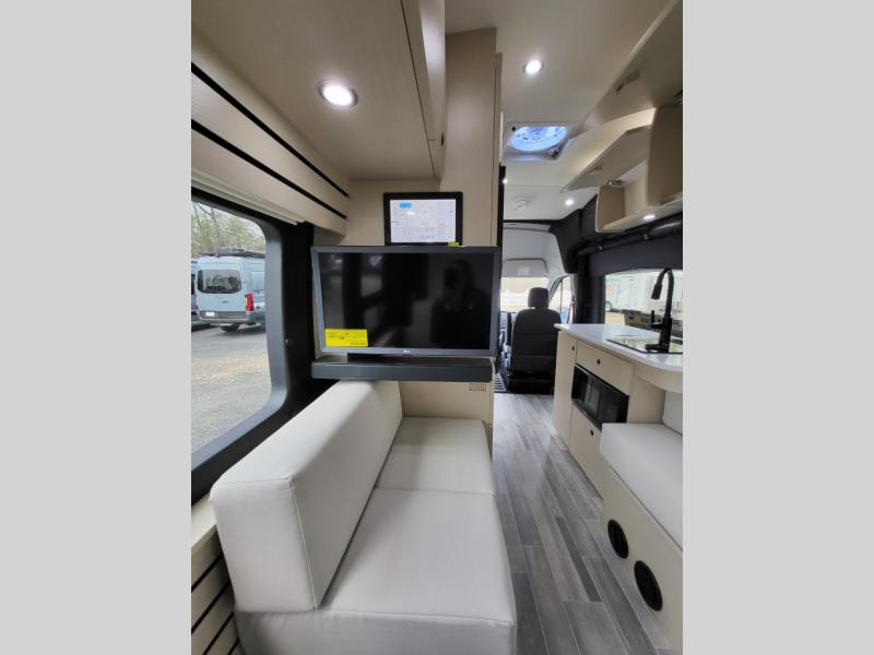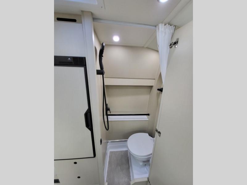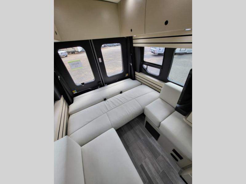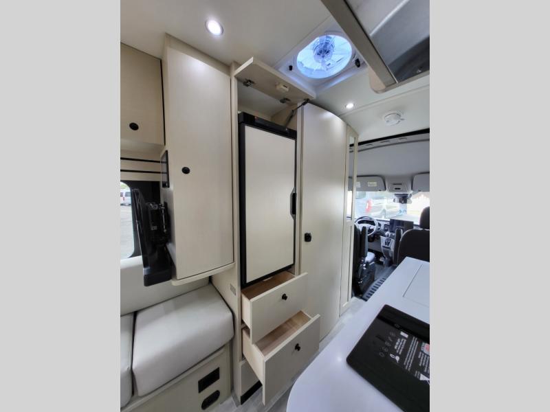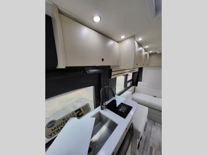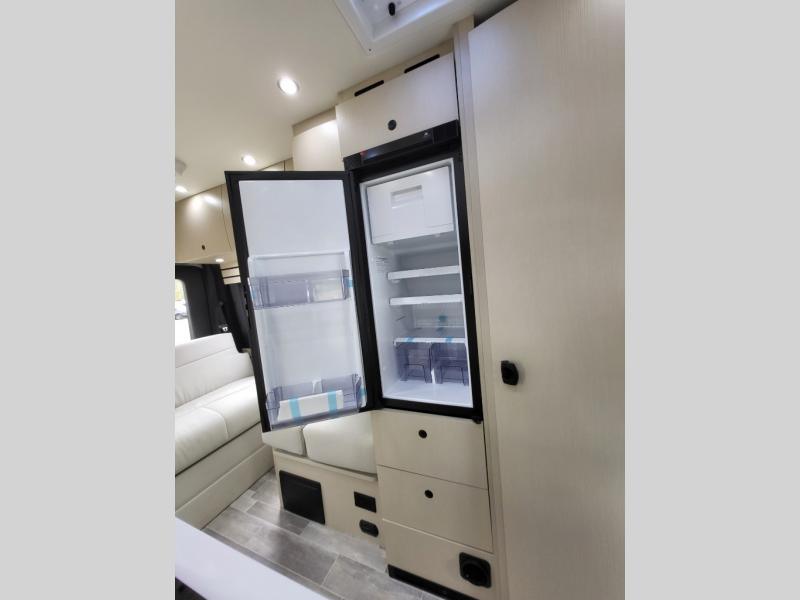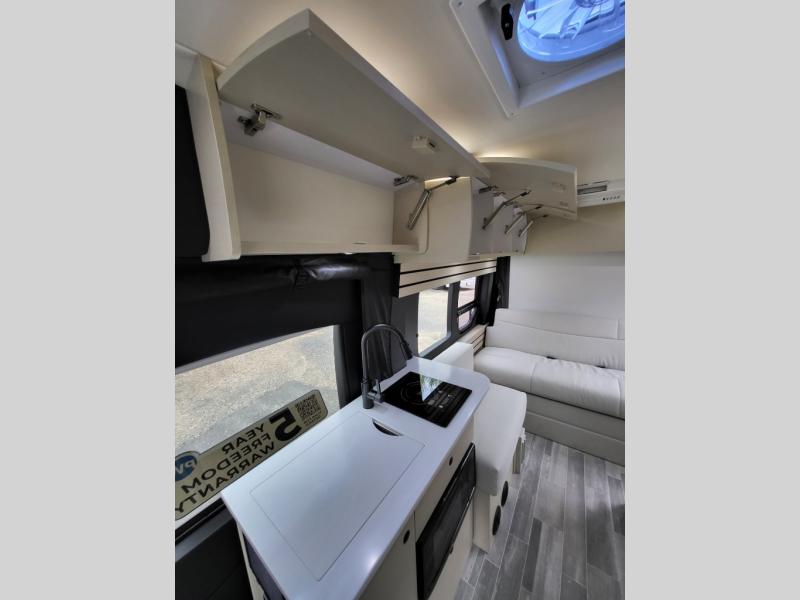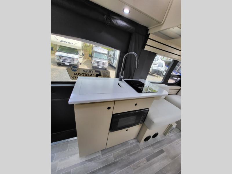 Plan to see the country in this Class B gas motorhome that includes everything you need while away from home. The power sofa with memory foam cushions will provide a great night's rest after traveling all day and the convenient wet bath with a handheld shower will allow you to clean up each morning. Prepare breakfast on the one burner induction stove top and you'll also find a microwave oven for quick meals. Food for the week can go in the 12V 3.2 cu.ft refrigerator/freezer and the overhead compartments can hold all the snacks. This model also includes a Lagun table mount system with 360 degree swivel top so you can enjoy coffee with your loved one.