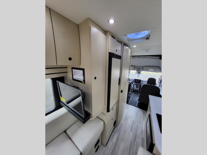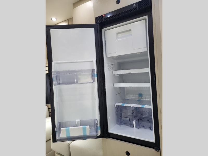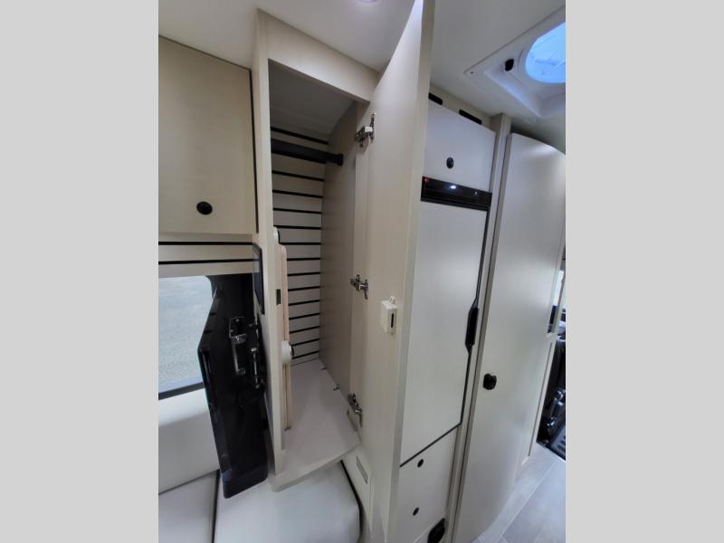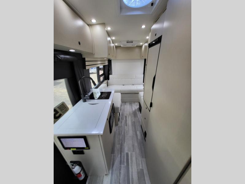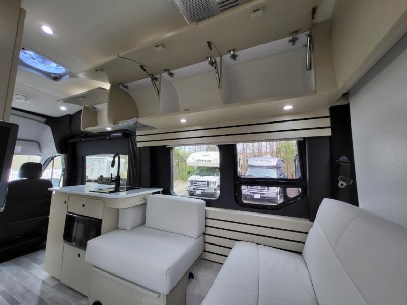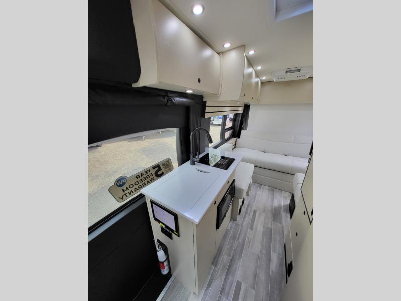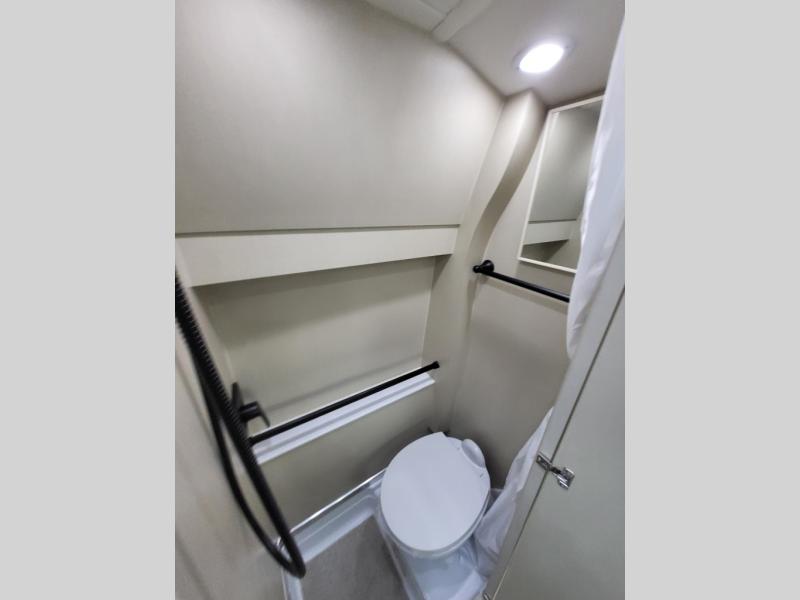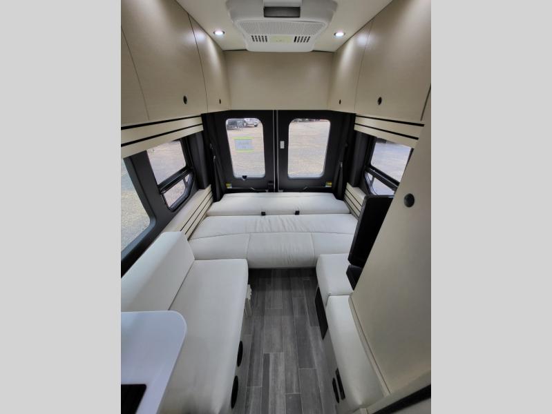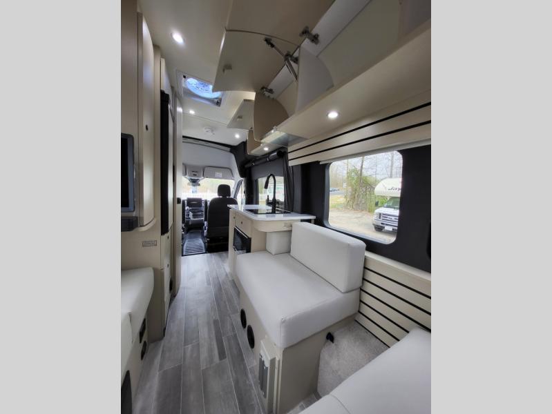 Plan to see the country in this Class B gas motorhome that includes everything you need while away from home. The power sofa with memory foam cushions will provide a great night's rest after traveling all day and the convenient wet bath with a handheld shower will allow you to clean up each morning. Prepare breakfast on the one burner induction stove top and you'll also find a microwave oven for quick meals. Food for the week can go in the 12V 3.2 cu.ft refrigerator/freezer and the overhead compartments can hold all the snacks. This model also includes a Lagun table mount system with 360 degree swivel top so you can enjoy coffee with your loved one.