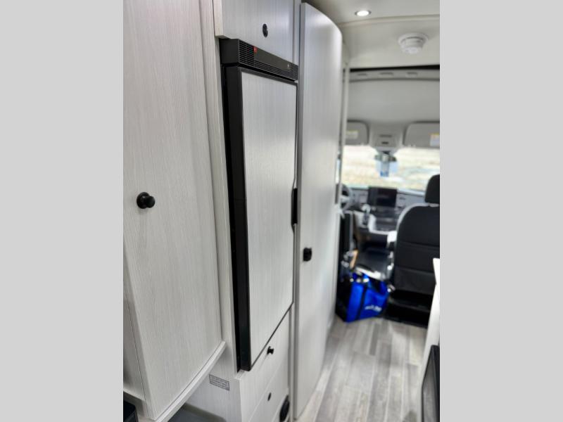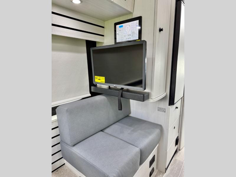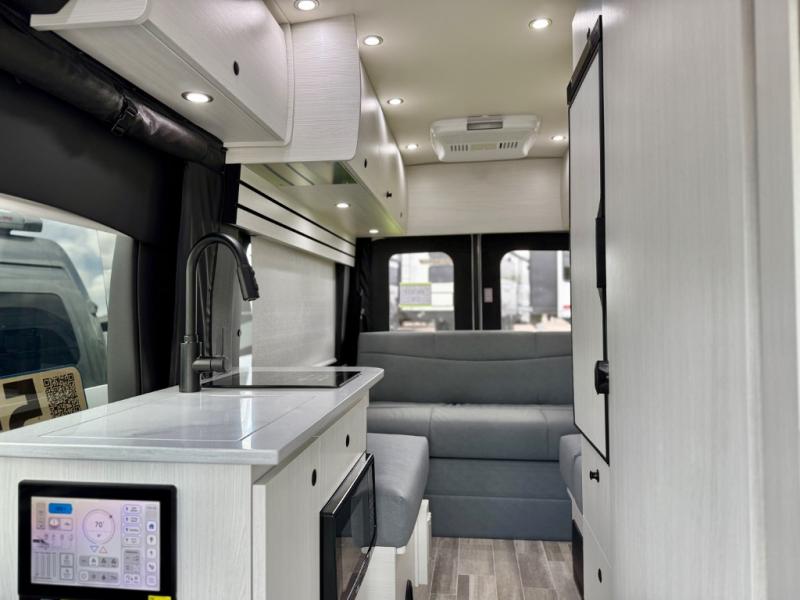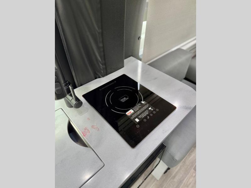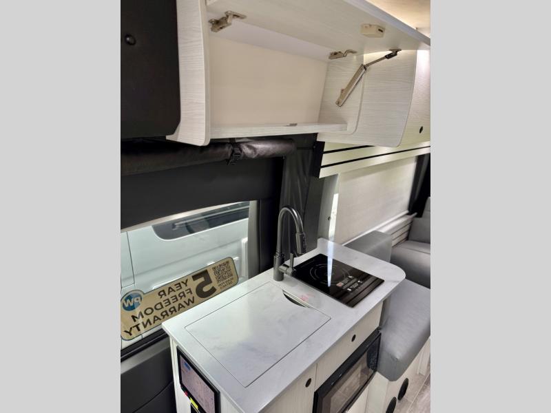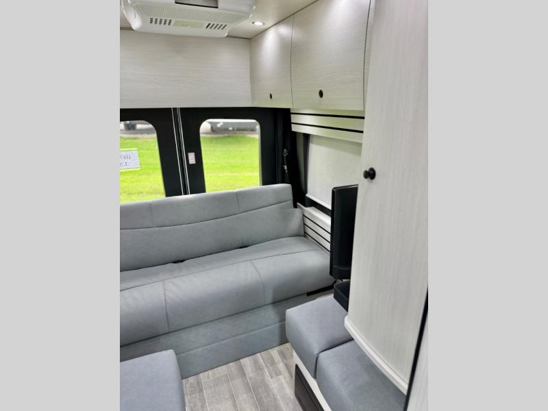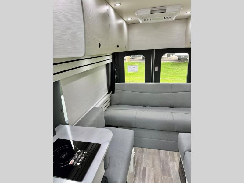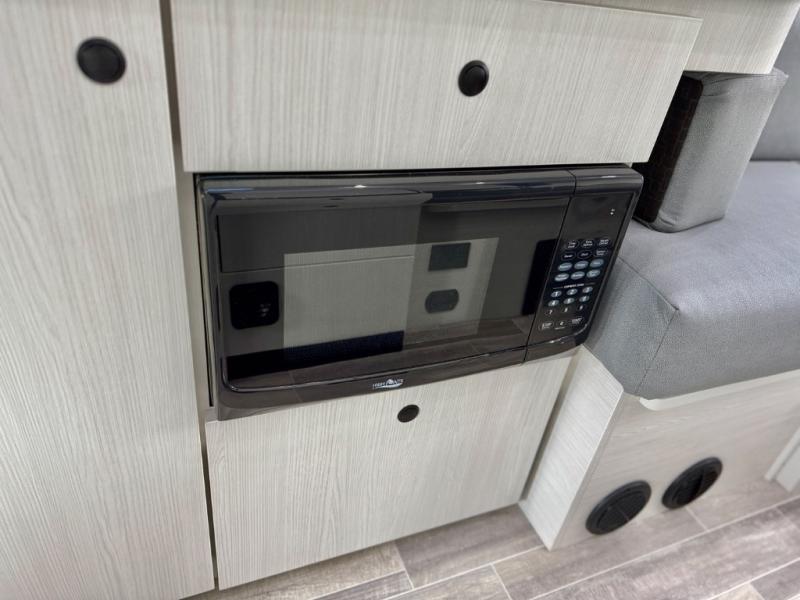 Plan to see the country in this Class B gas motorhome that includes everything you need while away from home. The power sofa with memory foam cushions will provide a great night's rest after traveling all day and the convenient wet bath with a handheld shower will allow you to clean up each morning. Prepare breakfast on the one burner induction stove top and you'll also find a microwave oven for quick meals. Food for the week can go in the 12V 3.2 cu.ft refrigerator/freezer and the overhead compartments can hold all the snacks. This model also includes a Lagun table mount system with 360 degree swivel top so you can enjoy coffee with your loved one.
