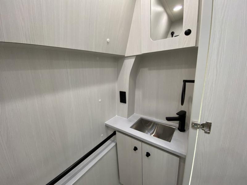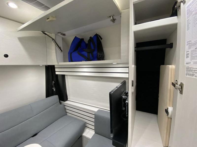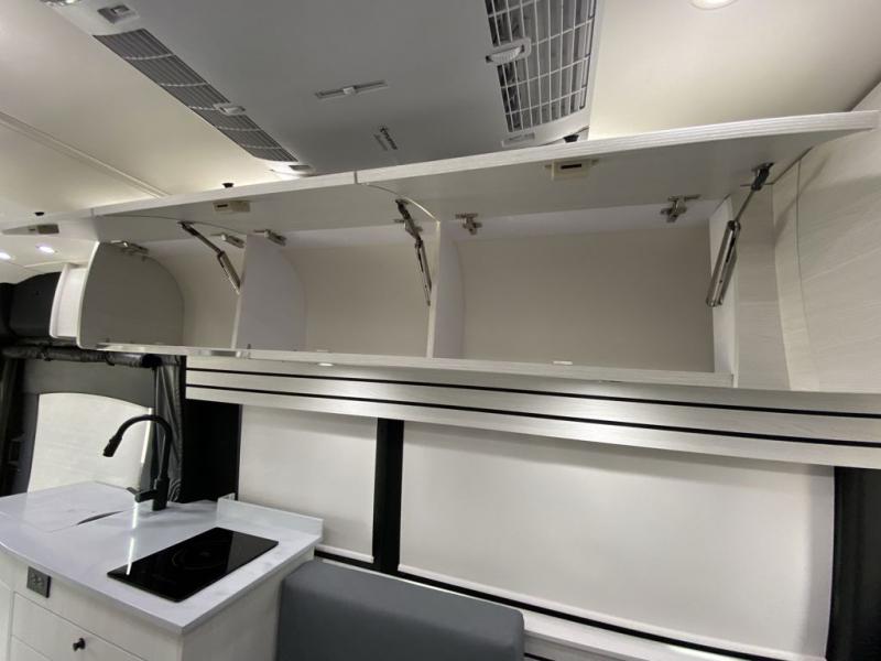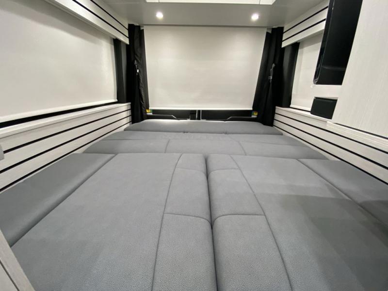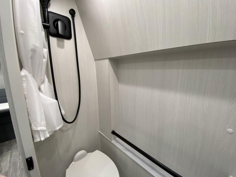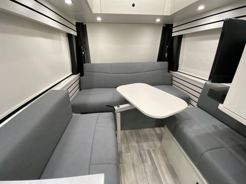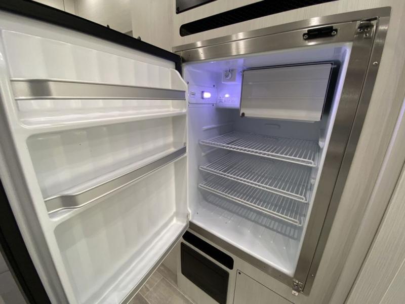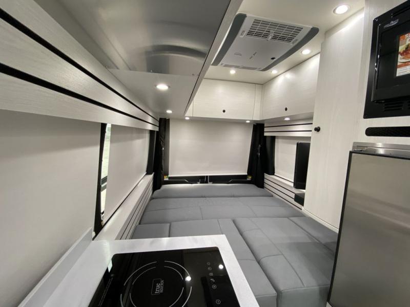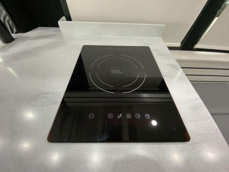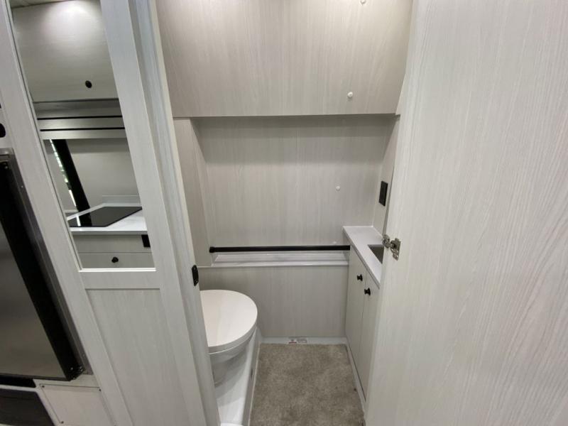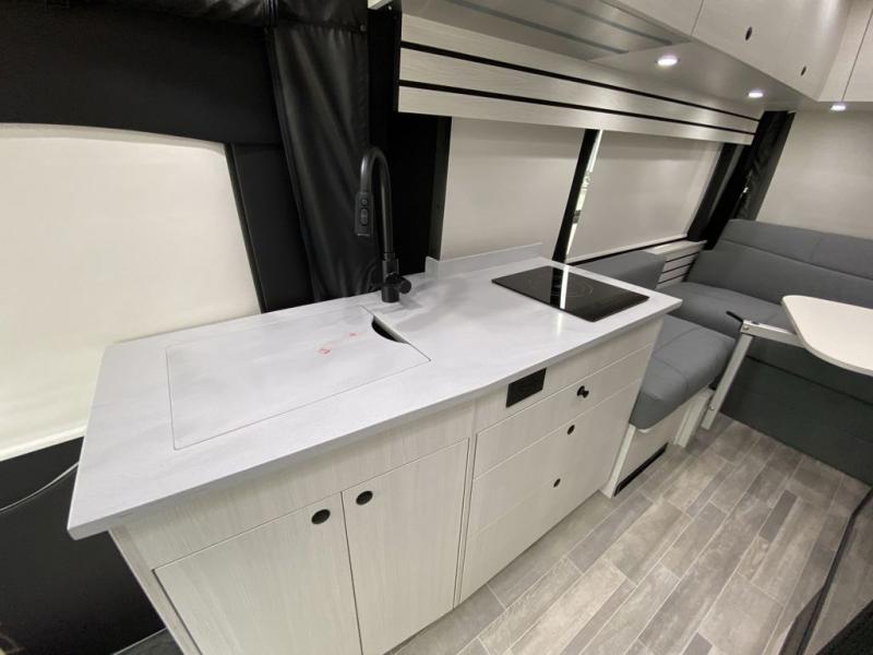 This 2.2 Ontour model is similar to model 2.0, but with a larger refrigerator, and more storage space in the bath. The rear power sofa converts to a 68" x 76" queen-sized bed with memory foam cushions for all-around comfort and the wet bath allows you to clean up each day. There is also a vanity with storage, a sink, and a Corian countertop in the bath for added convenience. Prepare meals either on the one burner induction stove top or in the microwave oven and clean up will be a breeze with a stainless steel sink that includes a high-arc faucet.