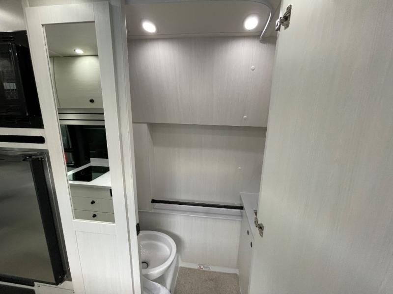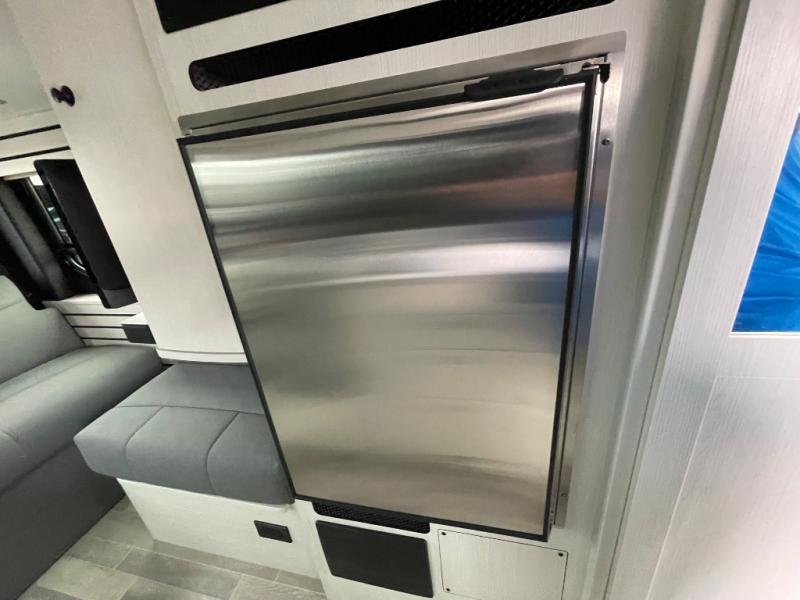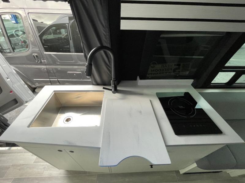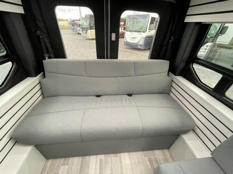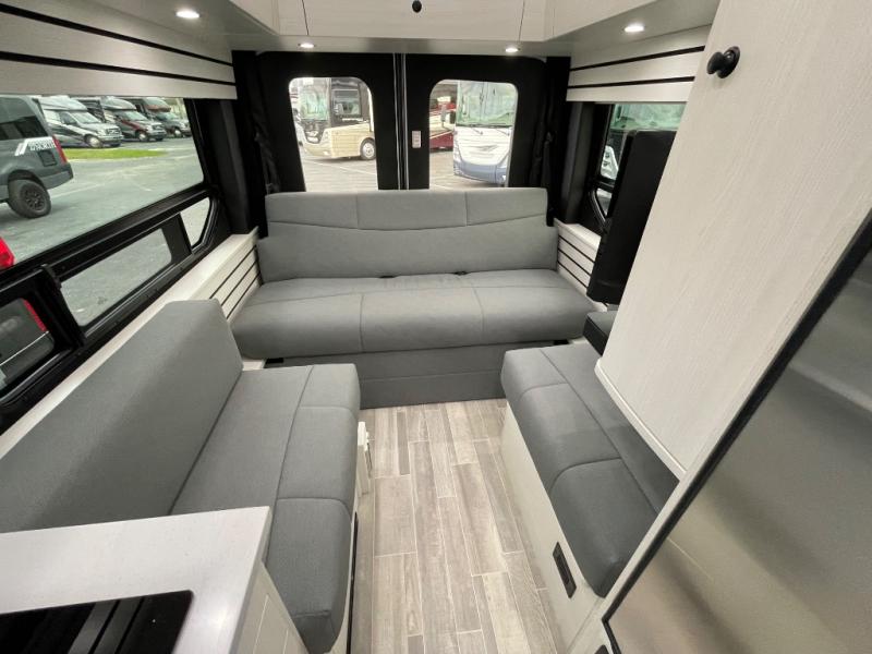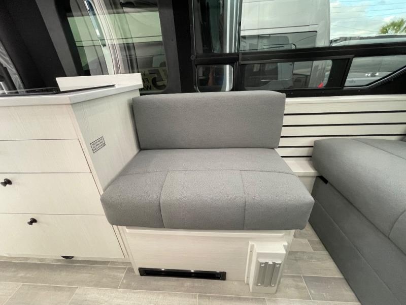 This 2.2 Ontour model is similar to model 2.0, but with a larger refrigerator, and more storage space in the bath. The rear power sofa converts to a 68" x 76" queen-sized bed with memory foam cushions for all-around comfort and the wet bath allows you to clean up each day. There is also a vanity with storage, a sink, and a Corian countertop in the bath for added convenience. Prepare meals either on the one burner induction stove top or in the microwave oven and clean up will be a breeze with a stainless steel sink that includes a high-arc faucet.