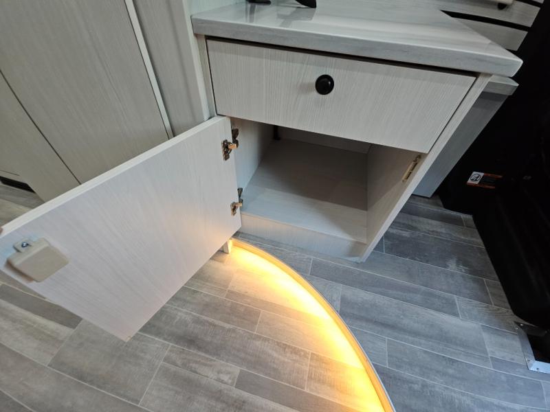 This Plateau Class B diesel motorhome features two dining locations for you to enjoy your delicious meals at thanks to the innovative Lagun table. There is also an array of storage options between the overhead cabinets, the soft-close drawers, and the pull-out pantry. If you have to get a little bit of work done while on the road, then you will love the front lounge workstation with a 120V power outlet, USB charging ports, and an extended Corian countertop with a privacy shade and storage cabinets too. The microwave makes it easy for you to pop a bag of popcorn and enjoy eating it while you relax on the power sofa with memory foam sofa cushions!
