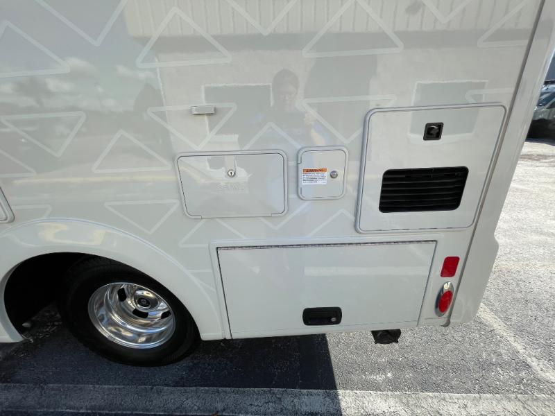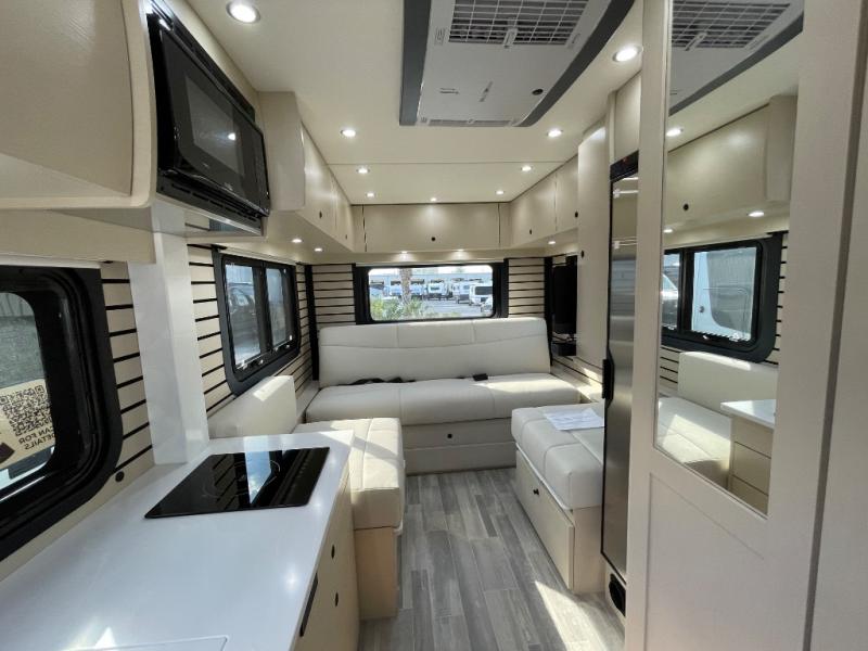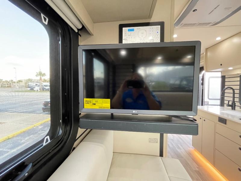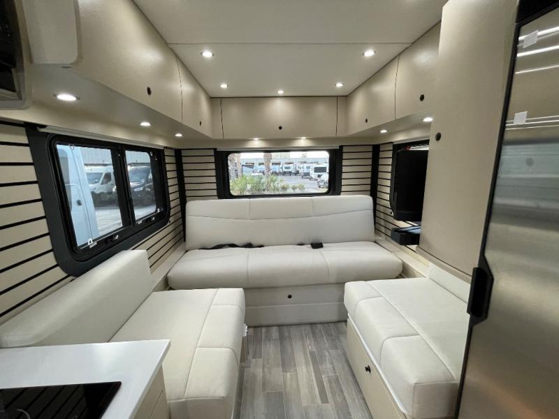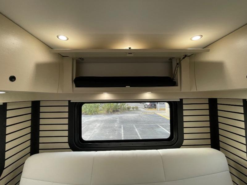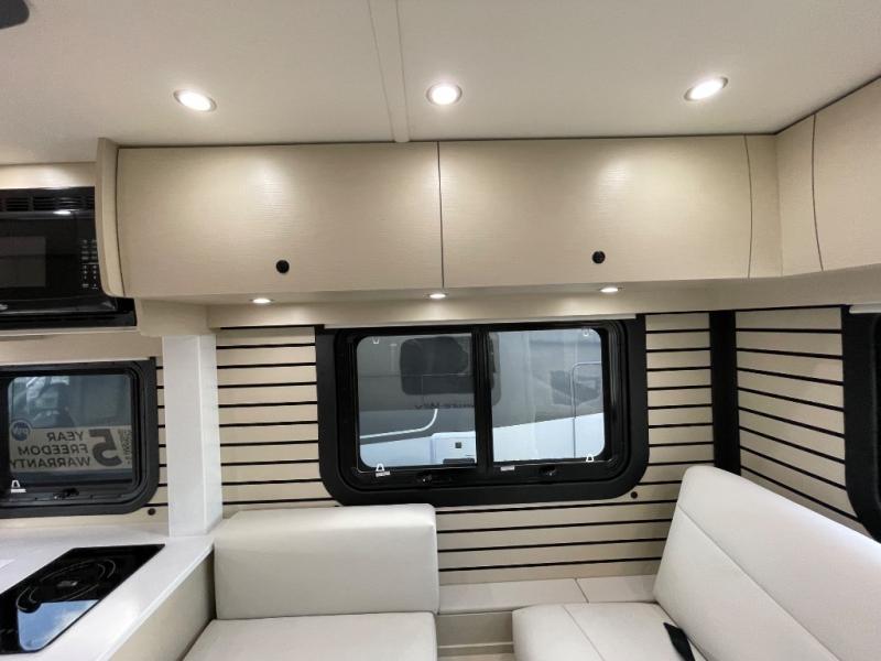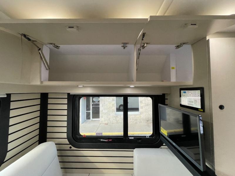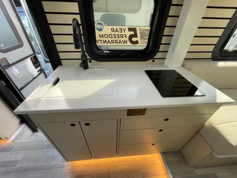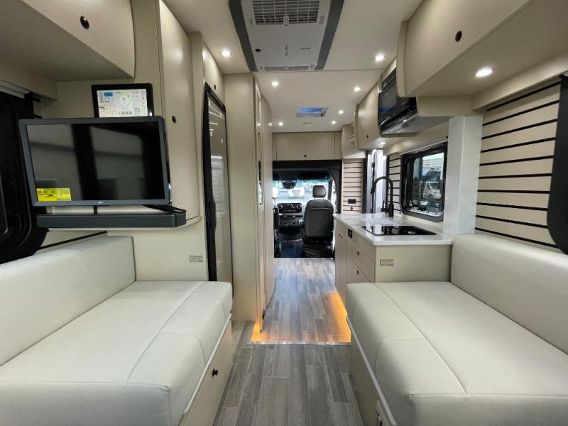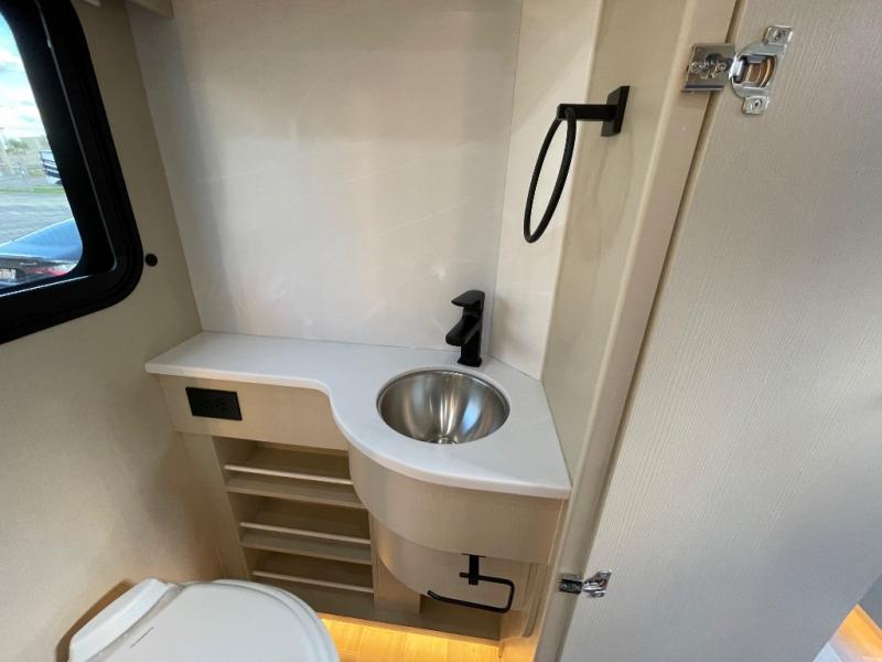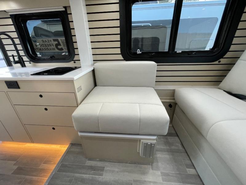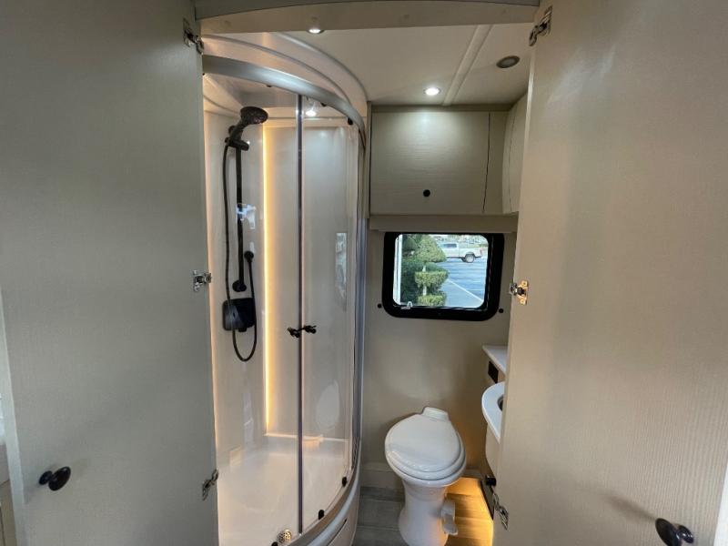 You and your spouse or friend will love touring the country in this comfortable motorhome! After a long day of traveling, freshen up in the full bathroom with the 32" radius shower that is Corian-lined, has a handheld showerhead, a large vanity with storage shelves, and even a towel rack. Prepare your best home cooked meals while on the road with the one burner induction stove, microwave, and 12V 5.3 cu. ft. Norcold refrigerator. Your meals can be enjoyed at the rear electric sofa with Lagun table, and it also transforms into a 75" x 74" queen bed for you to get a good night's rest each night. You even have an inflatable air bed that is fitted for the cab so an extra guest or two can tag along. If mother nature rains on your parade then you can watch your favorite movies on the 24" Smart LED TV with swing out mount and a Winegard Rayzar automatic HDTV antenna!