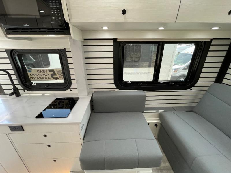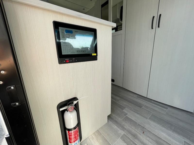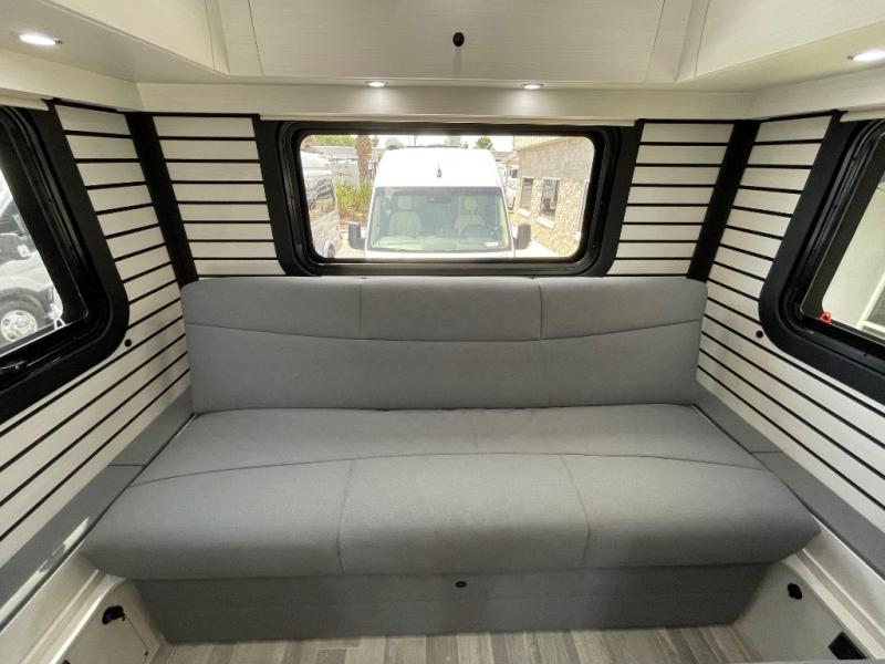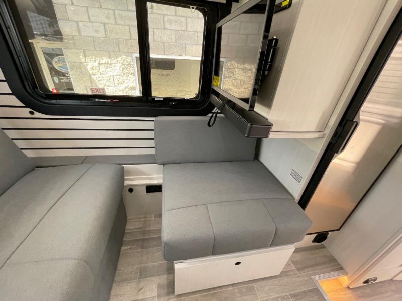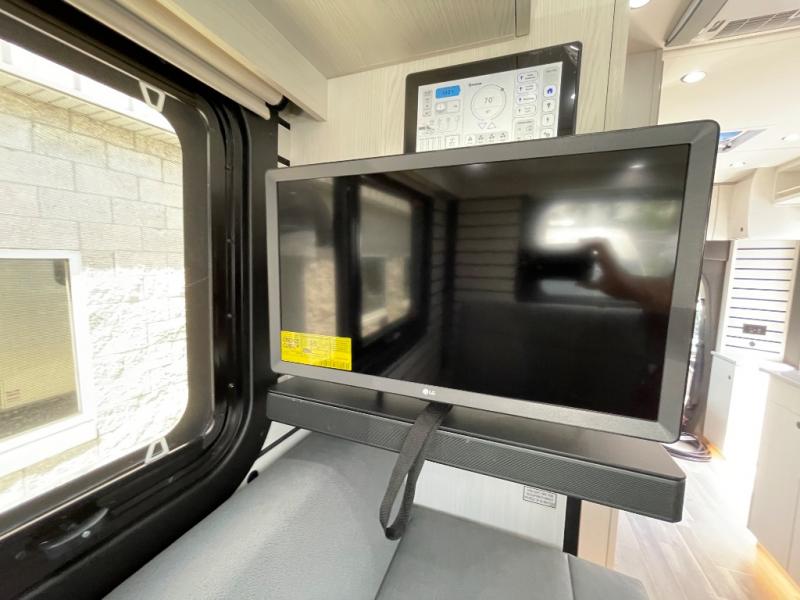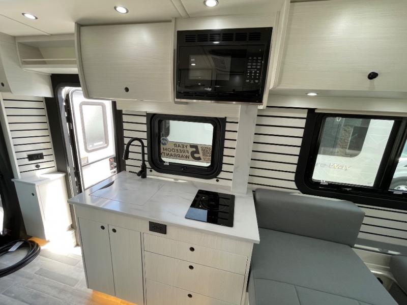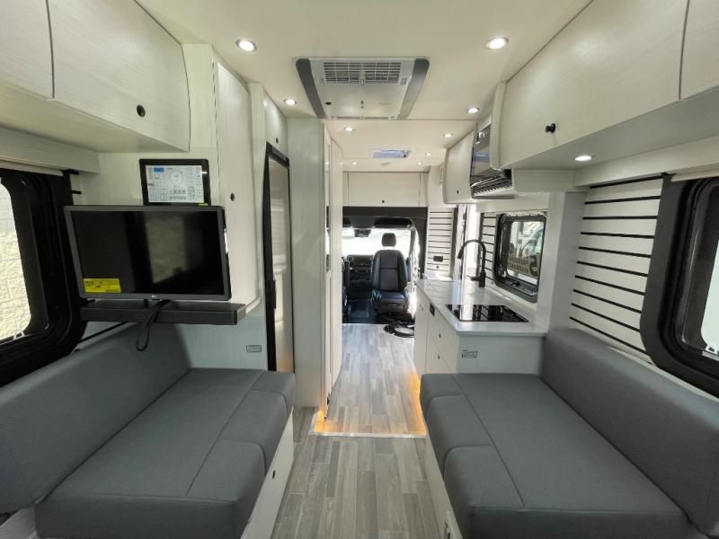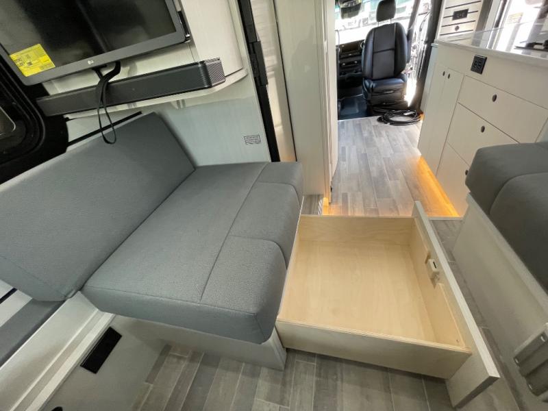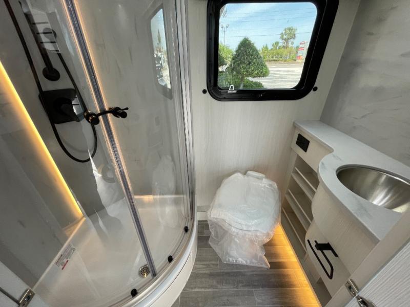 You and your spouse or friend will love touring the country in this comfortable motorhome! After a long day of traveling, freshen up in the full bathroom with the 32" radius shower that is Corian-lined, has a handheld showerhead, a large vanity with storage shelves, and even a towel rack. Prepare your best home cooked meals while on the road with the one burner induction stove, microwave, and 12V 5.3 cu. ft. Norcold refrigerator. Your meals can be enjoyed at the rear electric sofa with Lagun table, and it also transforms into a 75" x 74" queen bed for you to get a good night's rest each night. You even have an inflatable air bed that is fitted for the cab so an extra guest or two can tag along. If mother nature rains on your parade then you can watch your favorite movies on the 24" Smart LED TV with swing out mount and a Winegard Rayzar automatic HDTV antenna!