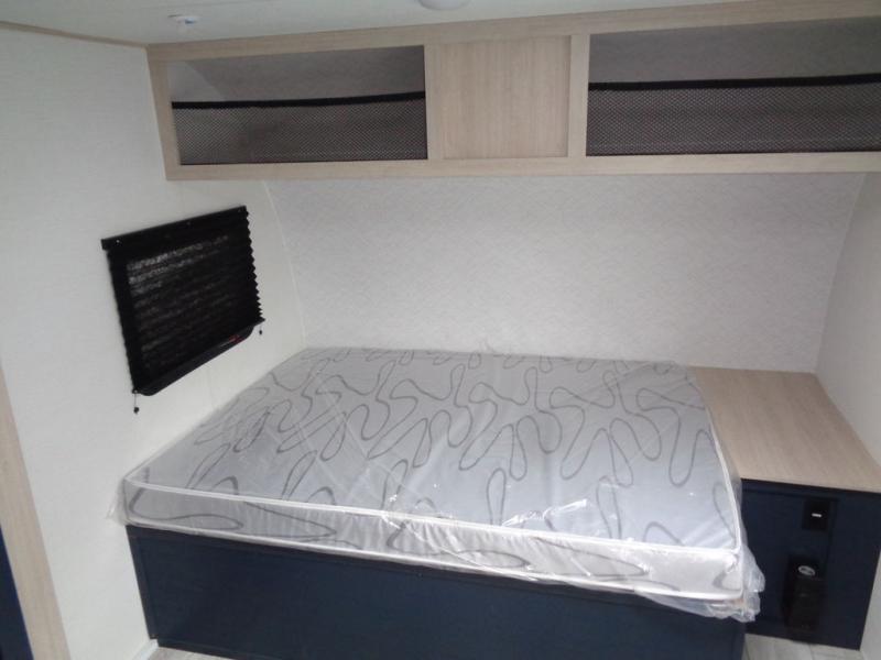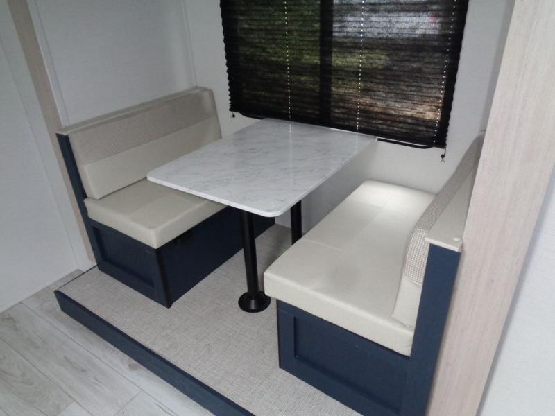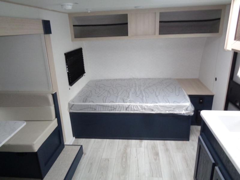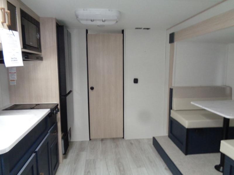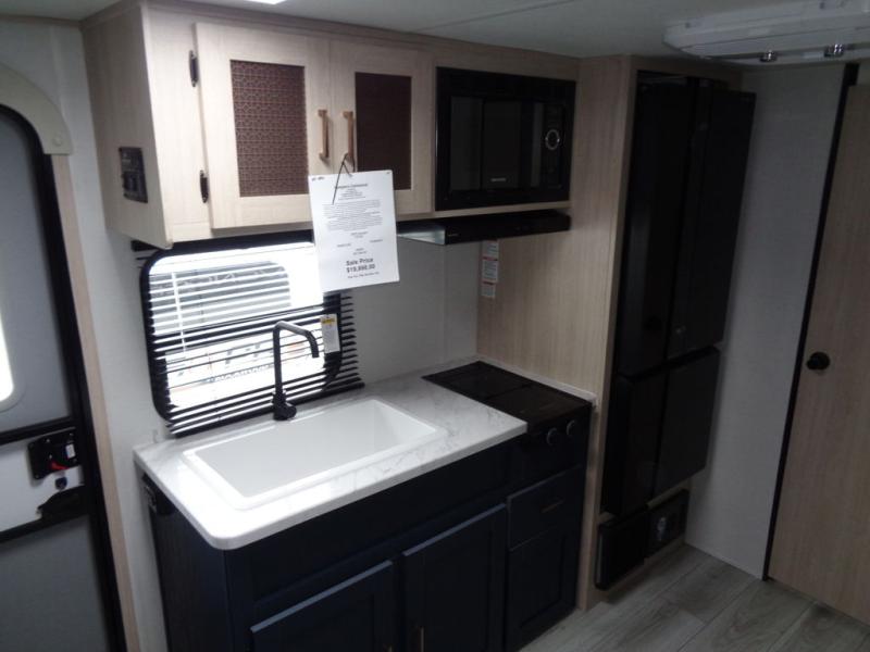 Enjoy a little more floor space in this trailer thanks to the dinette slide that can be utilized as a dining, gaming and/or sleeping space. The front walk-around queen bed offers overhead storage and dual wardrobes to keep this area tidy. The galley kitchen includes everything you need to make warm meals, and store leftovers in the 10.7 cu. ft. 12V refrigerator, plus there is a pantry for dry good storage. The rear bathroom offers privacy and convenience when changing and getting cleaned up, and there is also linen storage which is handy.