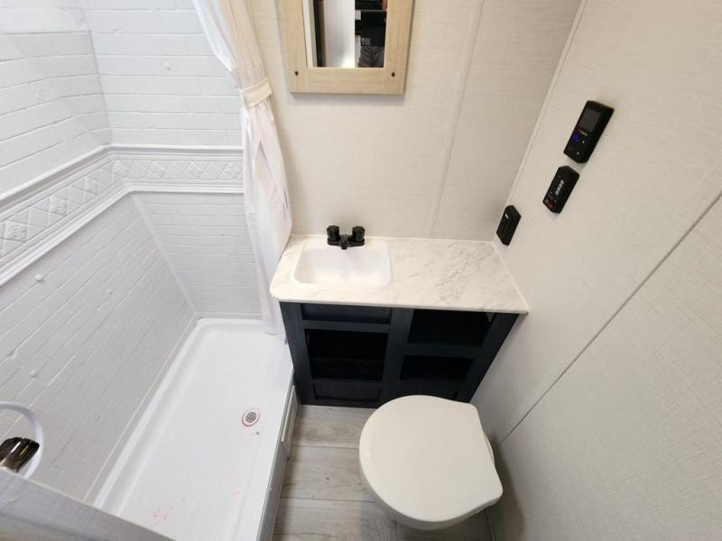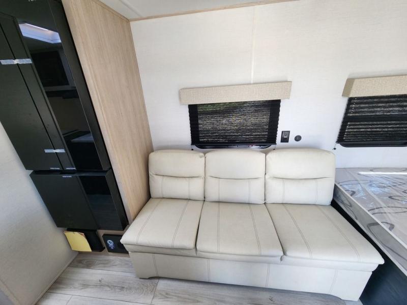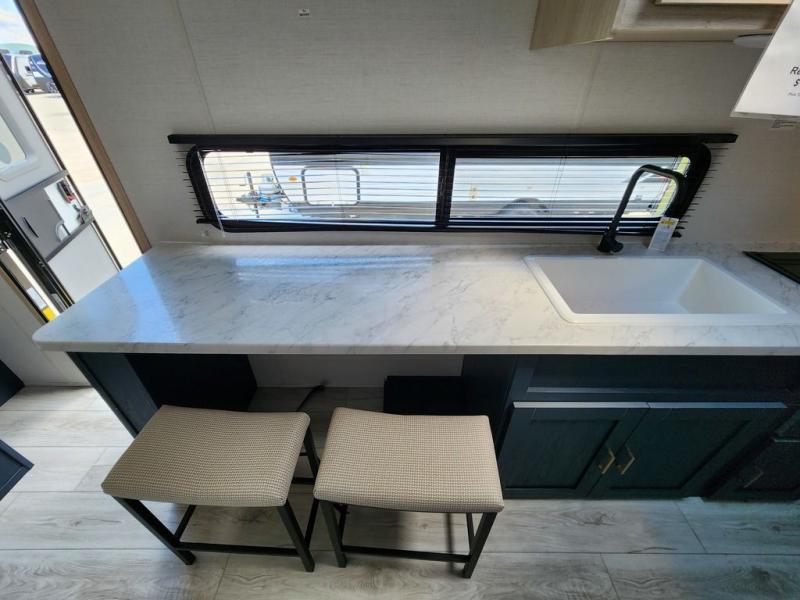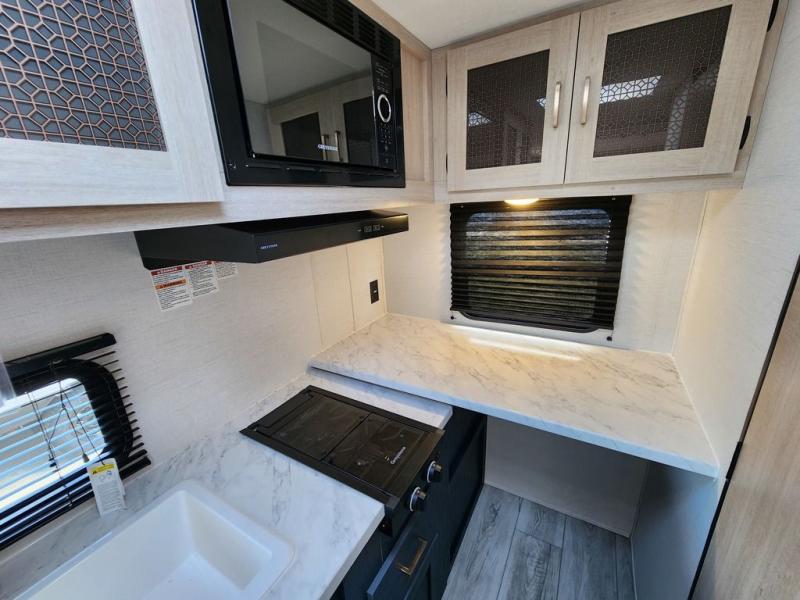 Camping in this travel trailer will be just what the doctor ordered! The rear corner kitchen includes ample counter space to prep meals, along with a desktop if you need to get some work done. The bartop with two stools will provide a place to dine together, and the sofa lets you relax in the evenings. Cook all of your meals on the two burner cooktop or in the electric microwave, and store your food in the 10.7 cu. ft. 12V refrigerator. A full bath lets you freshen up before bed, and the nightstand at the foot of the queen bed will keep your belongings tucked away!
