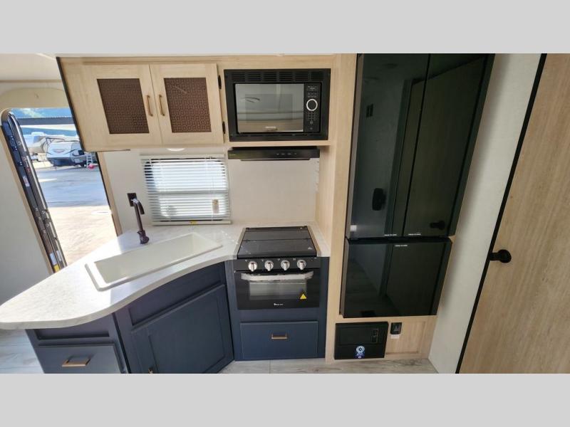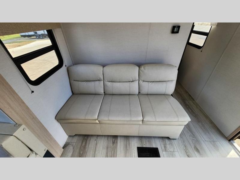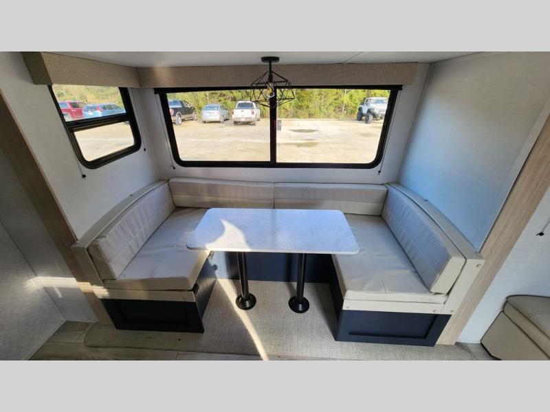 This rear bath travel trailer offers privacy to change and get cleaned up as well as linen storage so you will have everything you need in one place. The walk-around queen bed in the private bedroom, plus the furniture which folds down into extra sleeping space at night allows five or six to sleep comfortably after hiking or relaxing and enjoying the outdoors. The cook will appreciate the three-burner range to make snacks and meals to eat at the U-shaped dinette slide or outside under the 15' power awning that creates a covered outdoor living area protected from the elements.