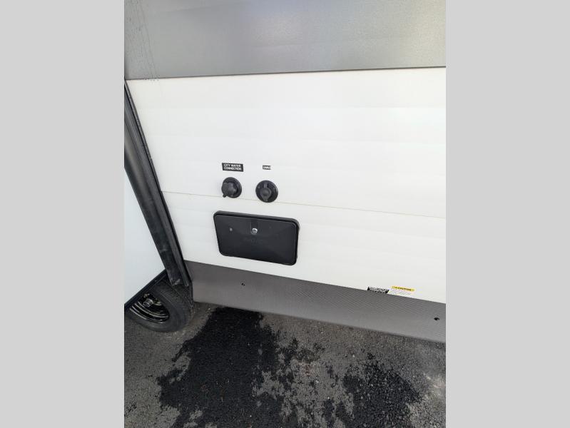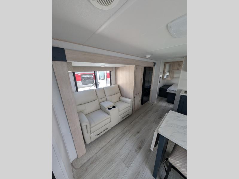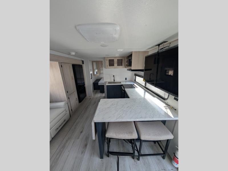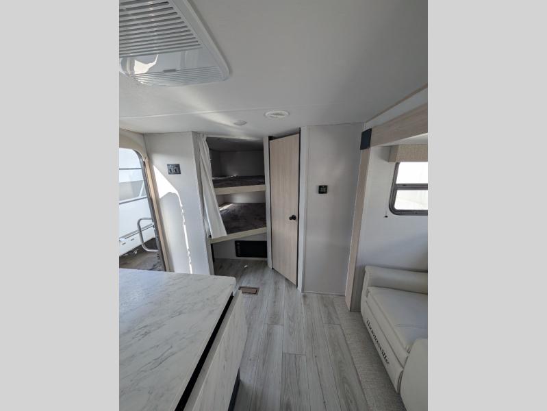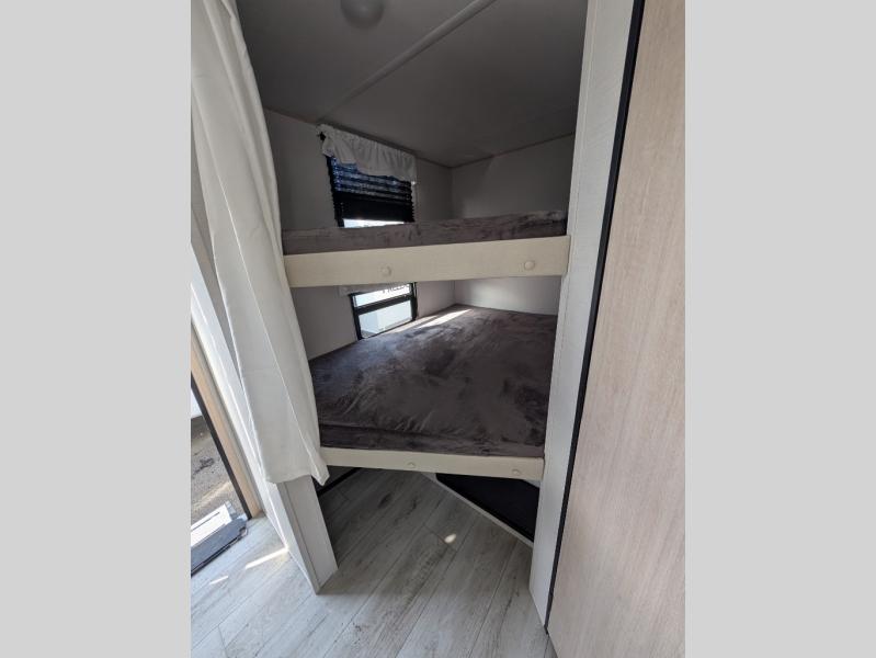 Head to your local state park in this spacious travel trailer! The exterior kitchen is sure to be a big bonus with the chef of your group, and they'll also find a fully-equipped interior kitchen as well. An L-shaped counter with two chairs provides a place to enjoy your morning coffee at, or you may find yourselves on the theater seat within the large slide out. The French door refrigerator and pantry is also found here and can hold all your food for the week. You'll feel right at home in the front private bedroom that includes a queen bed, dual wardrobes, and an overhead cabinet for even more storage, while your guests take the double-size bunks in the back!