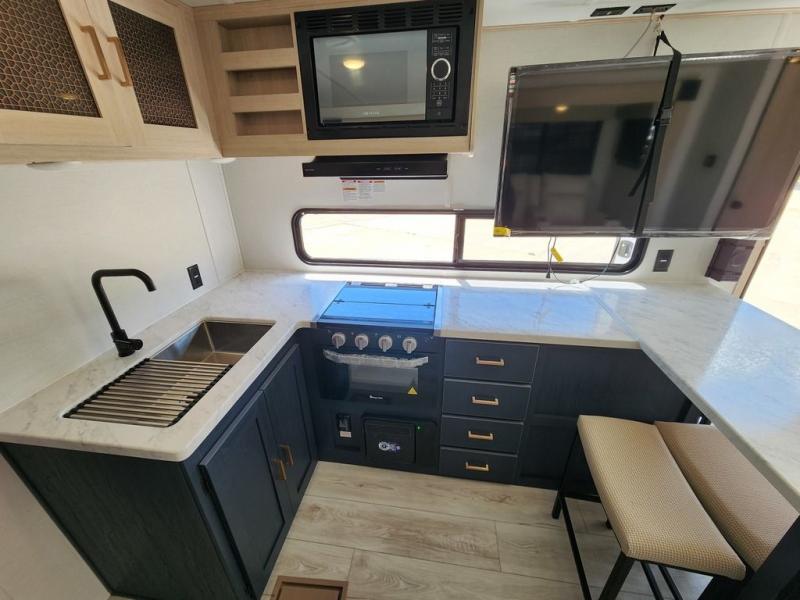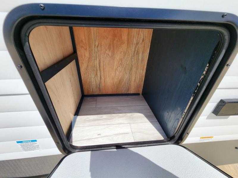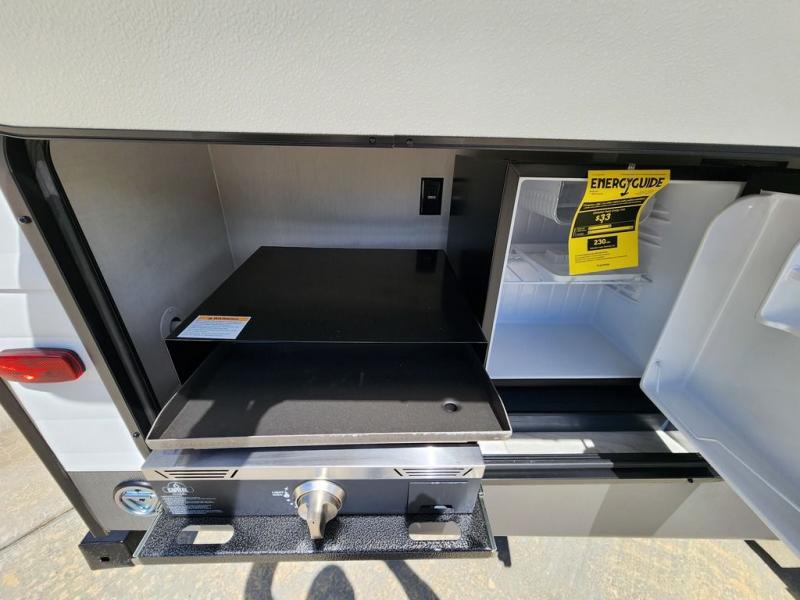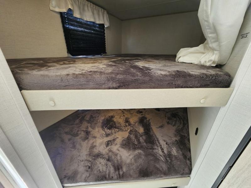 Head to your local state park in this spacious travel trailer! The exterior kitchen is sure to be a big bonus with the chef of your group, and they'll also find a fully-equipped interior kitchen as well. An L-shaped counter with two chairs provides a place to enjoy your morning coffee at, or you may find yourselves on the theater seat within the large slide out. The French door refrigerator and pantry is also found here and can hold all your food for the week. You'll feel right at home in the front private bedroom that includes a queen bed, dual wardrobes, and an overhead cabinet for even more storage, while your guests take the double-size bunks in the back!