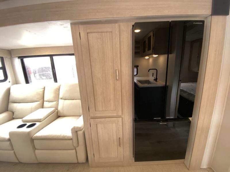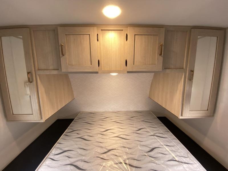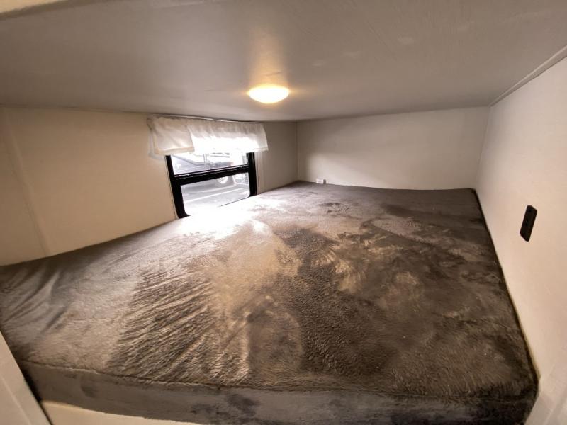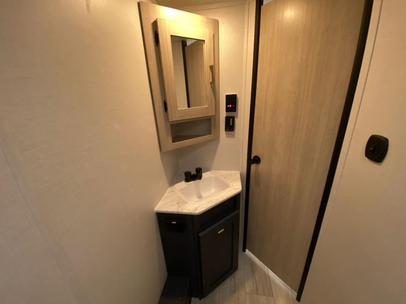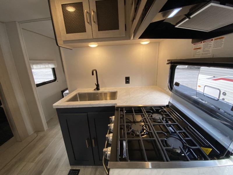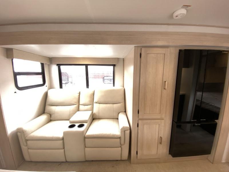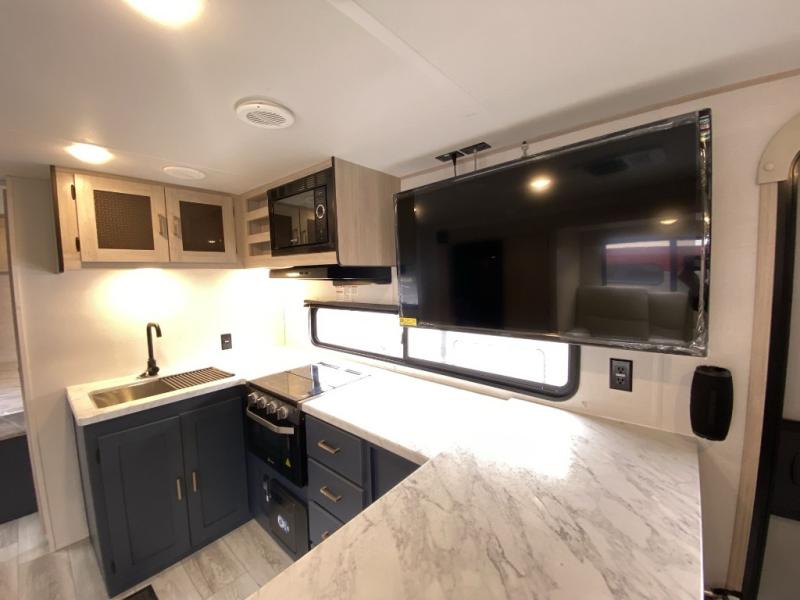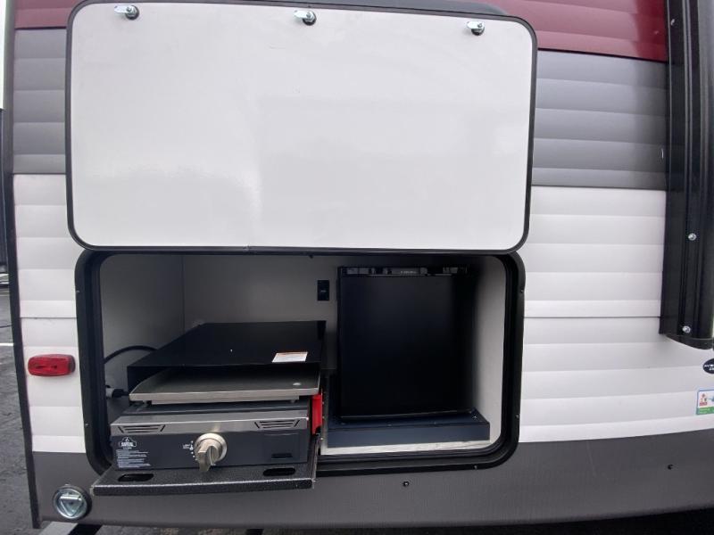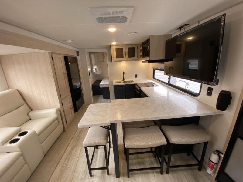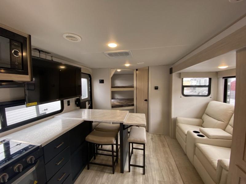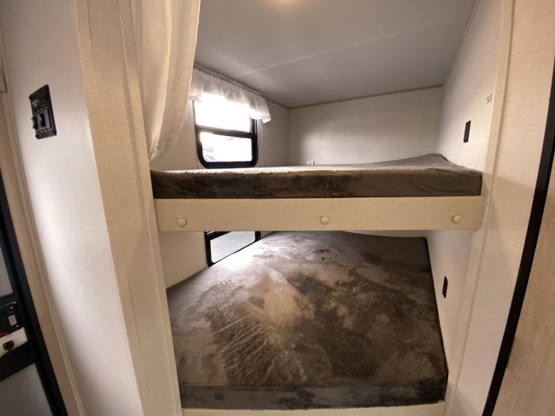 Head to your local state park in this spacious travel trailer! The exterior kitchen is sure to be a big bonus with the chef of your group, and they'll also find a fully-equipped interior kitchen as well. An L-shaped counter with two chairs provides a place to enjoy your morning coffee at, or you may find yourselves on the theater seat within the large slide out. The French door refrigerator and pantry is also found here and can hold all your food for the week. You'll feel right at home in the front private bedroom that includes a queen bed, dual wardrobes, and an overhead cabinet for even more storage, while your guests take the double-size bunks in the back!
