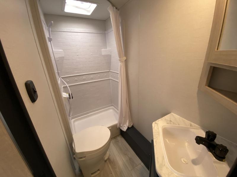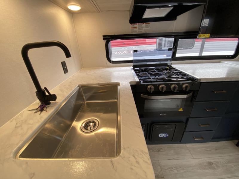 With any Avenger travel trailer by Prime Time, the exterior includes an aerodynamic smooth front metal, a diamond plate front rock guard for protection on the road, and four stabilizer jacks to keep your unit secure. There is a fully walkable roof plus an enclosed and heated underbelly that will help extend your camping season. The interior offers a 15,000 BTU air conditioner for the perfect climate inside, in-floor ducted heat, a systems monitor panel, and a Winegard 360+ antenna with Wi-Fi prep that will give you the option to stay connected as you camp. Each model also includes seamless Carefree Congoleum flooring, kitchen backsplash, shower pans in all models, and pleated nightshades throughout to name a few interior comforts!