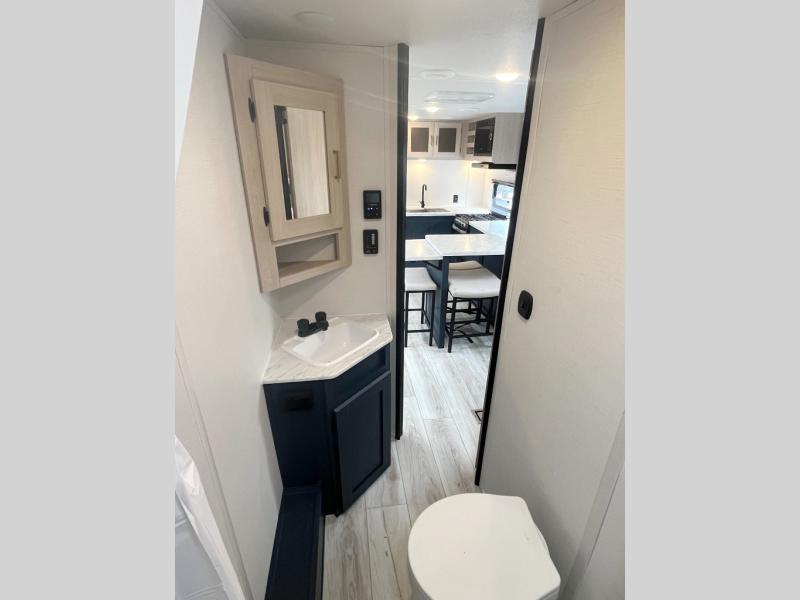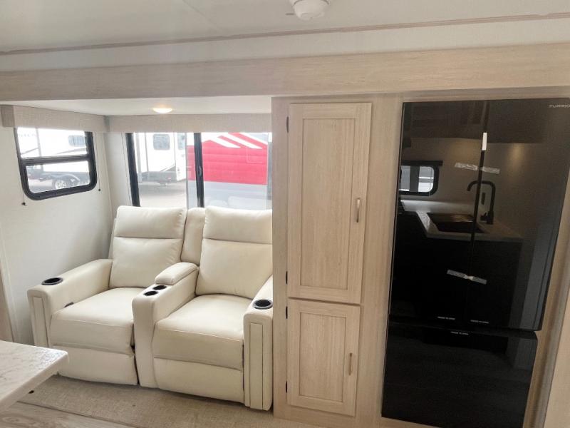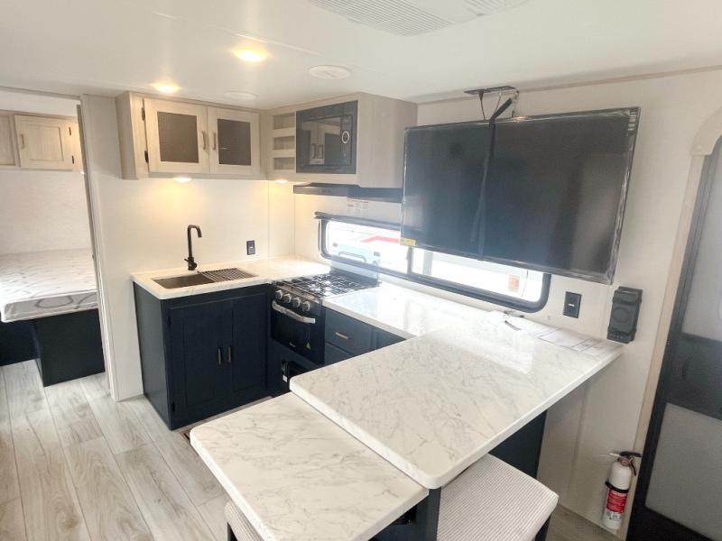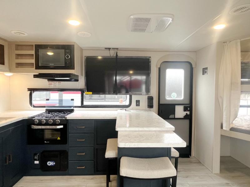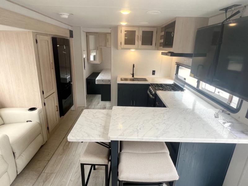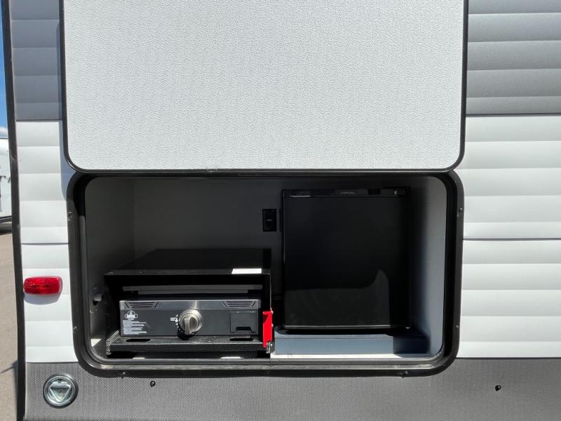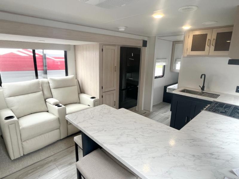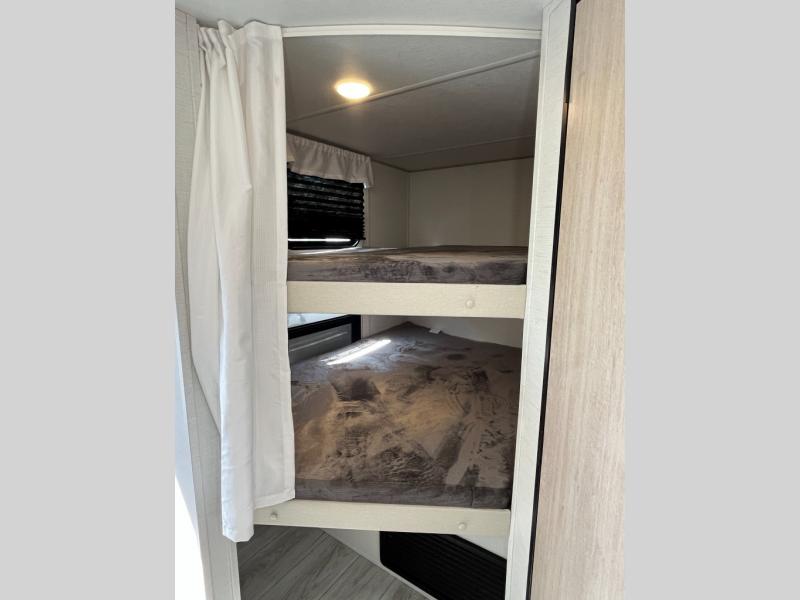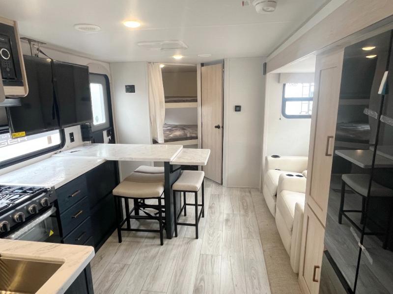 Head to your local state park in this spacious travel trailer! The exterior kitchen is sure to be a big bonus with the chef of your group, and they'll also find a fully-equipped interior kitchen as well. An L-shaped counter with two chairs provides a place to enjoy your morning coffee at, or you may find yourselves on the theater seat within the large slide out. The French door refrigerator and pantry is also found here and can hold all your food for the week. You'll feel right at home in the front private bedroom that includes a queen bed, dual wardrobes, and an overhead cabinet for even more storage, while your guests take the double-size bunks in the back!