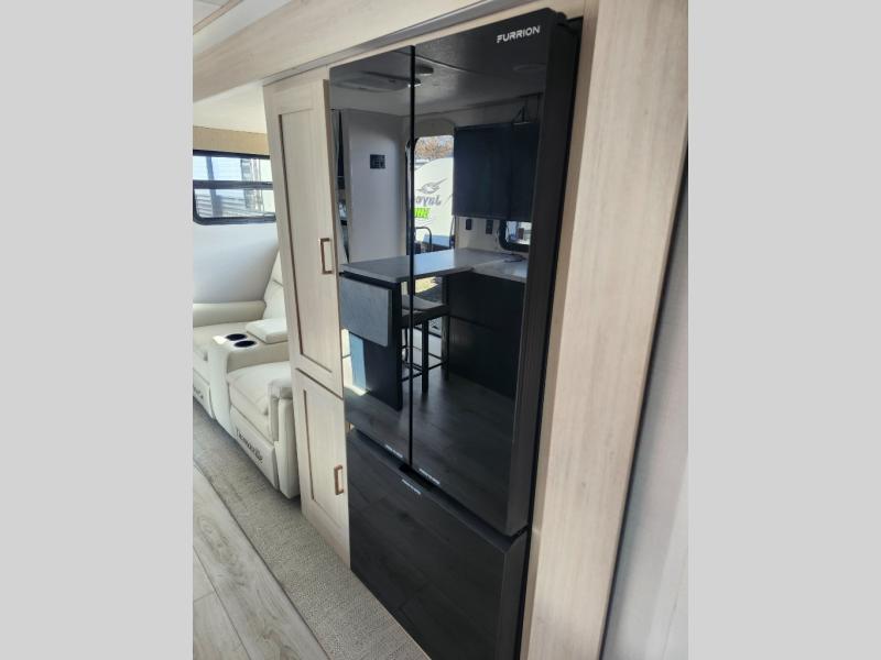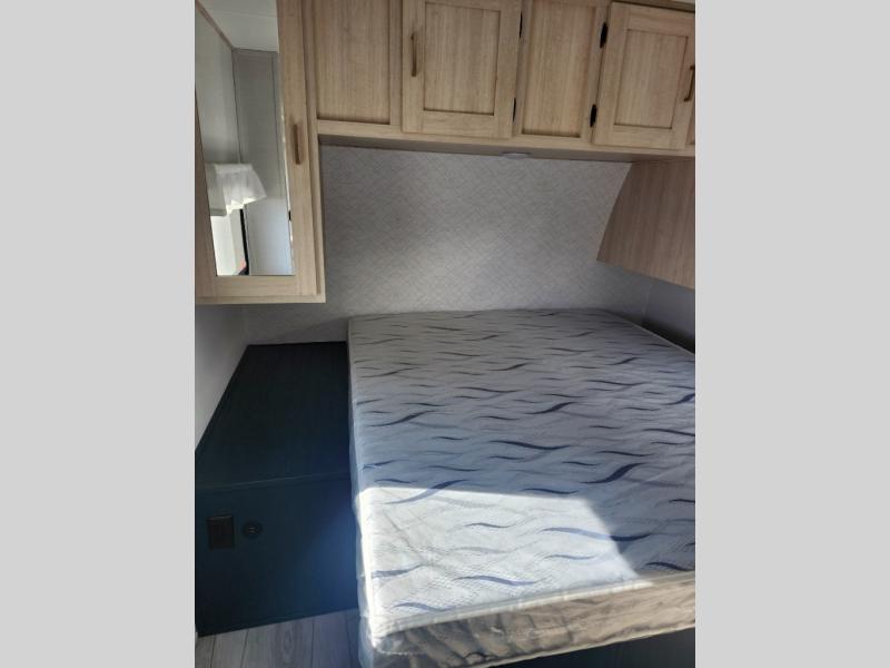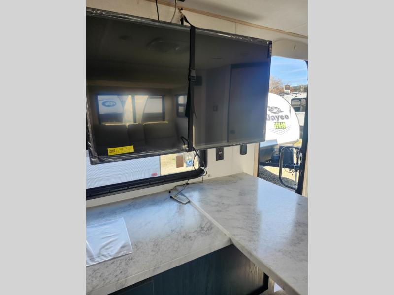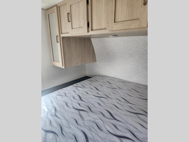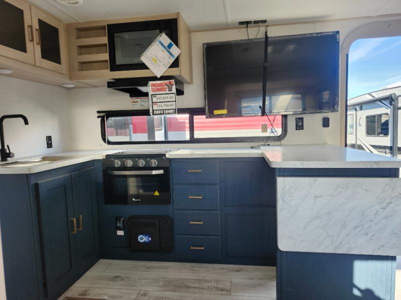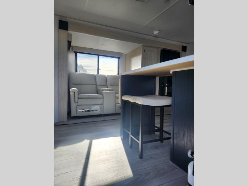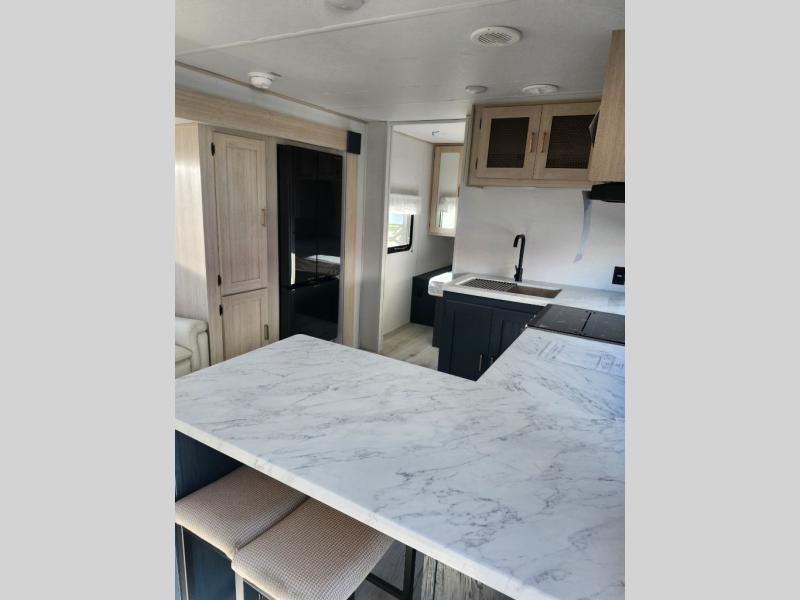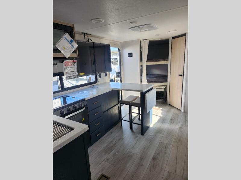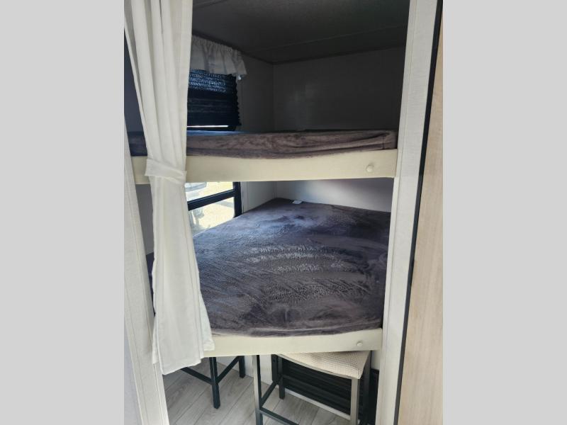 Head to your local state park in this spacious travel trailer! The exterior kitchen is sure to be a big bonus with the chef of your group, and they'll also find a fully-equipped interior kitchen as well. An L-shaped counter with two chairs provides a place to enjoy your morning coffee at, or you may find yourselves on the theater seat within the large slide out. The French door refrigerator and pantry is also found here and can hold all your food for the week. You'll feel right at home in the front private bedroom that includes a queen bed, dual wardrobes, and an overhead cabinet for even more storage, while your guests take the double-size bunks in the back!