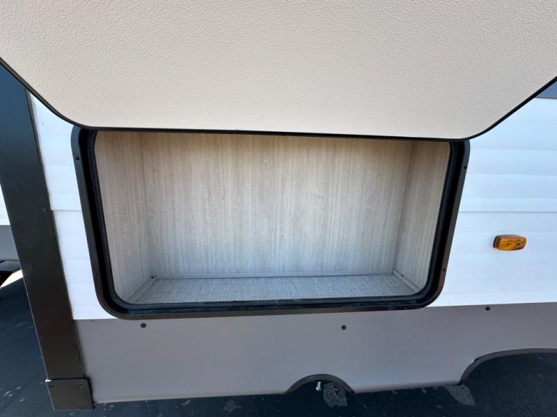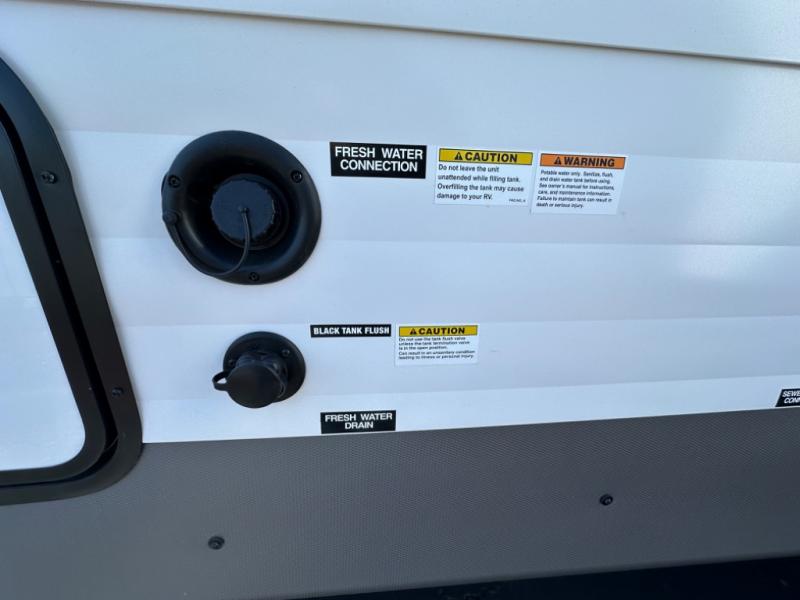 Head to your local state park in this spacious travel trailer! Once you arrive at the campground, you can grab a cold drink from the exterior refrigerator, then head inside to make lunch. An L-shaped counter with two chairs provides a place to enjoy your morning coffee at, or you may find yourselves on the theater seat within the large slide out. The French door refrigerator and pantry is also found here and can hold all your food for the week. You'll feel right at home in the front private bedroom that includes a queen bed, dual wardrobes, and an overhead cabinet for even more storage. This model also includes washer and dryer prep if you choose to add those appliances!
