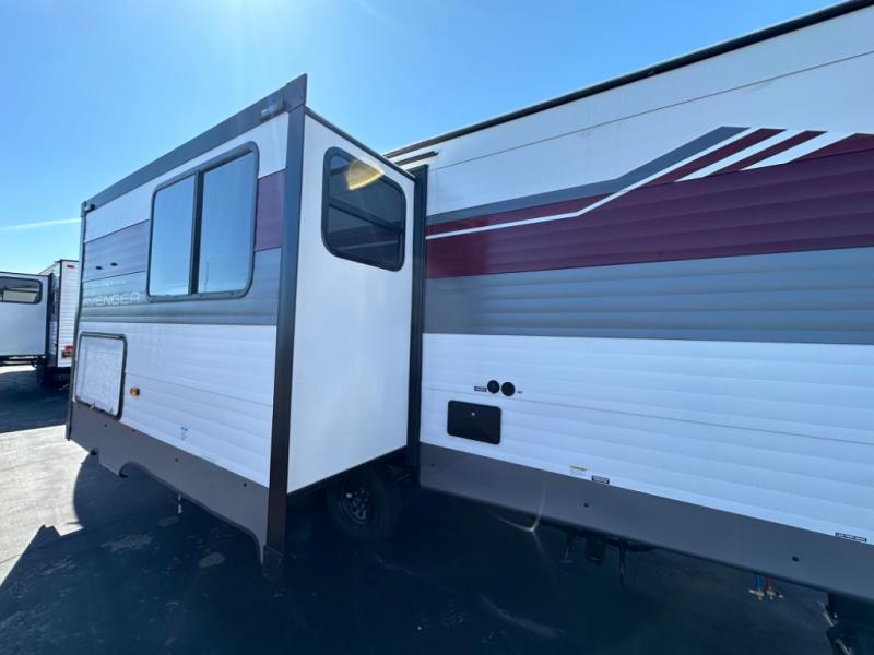 With any Avenger travel trailer by Prime Time, the exterior includes an aerodynamic smooth front metal, a diamond plate front rock guard for protection on the road, and four stabilizer jacks to keep your unit secure. There is a fully walkable roof plus an enclosed and heated underbelly that will help extend your camping season. The interior offers a 15,000 BTU air conditioner for the perfect climate inside, in-floor ducted heat, a systems monitor panel, and a Winegard 360+ antenna with Wi-Fi prep that will give you the option to stay connected as you camp. Each model also includes seamless Carefree Congoleum flooring, kitchen backsplash, shower pans in all models, and pleated nightshades throughout to name a few interior comforts!