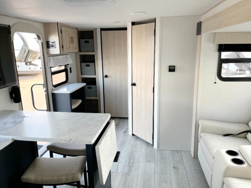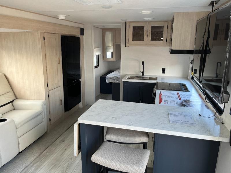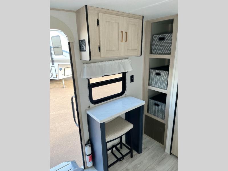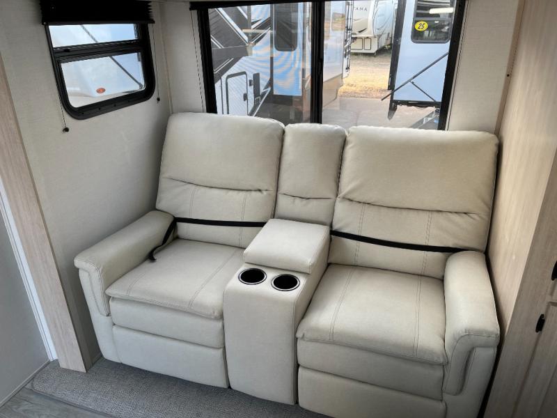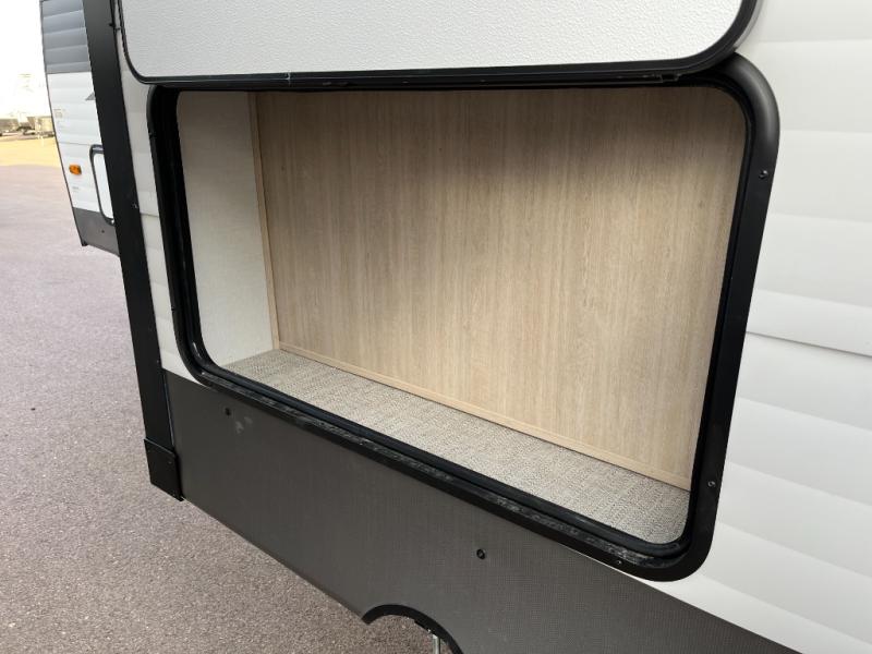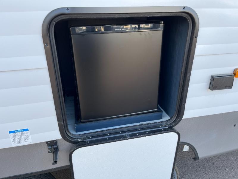Head to your local state park in this spacious travel trailer! Once you arrive at the campground, you can grab a cold drink from the exterior refrigerator, then head inside to make lunch. An L-shaped counter with two chairs provides a place to enjoy your morning coffee at, or you may find yourselves on the theater seat within the large slide out. The French door refrigerator and pantry is also found here and can hold all your food for the week. You'll feel right at home in the front private bedroom that includes a queen bed, dual wardrobes, and an overhead cabinet for even more storage. This model also includes washer and dryer prep if you choose to add those appliances!