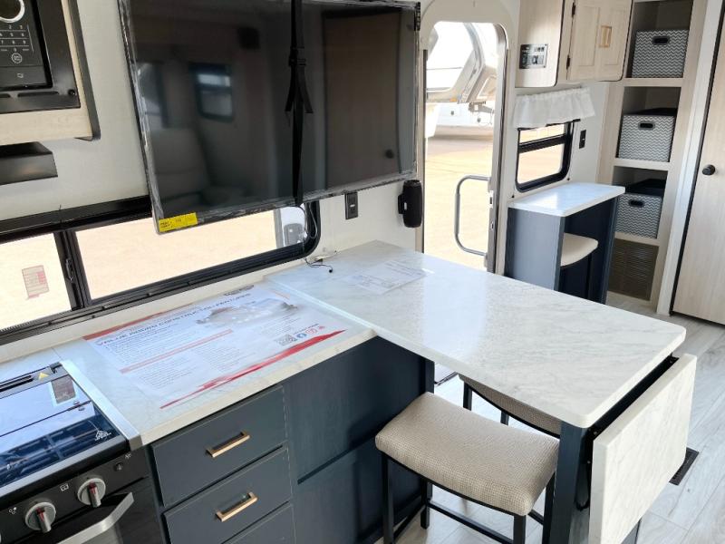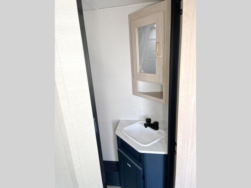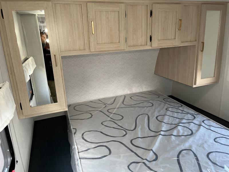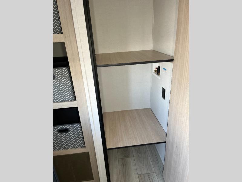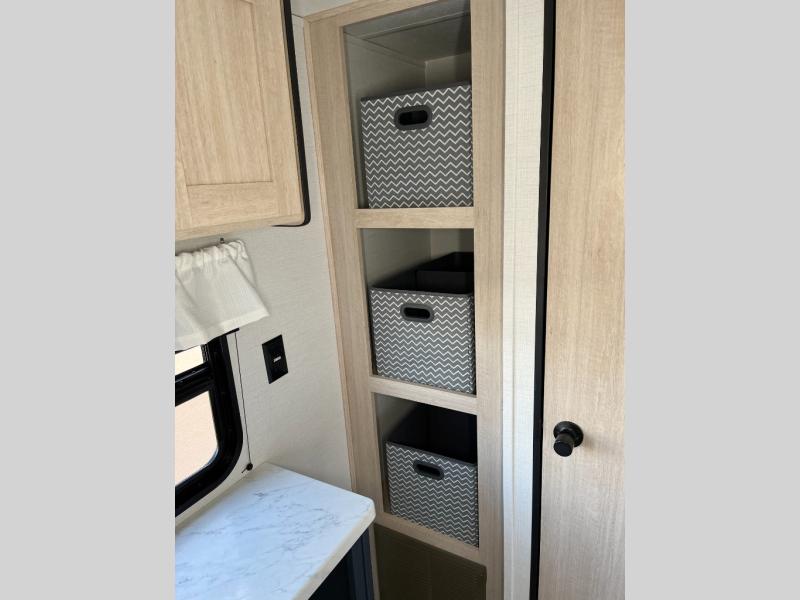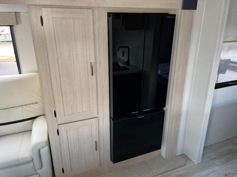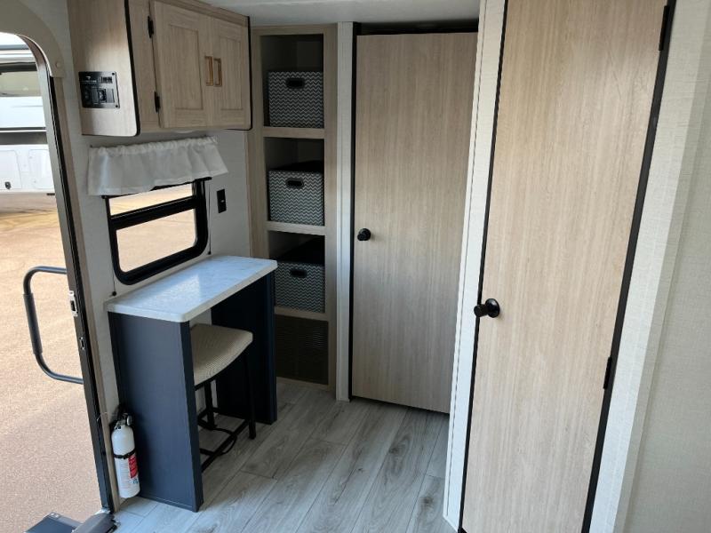 Head to your local state park in this spacious travel trailer! Once you arrive at the campground, you can grab a cold drink from the exterior refrigerator, then head inside to make lunch. An L-shaped counter with two chairs provides a place to enjoy your morning coffee at, or you may find yourselves on the theater seat within the large slide out. The French door refrigerator and pantry is also found here and can hold all your food for the week. You'll feel right at home in the front private bedroom that includes a queen bed, dual wardrobes, and an overhead cabinet for even more storage. This model also includes washer and dryer prep if you choose to add those appliances!
