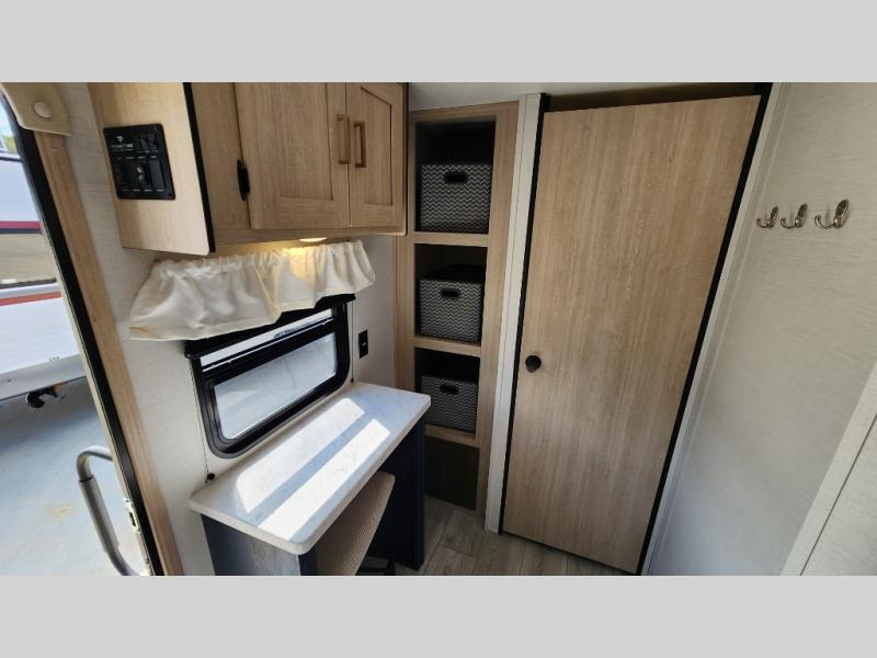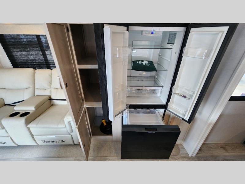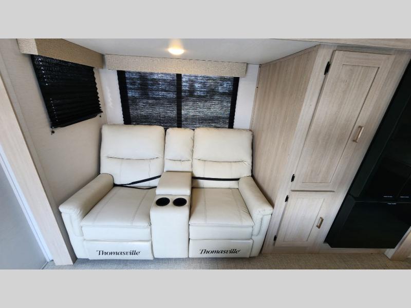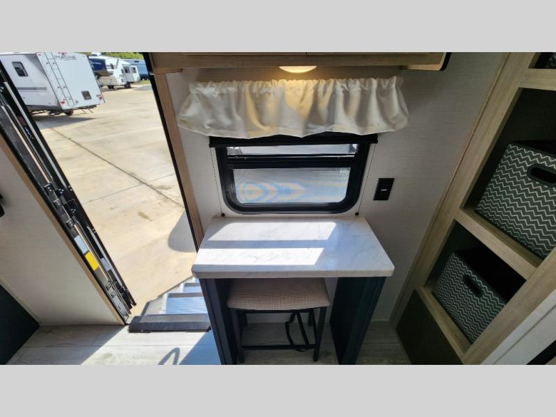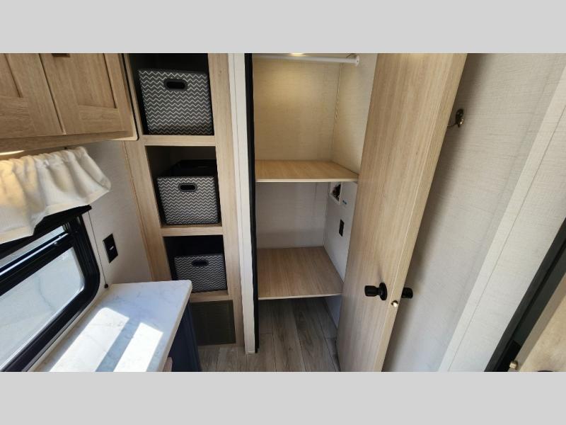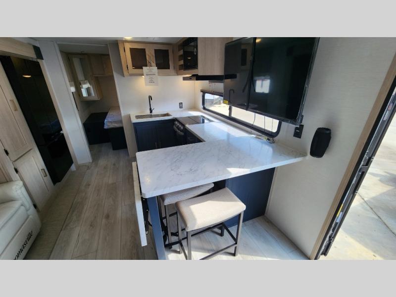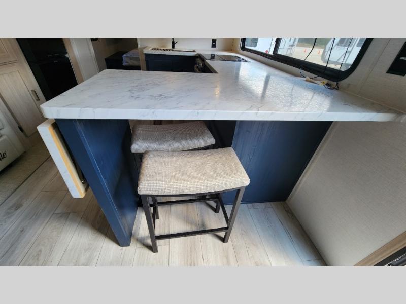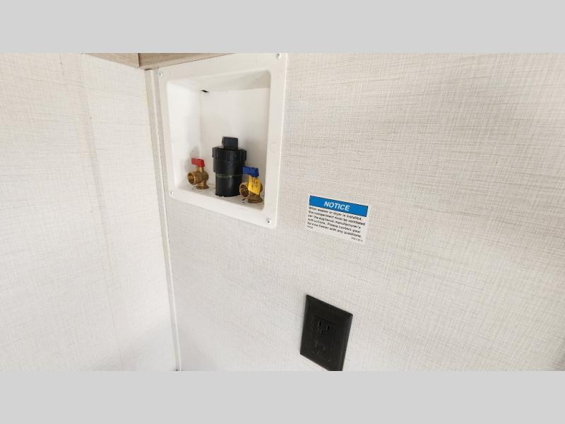 Head to your local state park in this spacious travel trailer! Once you arrive at the campground, you can grab a cold drink from the exterior refrigerator, then head inside to make lunch. An L-shaped counter with two chairs provides a place to enjoy your morning coffee at, or you may find yourselves on the theater seat within the large slide out. The French door refrigerator and pantry is also found here and can hold all your food for the week. You'll feel right at home in the front private bedroom that includes a queen bed, dual wardrobes, and an overhead cabinet for even more storage. This model also includes washer and dryer prep if you choose to add those appliances!