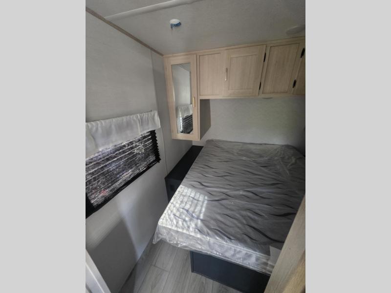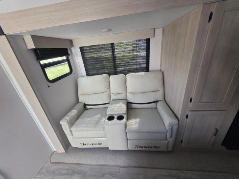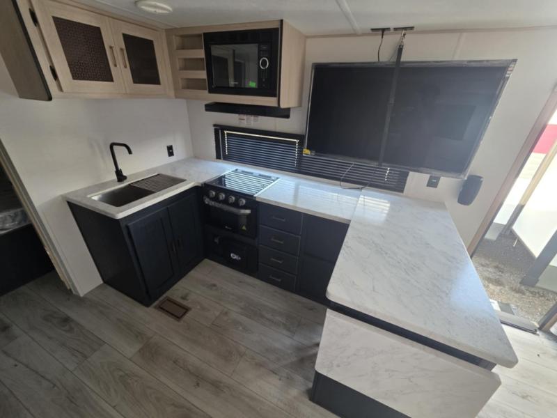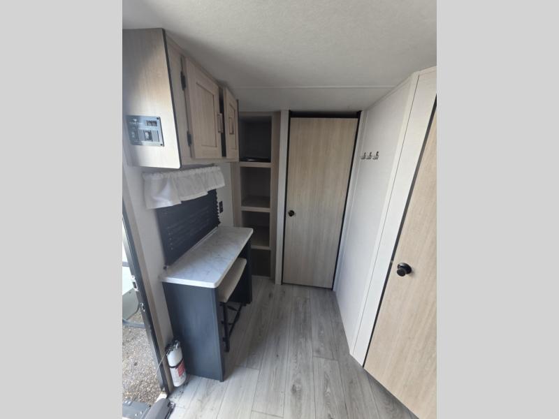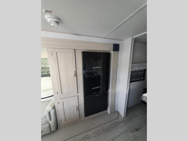 Head to your local state park in this spacious travel trailer! Once you arrive at the campground, you can grab a cold drink from the exterior refrigerator, then head inside to make lunch. An L-shaped counter with two chairs provides a place to enjoy your morning coffee at, or you may find yourselves on the theater seat within the large slide out. The French door refrigerator and pantry is also found here and can hold all your food for the week. You'll feel right at home in the front private bedroom that includes a queen bed, dual wardrobes, and an overhead cabinet for even more storage. This model also includes washer and dryer prep if you choose to add those appliances!