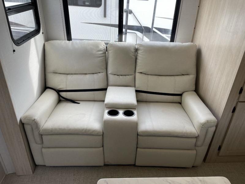 Head to your local state park in this spacious travel trailer! Once you arrive at the campground, you can grab a cold drink from the exterior refrigerator, then head inside to make lunch. An L-shaped counter with two chairs provides a place to enjoy your morning coffee at, or you may find yourselves on the theater seat within the large slide out. The French door refrigerator and pantry is also found here and can hold all your food for the week. You'll feel right at home in the front private bedroom that includes a queen bed, dual wardrobes, and an overhead cabinet for even more storage.