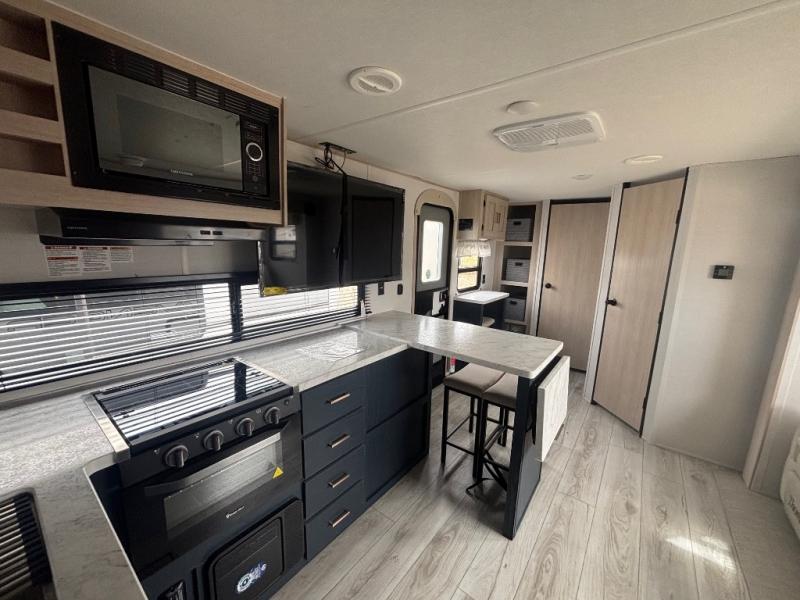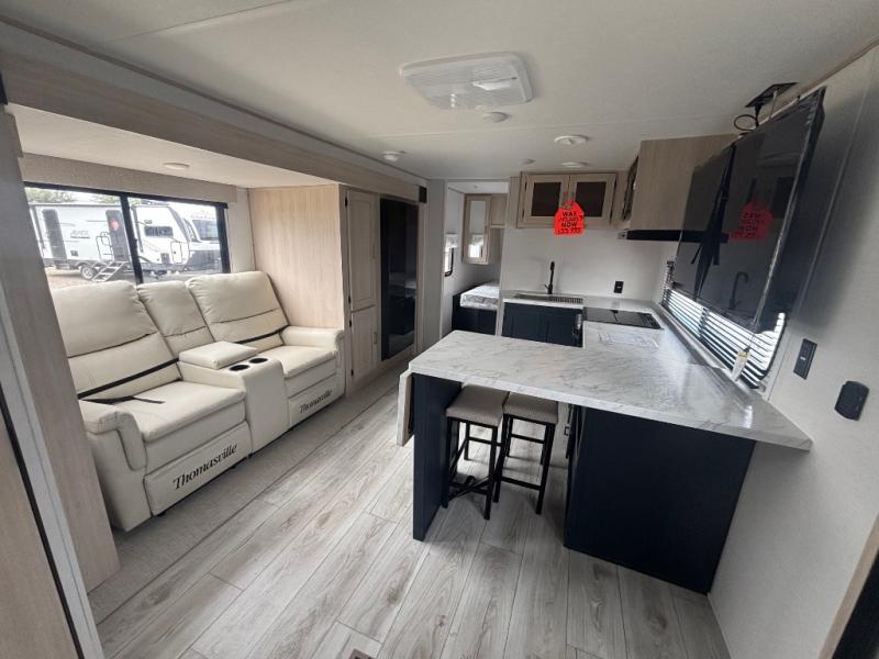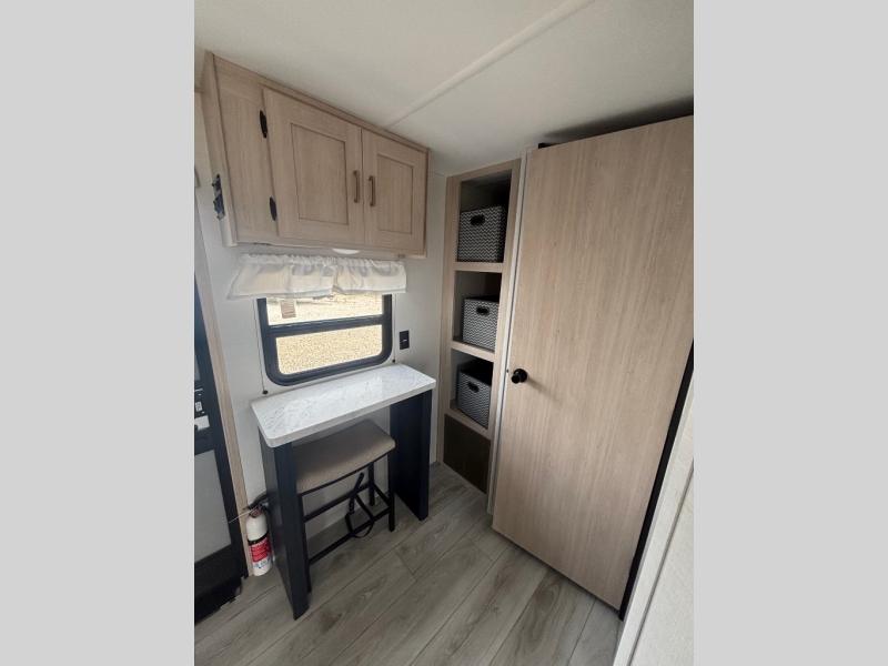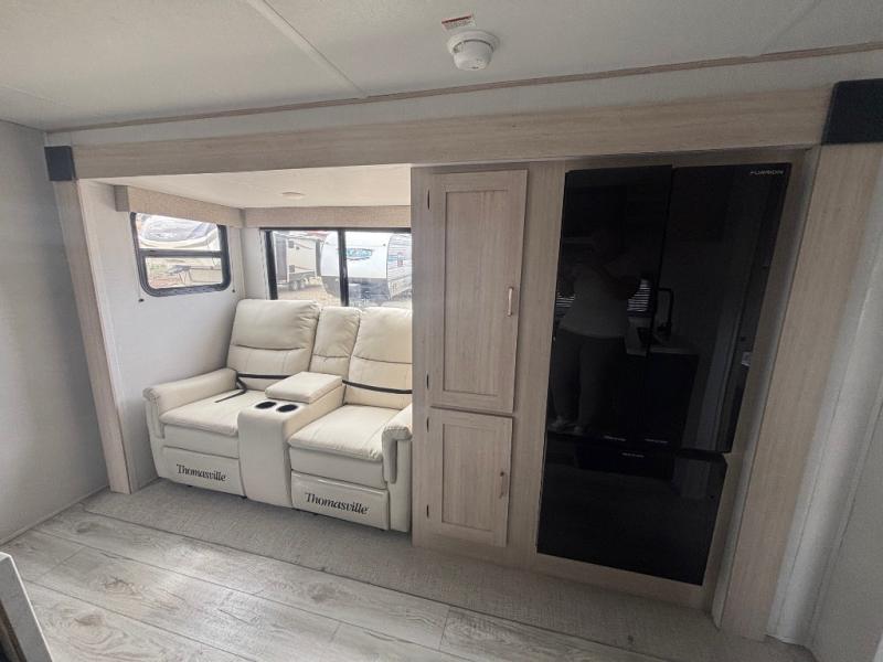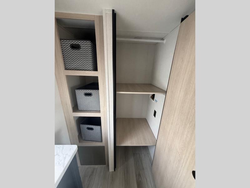 Head to your local state park in this spacious travel trailer! Once you arrive at the campground, you can grab a cold drink from the exterior refrigerator, then head inside to make lunch. An L-shaped counter with two chairs provides a place to enjoy your morning coffee at, or you may find yourselves on the theater seat within the large slide out. The French door refrigerator and pantry is also found here and can hold all your food for the week. You'll feel right at home in the front private bedroom that includes a queen bed, dual wardrobes, and an overhead cabinet for even more storage. This model also includes washer and dryer prep if you choose to add those appliances!