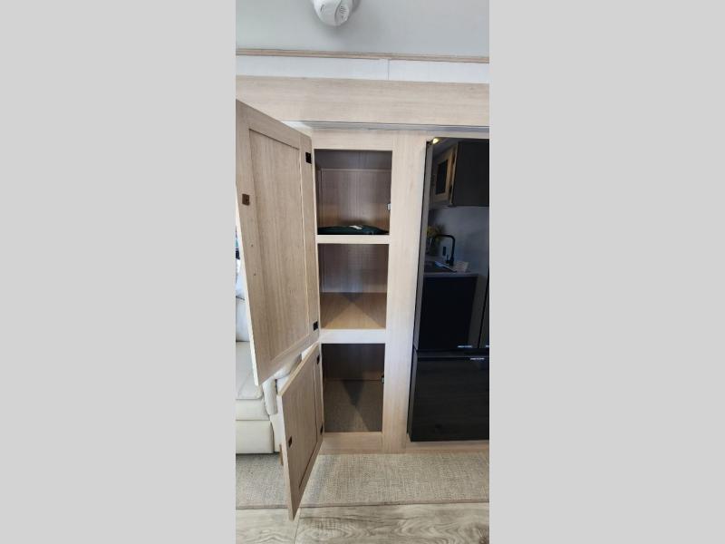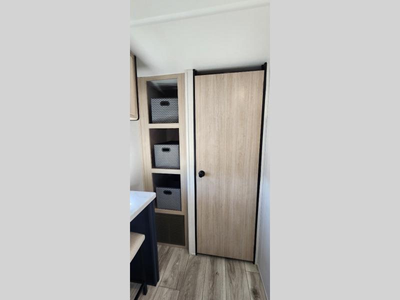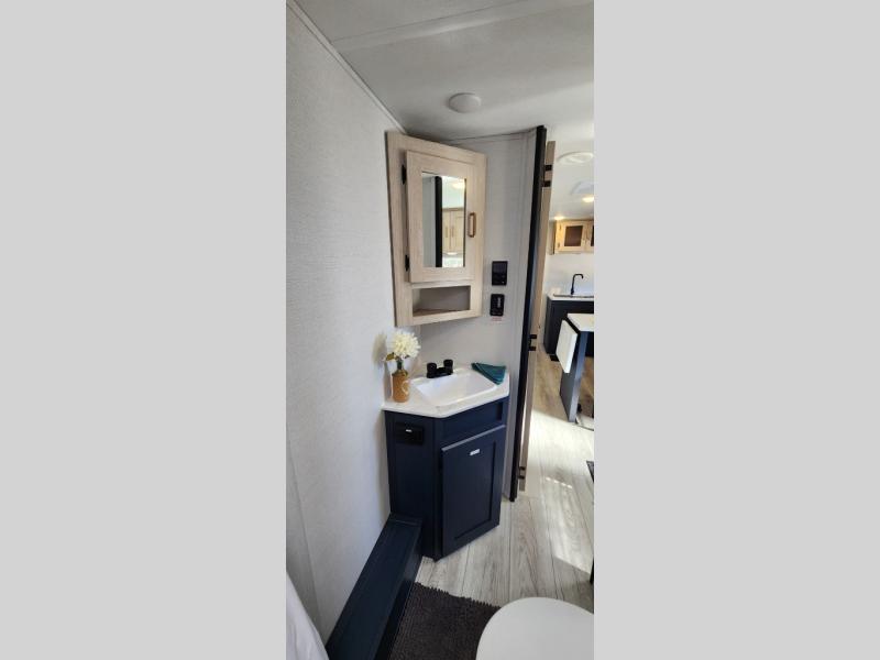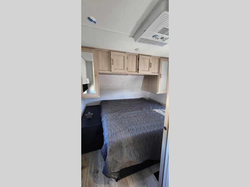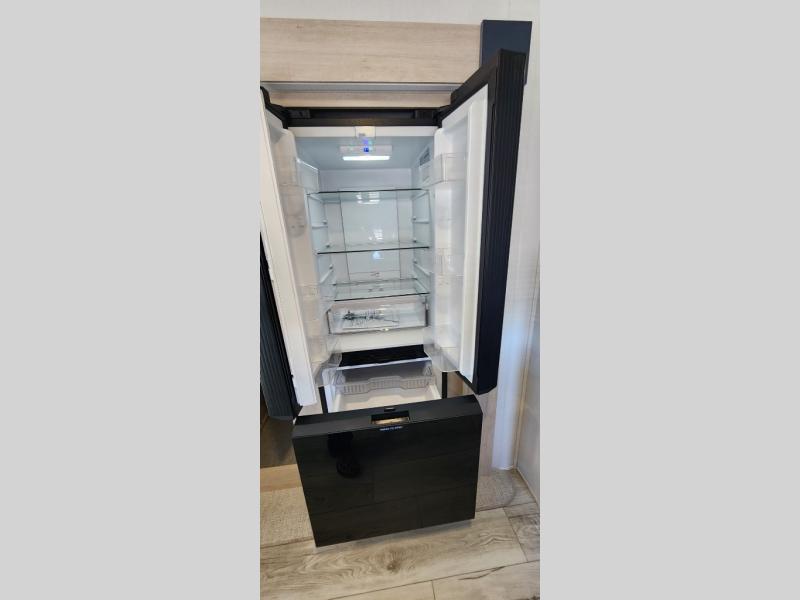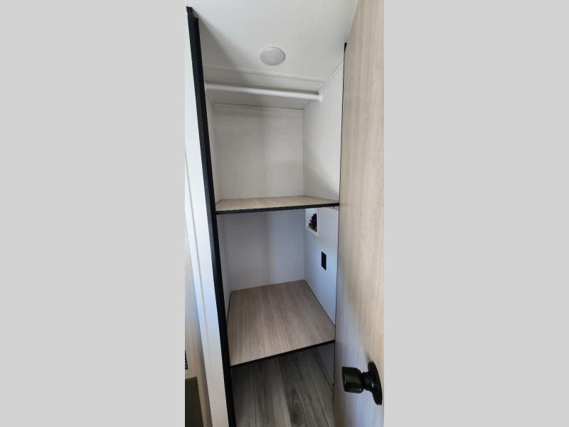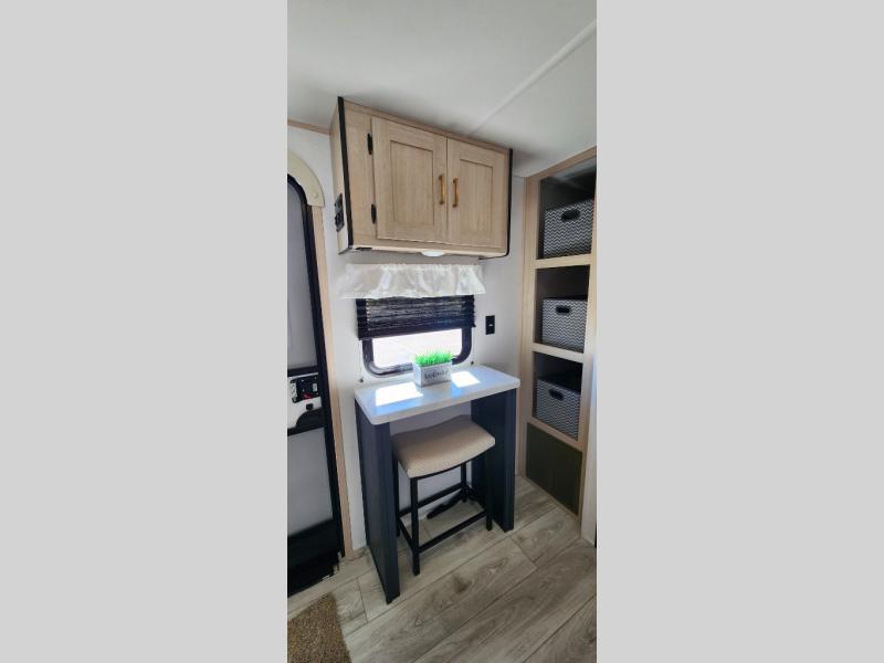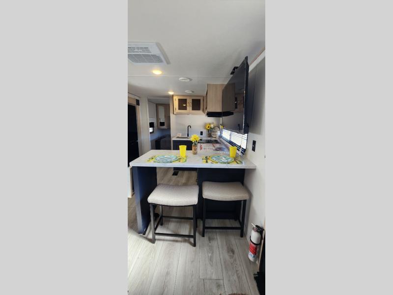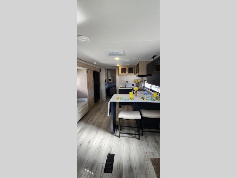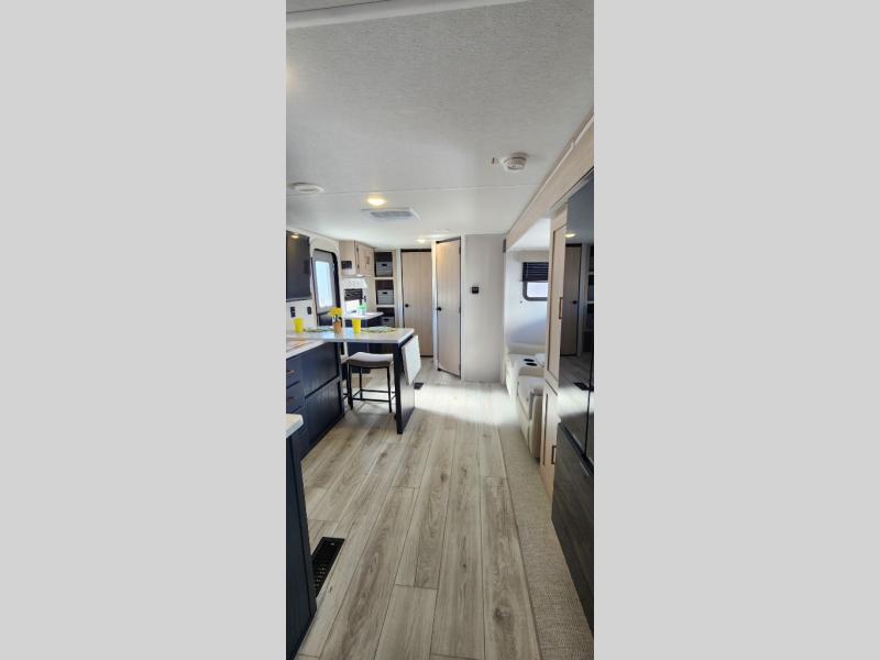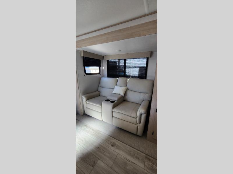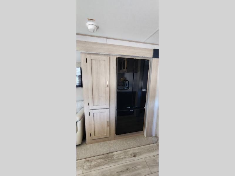 Head to your local state park in this spacious travel trailer! Once you arrive at the campground, you can grab a cold drink from the exterior refrigerator, then head inside to make lunch. An L-shaped counter with two chairs provides a place to enjoy your morning coffee at, or you may find yourselves on the theater seat within the large slide out. The French door refrigerator and pantry is also found here and can hold all your food for the week. You'll feel right at home in the front private bedroom that includes a queen bed, dual wardrobes, and an overhead cabinet for even more storage. This model also includes washer and dryer prep if you choose to add those appliances!