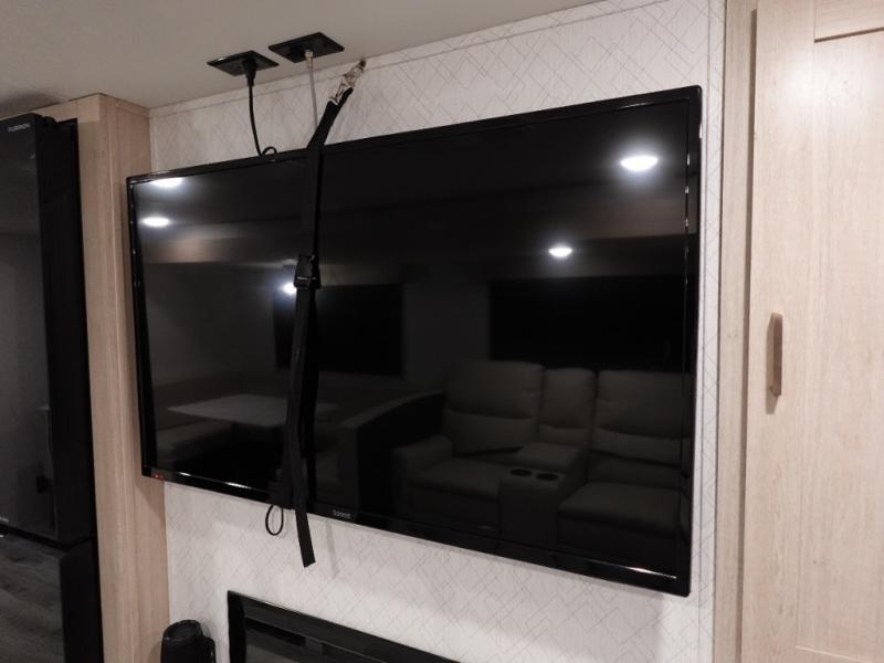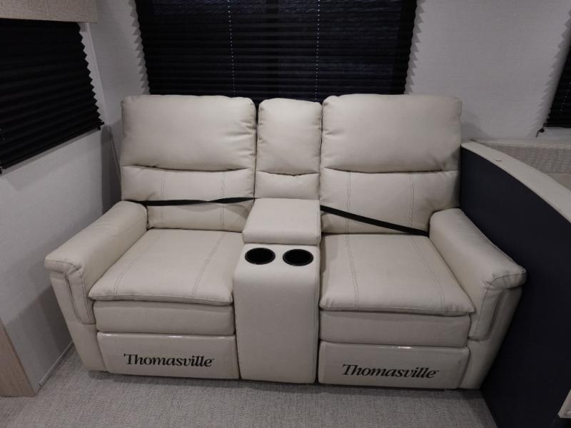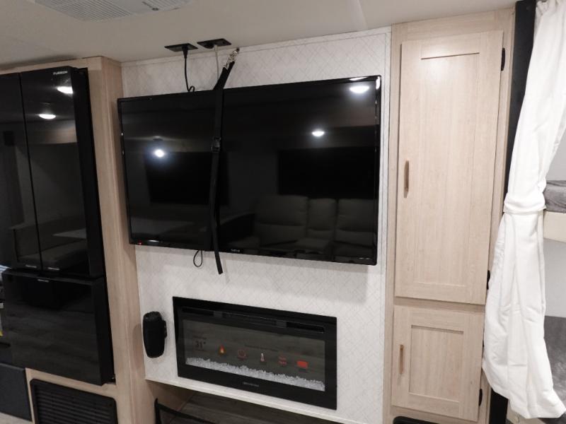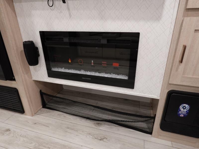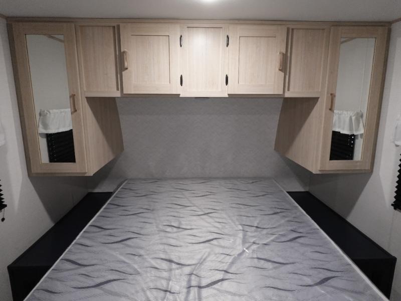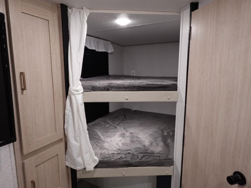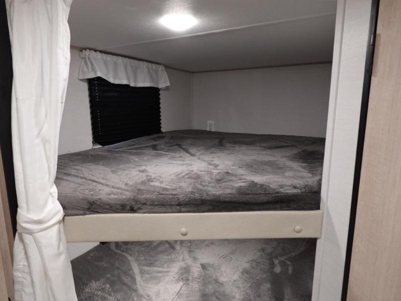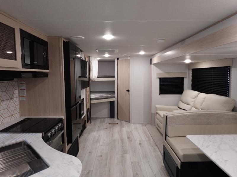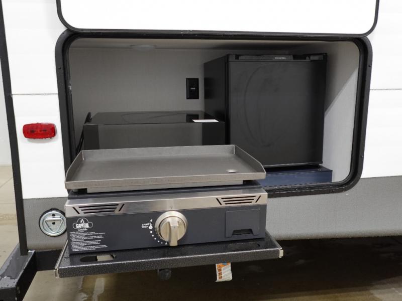 You and your family will love this trailer with all the sleeping accommodations, the privacy and the outdoor features! There are double-size bunks next to the full bathroom, a private front bedroom with space savings sliding doors, a walk-around queen bed, dual wardrobes, and overhead cabinets for storage. The large slide offers more floor space while cooking with full amenities including a pantry, and the theater seat and U-shaped dinette offer plenty of seating. This model also includes an outside kitchen that provides the cook another choice when feeding everyone, plus the 16' power awning gives you protection from the elements.