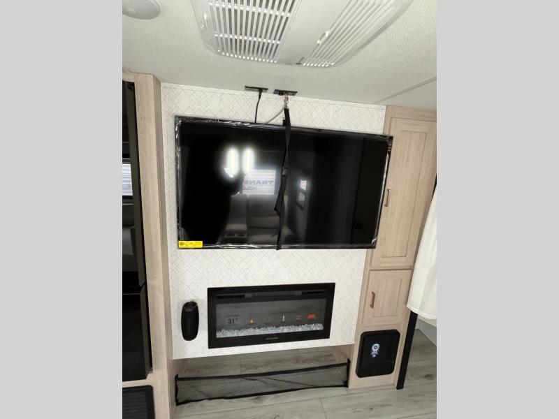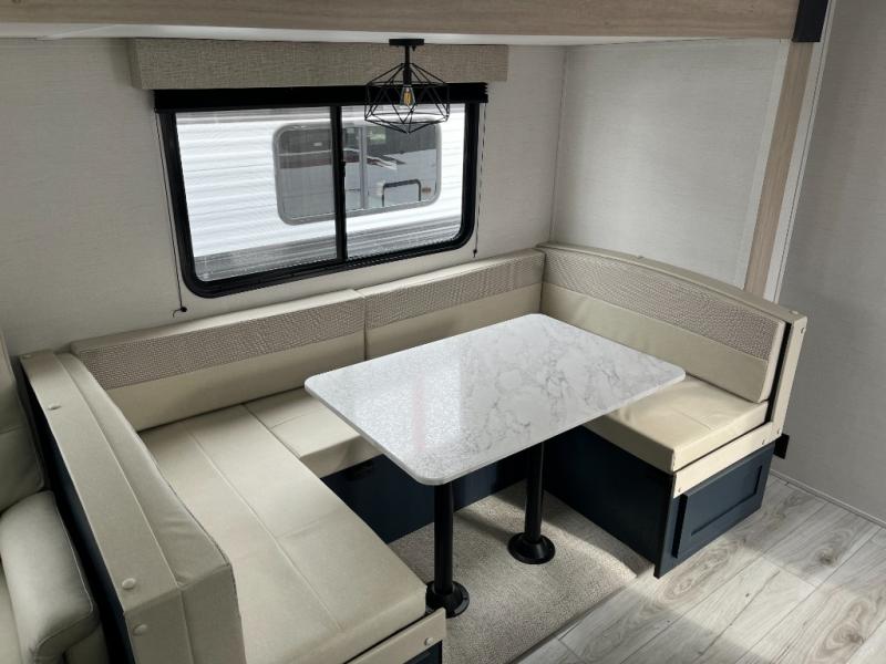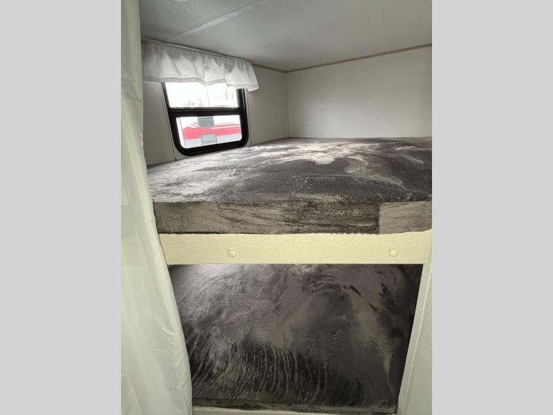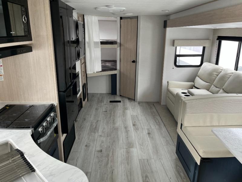 You and your family will love this trailer with all the sleeping accommodations, the privacy and the outdoor features! There are double-size bunks next to the full bathroom, a private front bedroom with space savings sliding doors, a walk-around queen bed, dual wardrobes, and overhead cabinets for storage. The large slide offers more floor space while cooking with full amenities including a pantry, and the theater seat and U-shaped dinette offer plenty of seating. This model also includes an outside kitchen that provides the cook another choice when feeding everyone, plus the 16' power awning gives you protection from the elements.